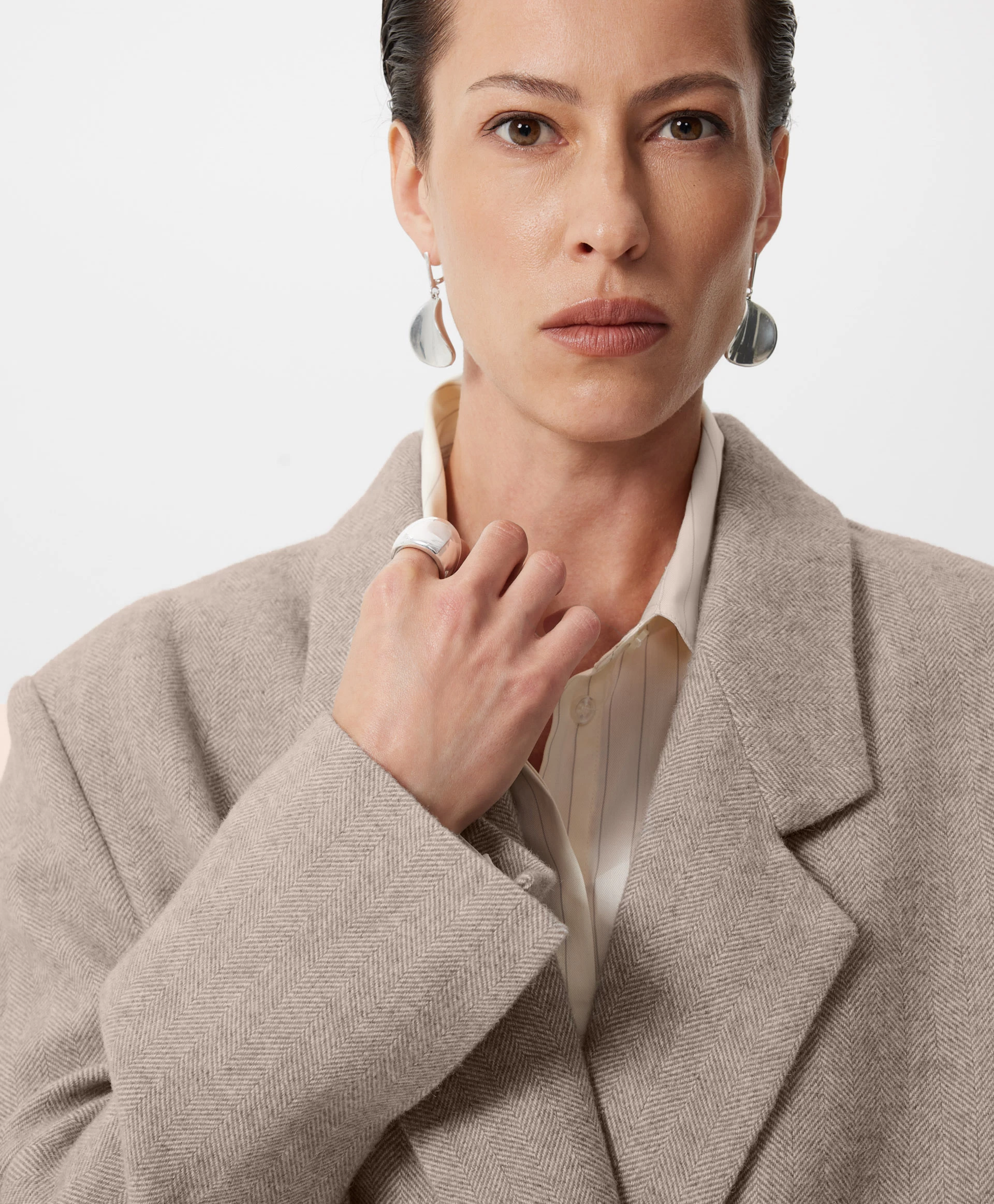 Пиджак всегда выглядит стильно, благородно, аристократично. Он идёт каждой модной и уверенной в себе женщине, подчёркивая деловые ноты в её имидже. Пиджак выполнен из полушерстяного костюмного твида. Рисунок «елочка» и английский воротник, вызывающие стойкие ассоциации с благородством, изысканностью, сдержанным стилем с ноткой консерватизма, делают его воплощением элегантности и шика. Пиджак прямой свободной формы с небольшим увеличением объёма для современной посадки может стать как частью брючного костюма для бизнес-леди, так и прекрасным завершением комплекта с повреждёнными джинсами, кожаными брюками, укороченной юбкой. В любом случае он сделает образ уравновешенным, стильным, завершённым, дорогим по восприятию, подчеркнув осознанный выбор классической вещи в натуральной экологичной гамме, не зависящей от модных трендов. Пиджак застёгивается на пуговицы, имеет шлицу на спинке и шлицы на рукавах, вертикальные карманы в швах. Шелковистая подкладка.