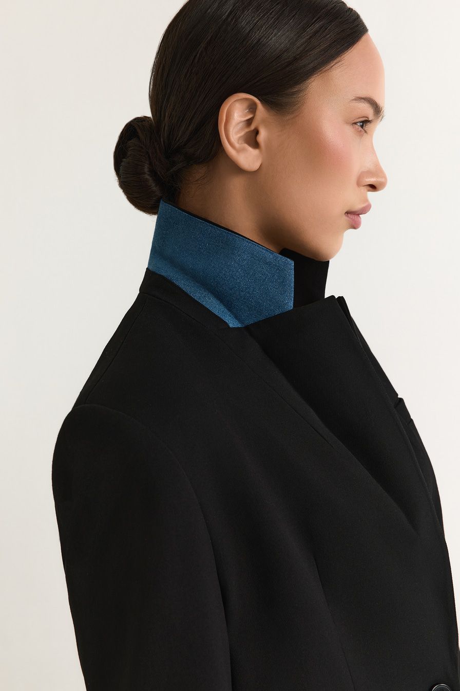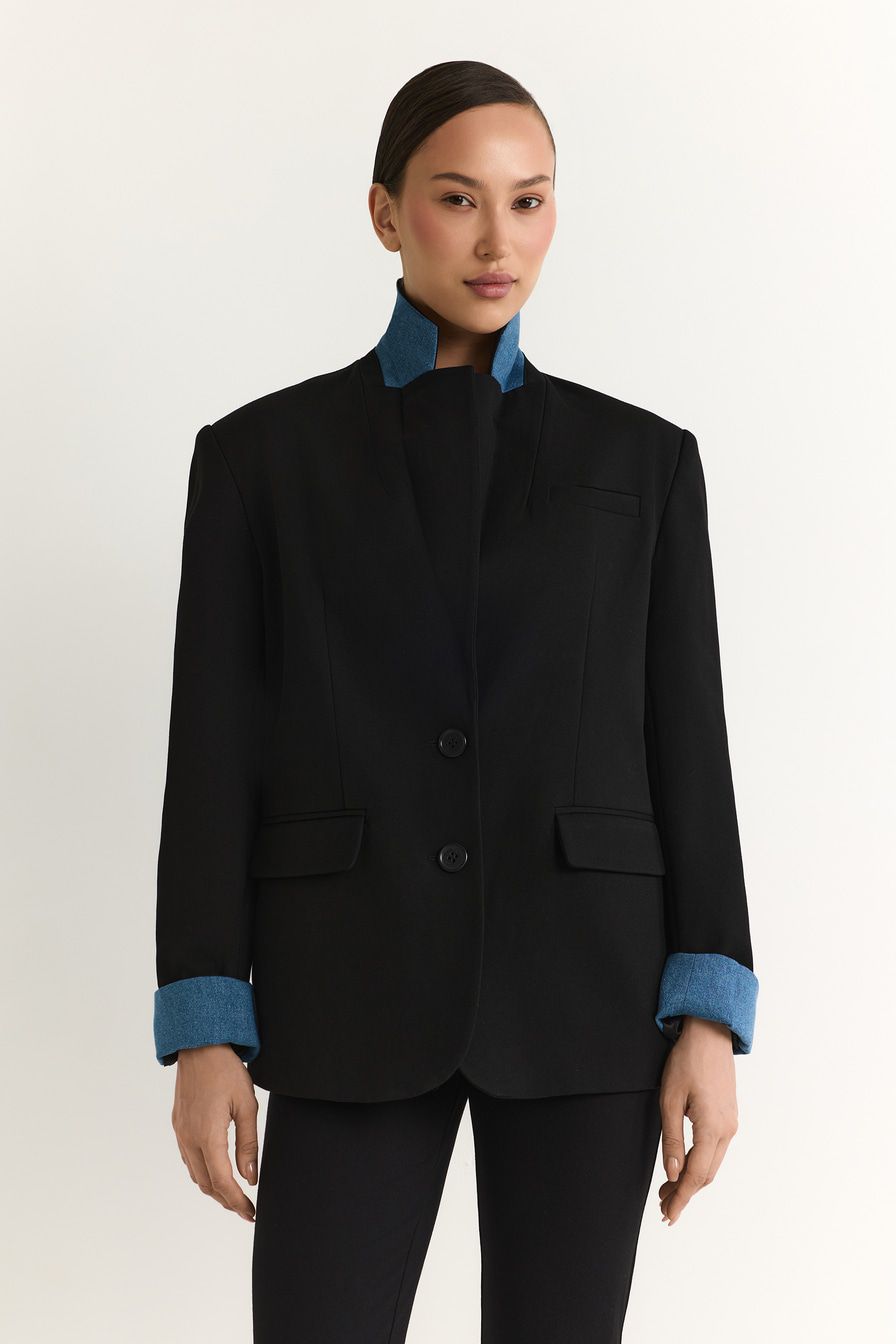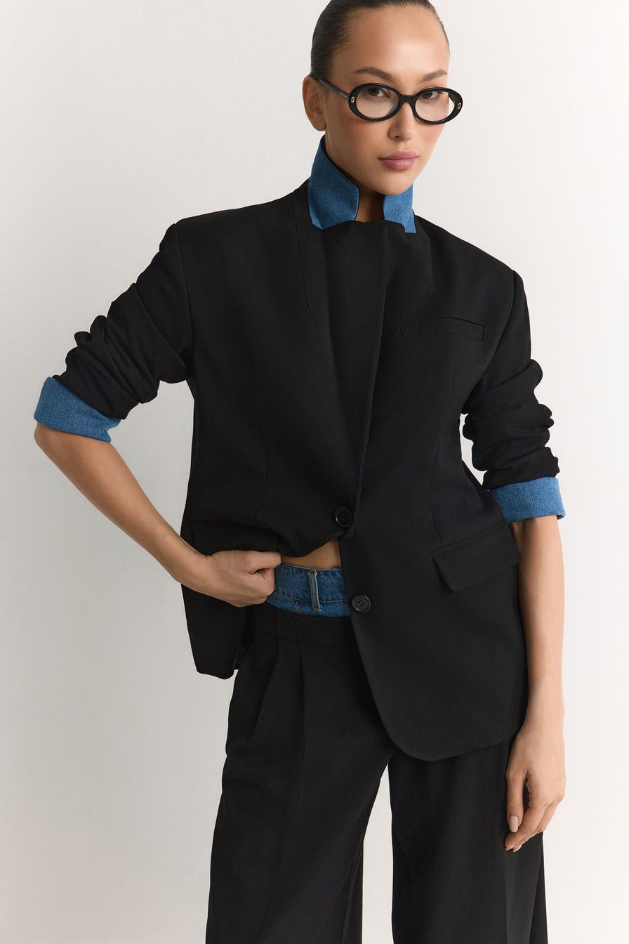 Однобортный черный жакет из смесовой вискозы – модель прямого кроя. Жакет дополнен вставками из денима.