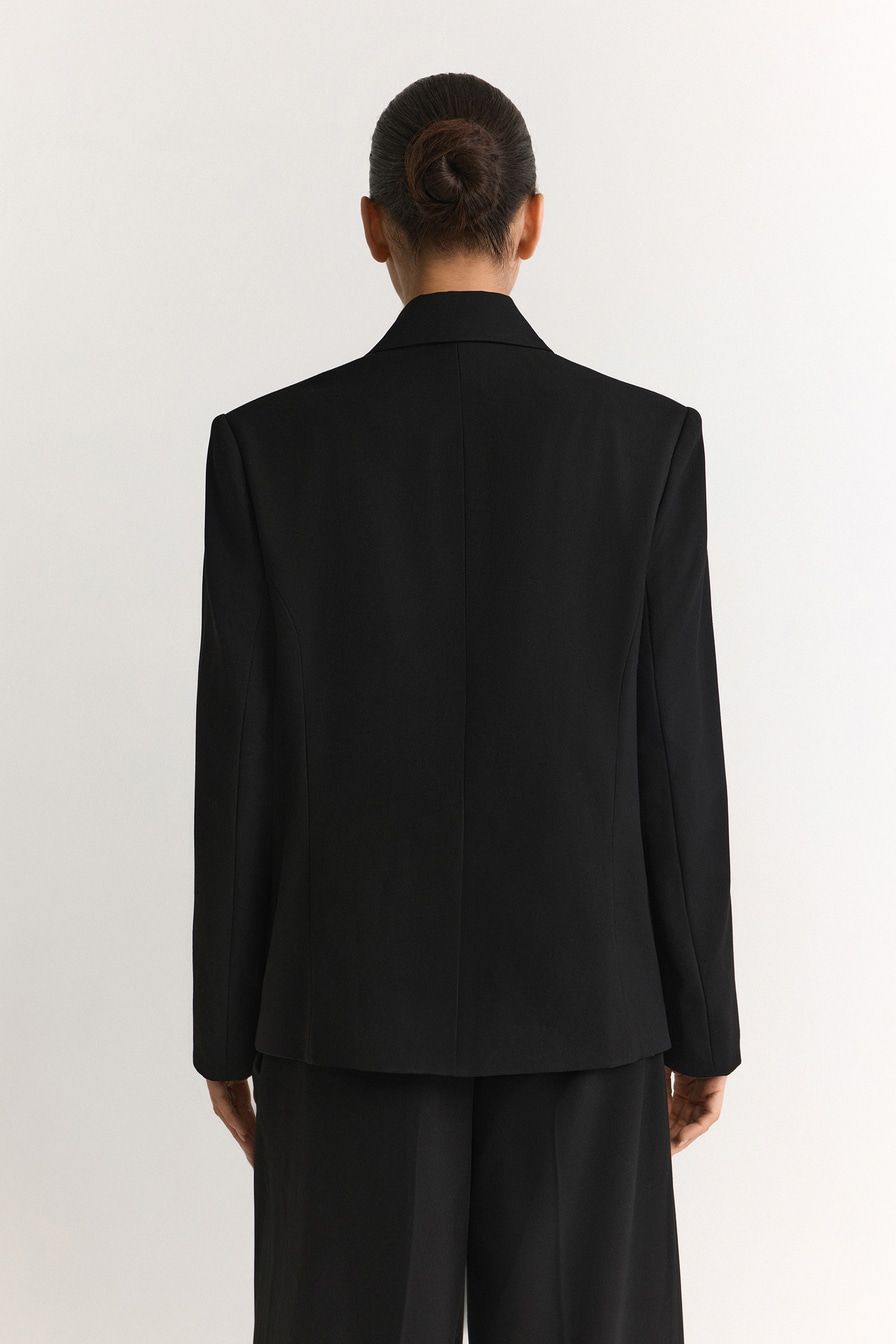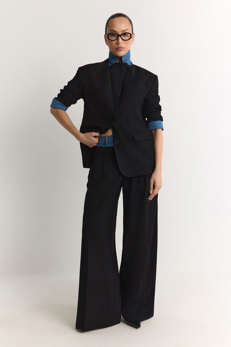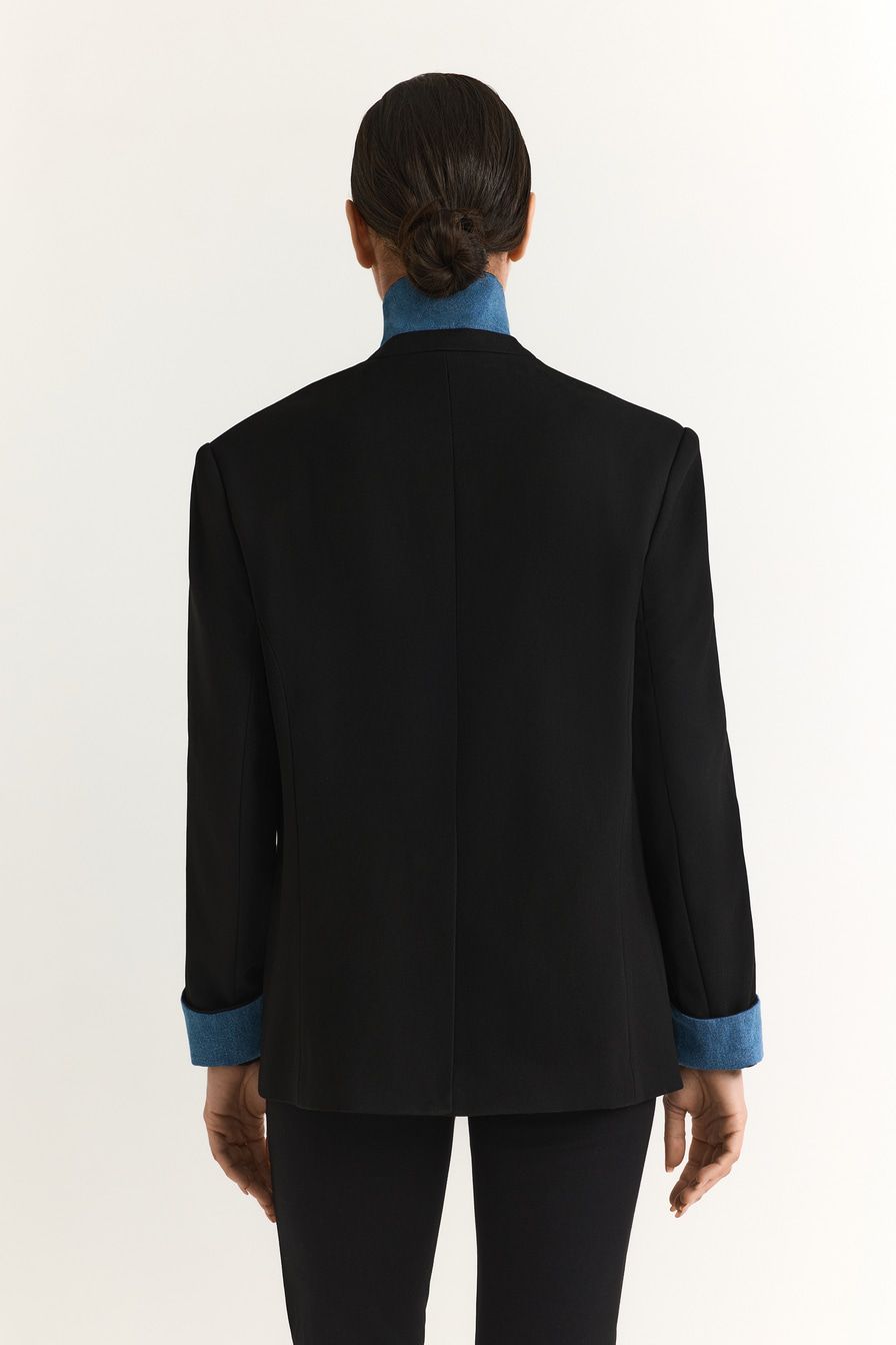 Однобортный черный жакет из смесовой вискозы – модель прямого кроя. Жакет дополнен вставками из денима.
