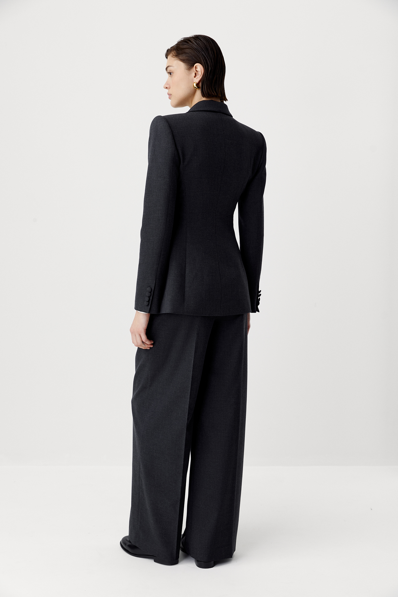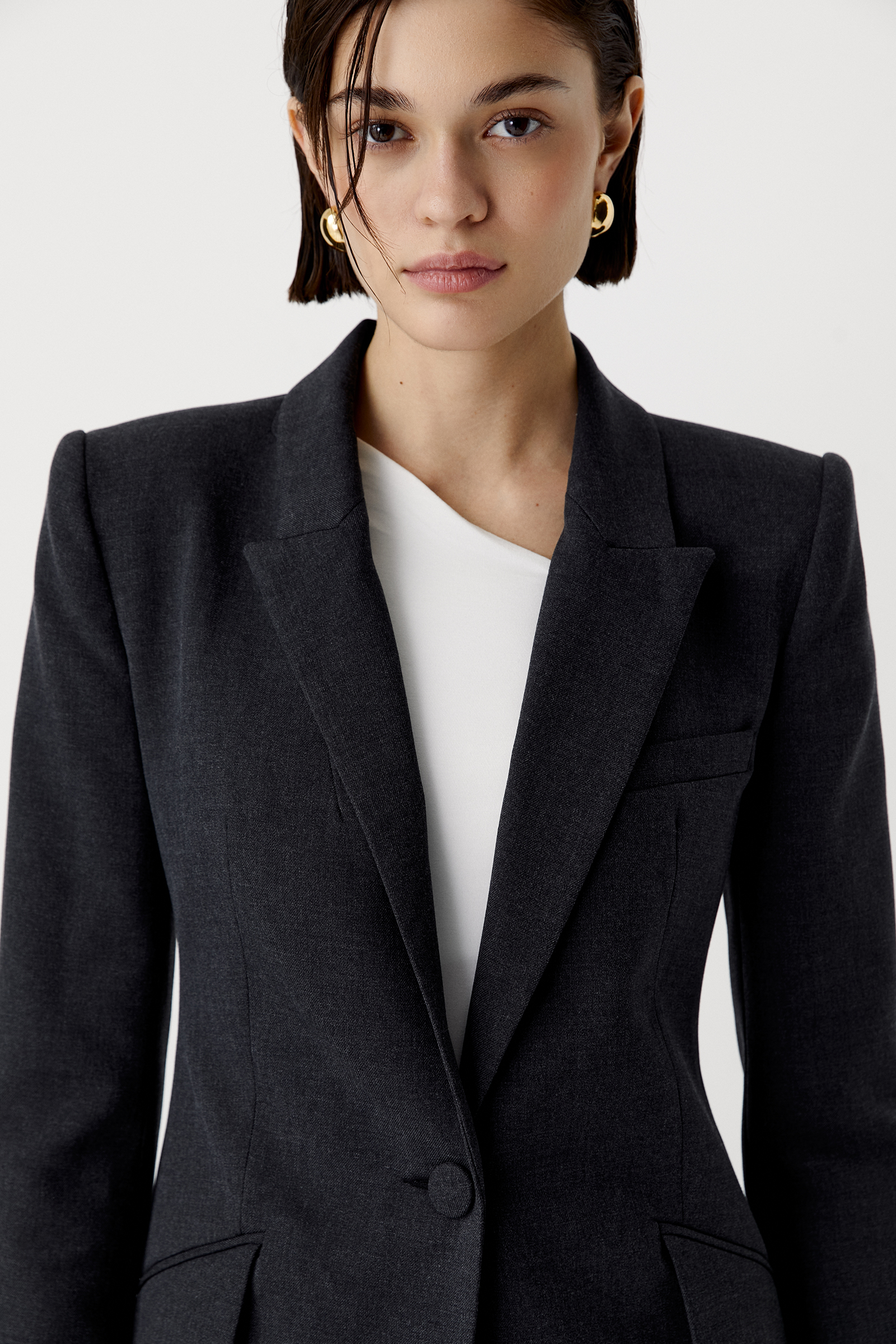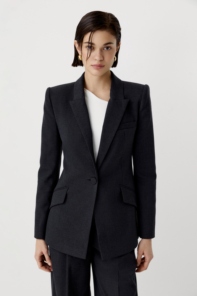 Пиджак из костюмной ткани в приталенного кроя, который формирует идеальный силуэт песочные часы. Строгие, классические линии лацканов смягчает силуэт и особенные карманы, расположенные по косой. Рукава дополнены пуговицами с тканью в тон изделия.