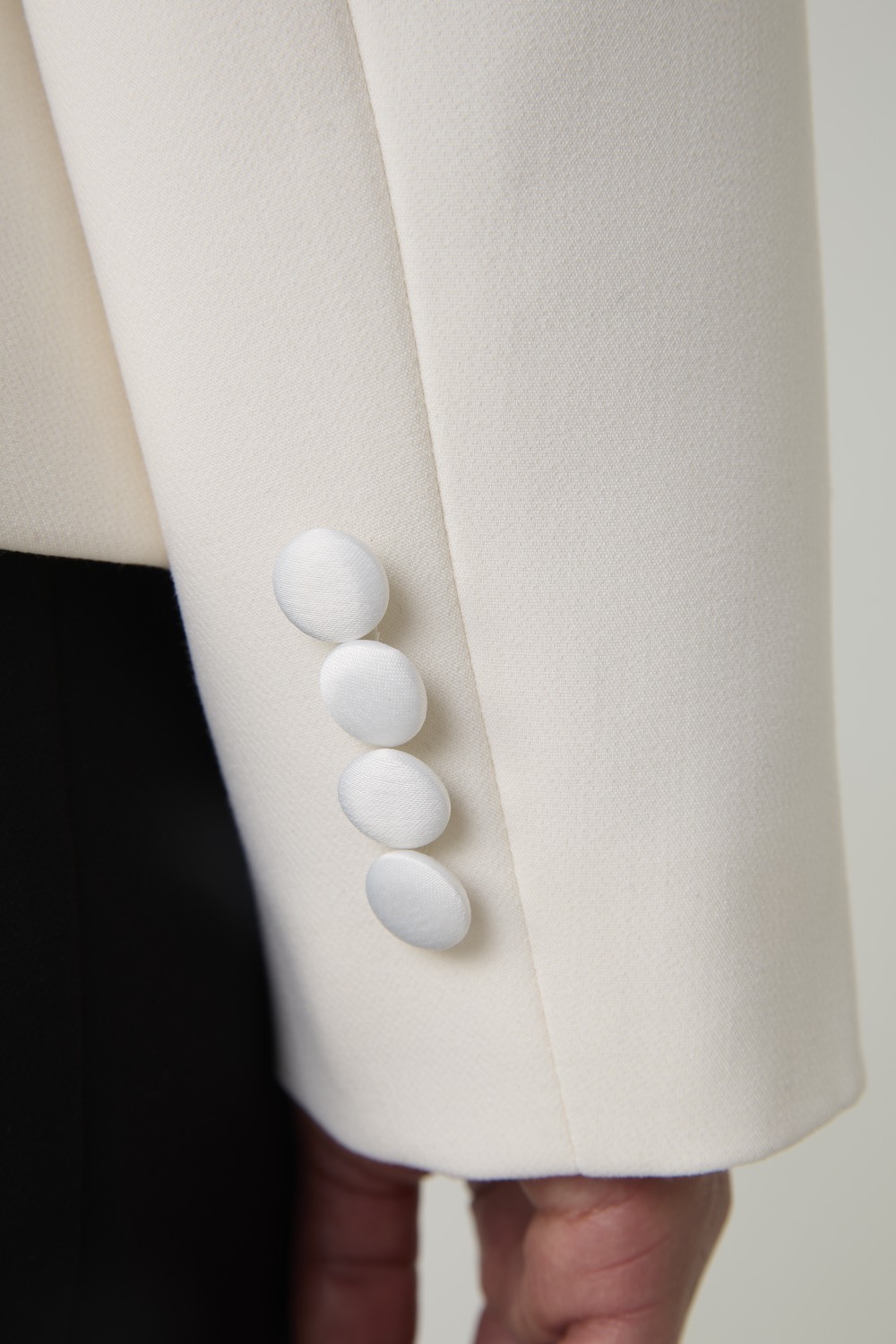 Женский жакет выполнен из плотной ткани молочного оттенка с гладкой текстурой. Модель имеет классический однобортный крой, застегивается на две пуговицы, выполненные в тон ткани. Рукава прямые, длиной до запястья, с декоративными пуговицами на манжетах. Передняя часть украшена двумя функциональными прорезными карманами с кантом из атласной ткани, подчеркивающим стиль изделия.