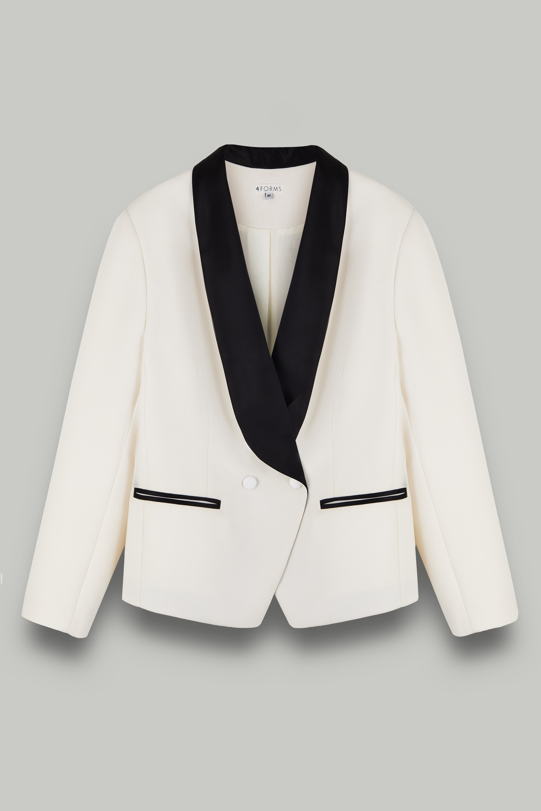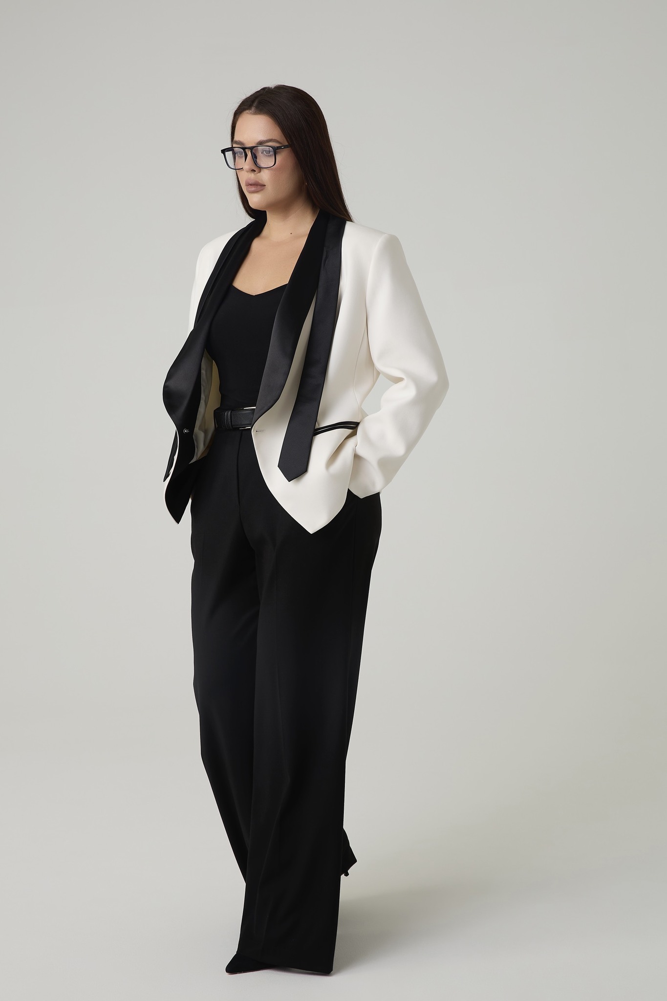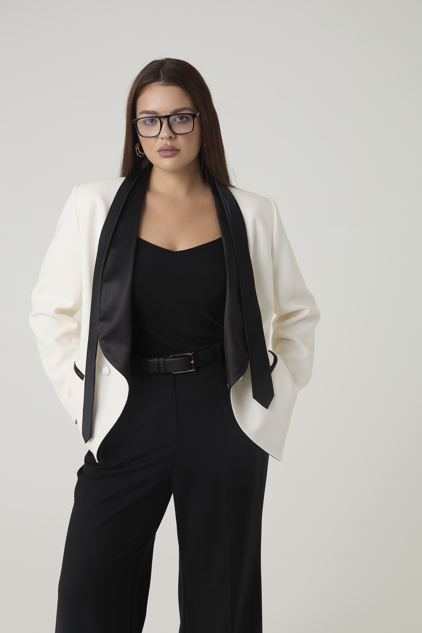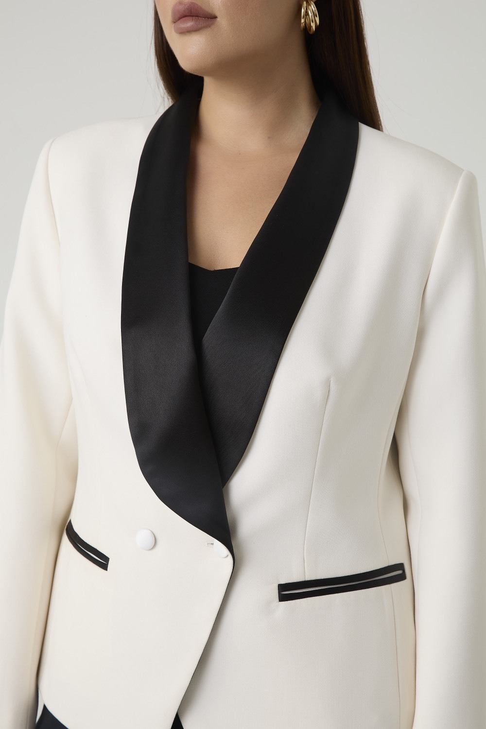 - контрастный атласный воротник-шалька и отделка карманов придают образу изысканность и оригинальность