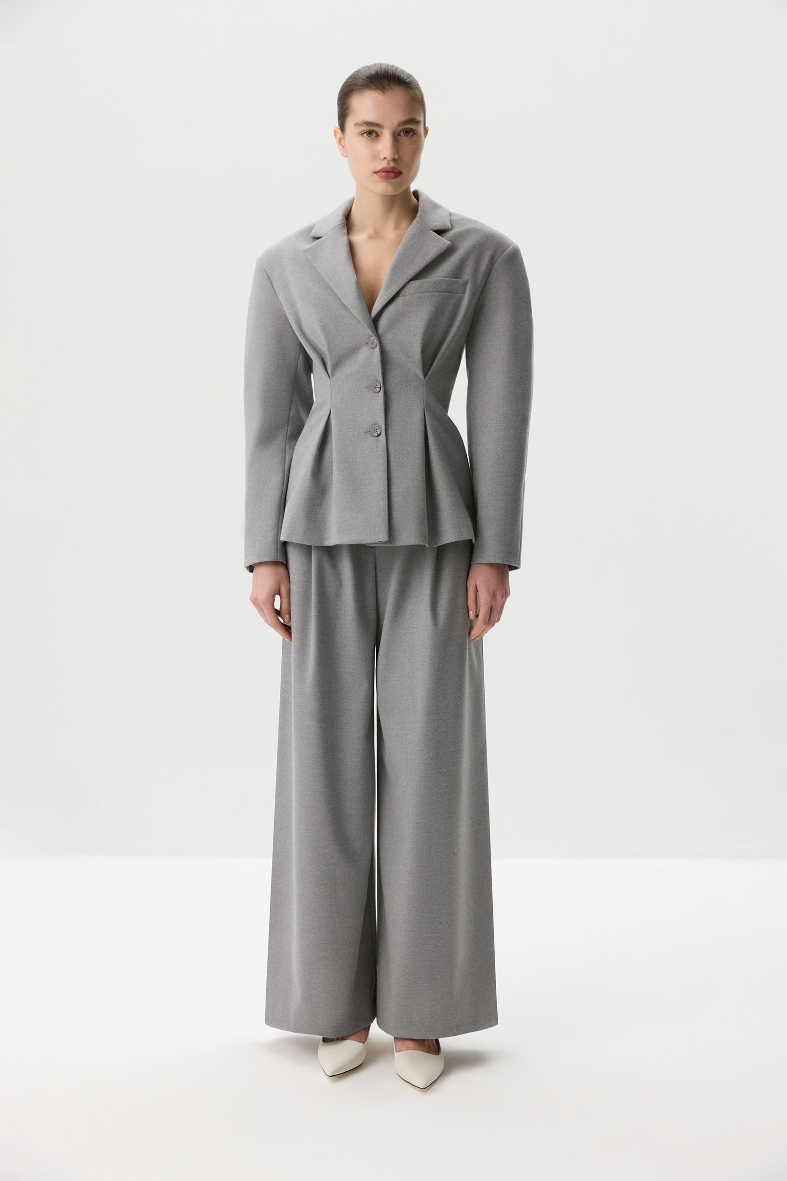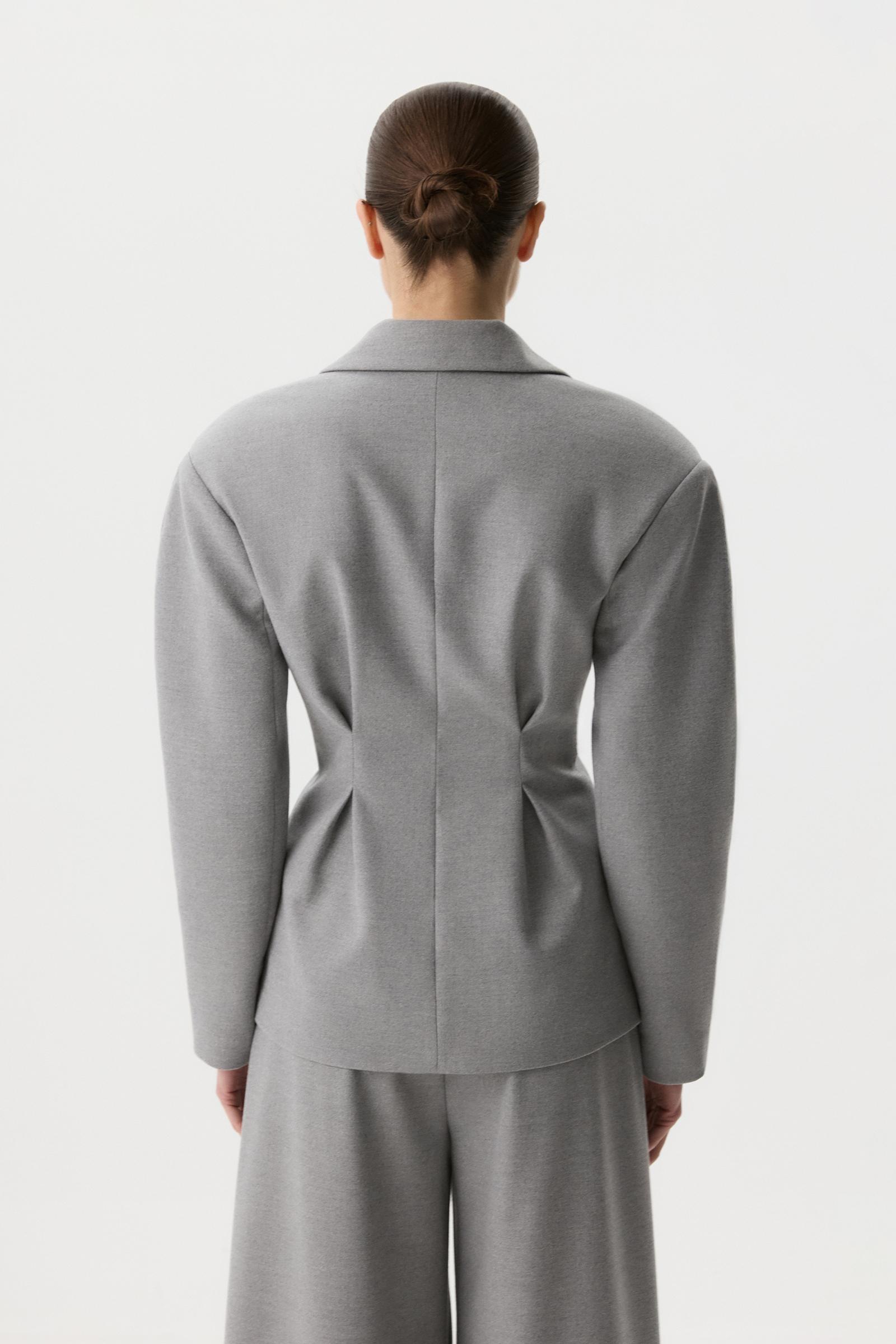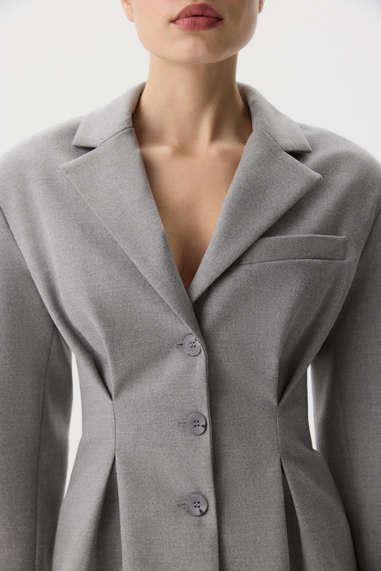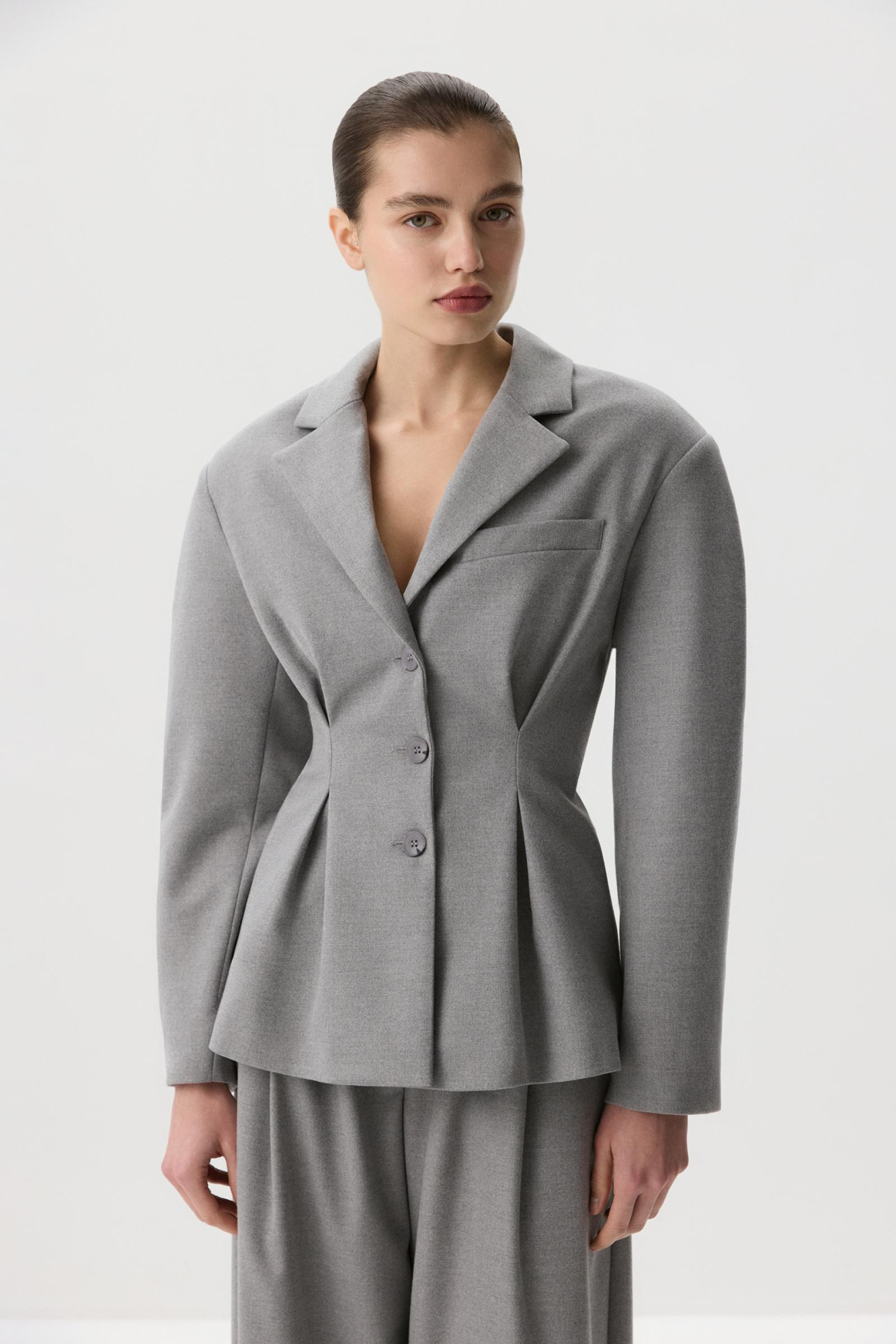 Жакет с защипами на талии из плотной, но мягкой костюмной ткани. Конструкция жакета подчеркивает линию талии за счет вертикальных защипов, создавая элегантную приталенную форму, при этом сохраняет комфорт и свободу движения. Удлиненная линия плеча формирует мягкий округлый силуэт. Однобортная застежка на три пуговицы. На полочке декоративная листочка.
