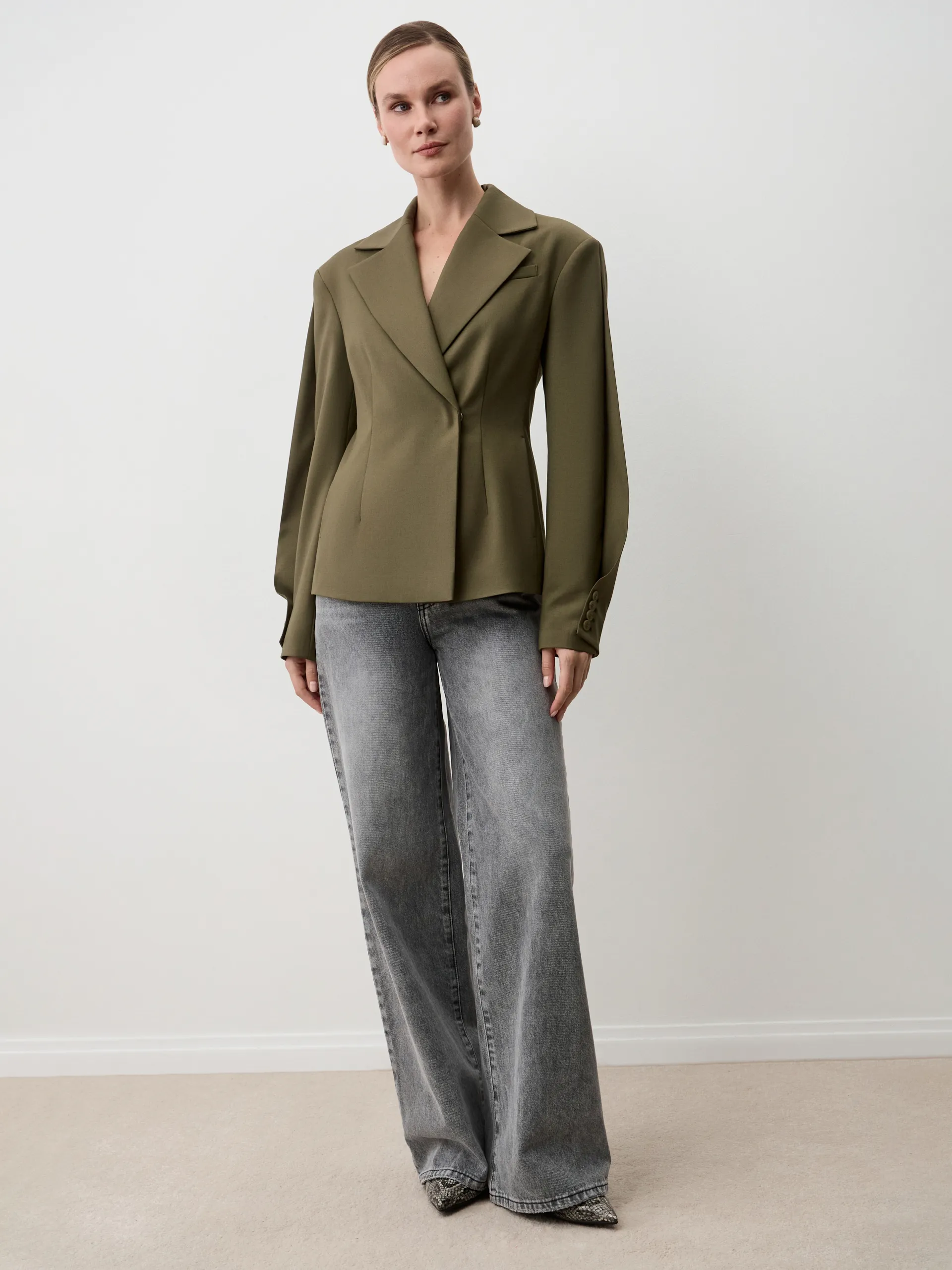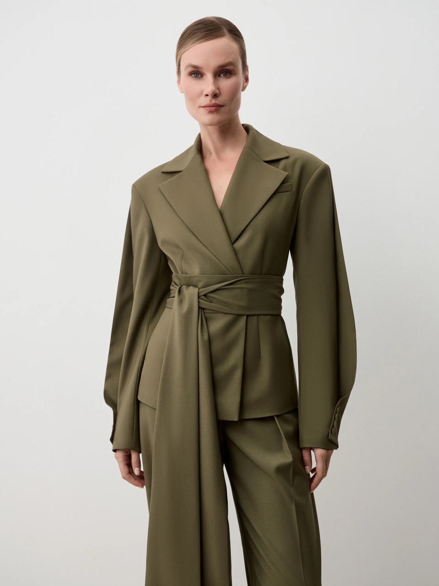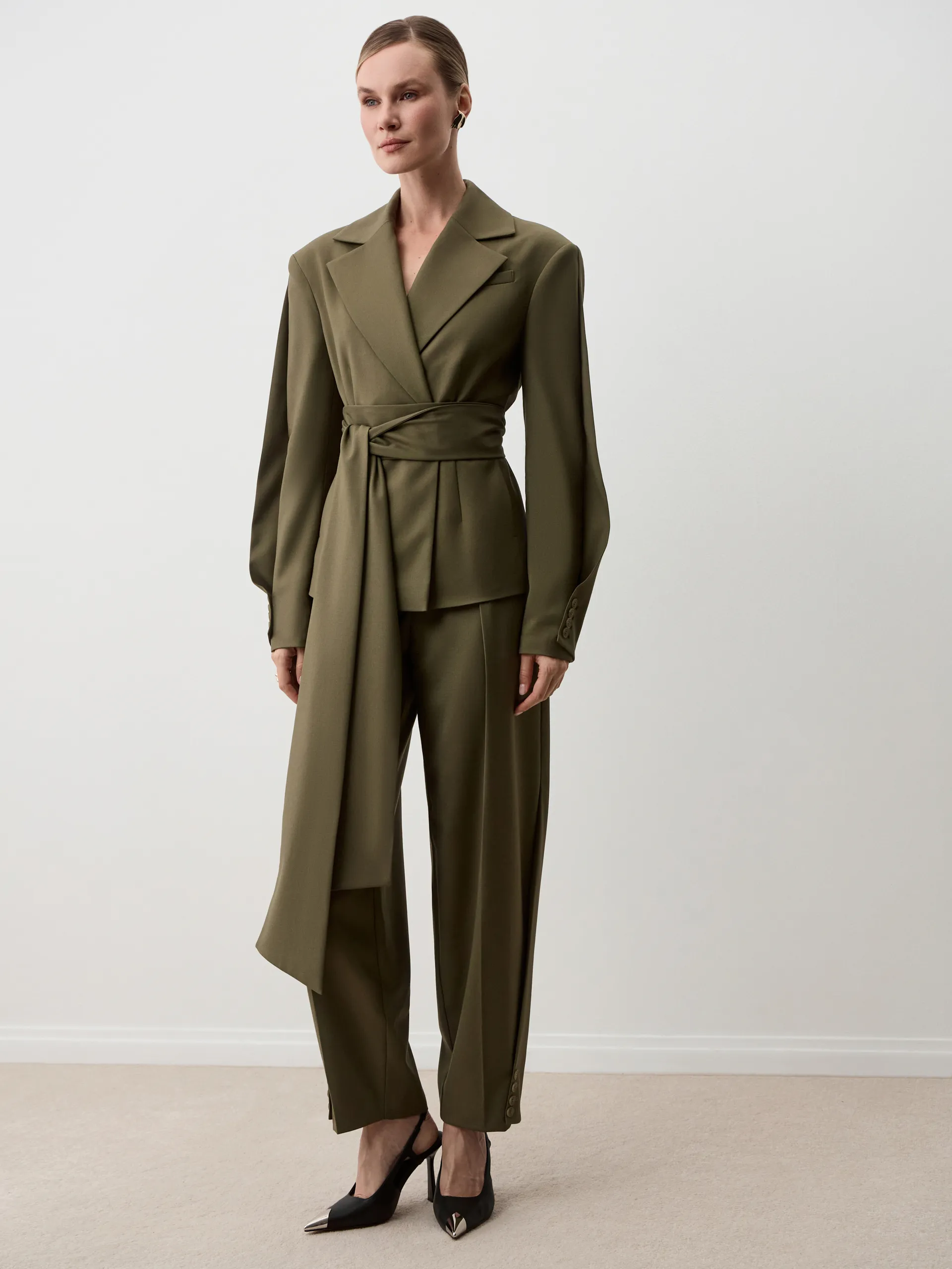 Жакет Moana. Приталенный жакет в оттенке хаки с акцентными рукавами, формирующими модный О-силуэт за счёт складки. Такой крой подчёркивает фигуру и одновременно добавляет объём и выразительность образу. В комплекте идёт широкий пояс, который фиксирует талию и становится дополнительным акцентом. Универсальная модель подойдёт как для деловых сочетаний, так и для повседневных образов. Рекомендуем носить с классическими брюками или юбкой-карандаш для офиса, а также с денимом или платьями для более расслабленного стиля. С обувью на каблуке или ботильонами образ будет выглядеть завершённо и элегантно.