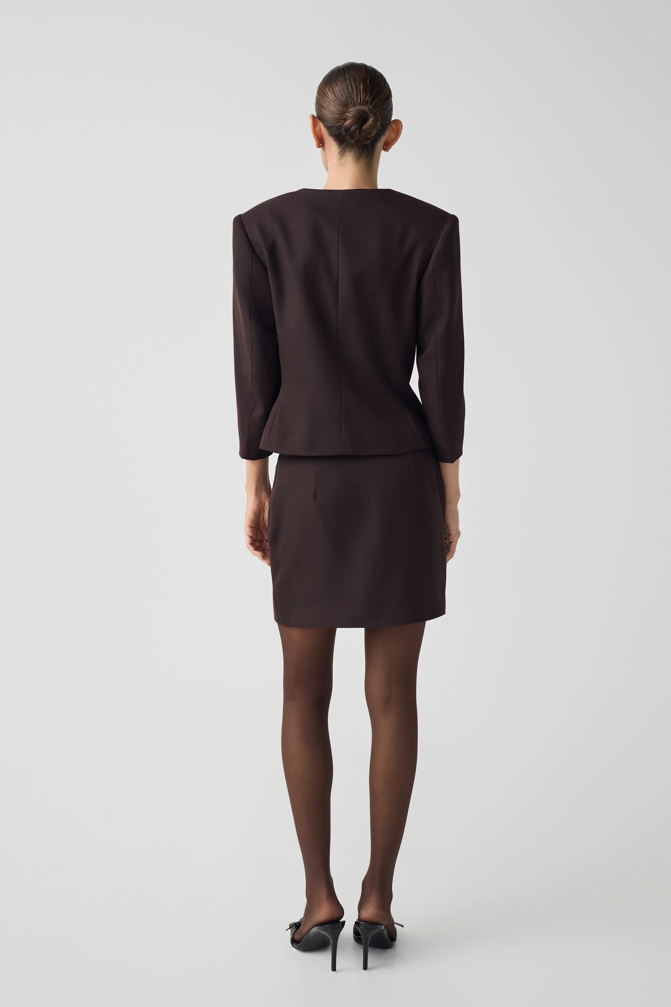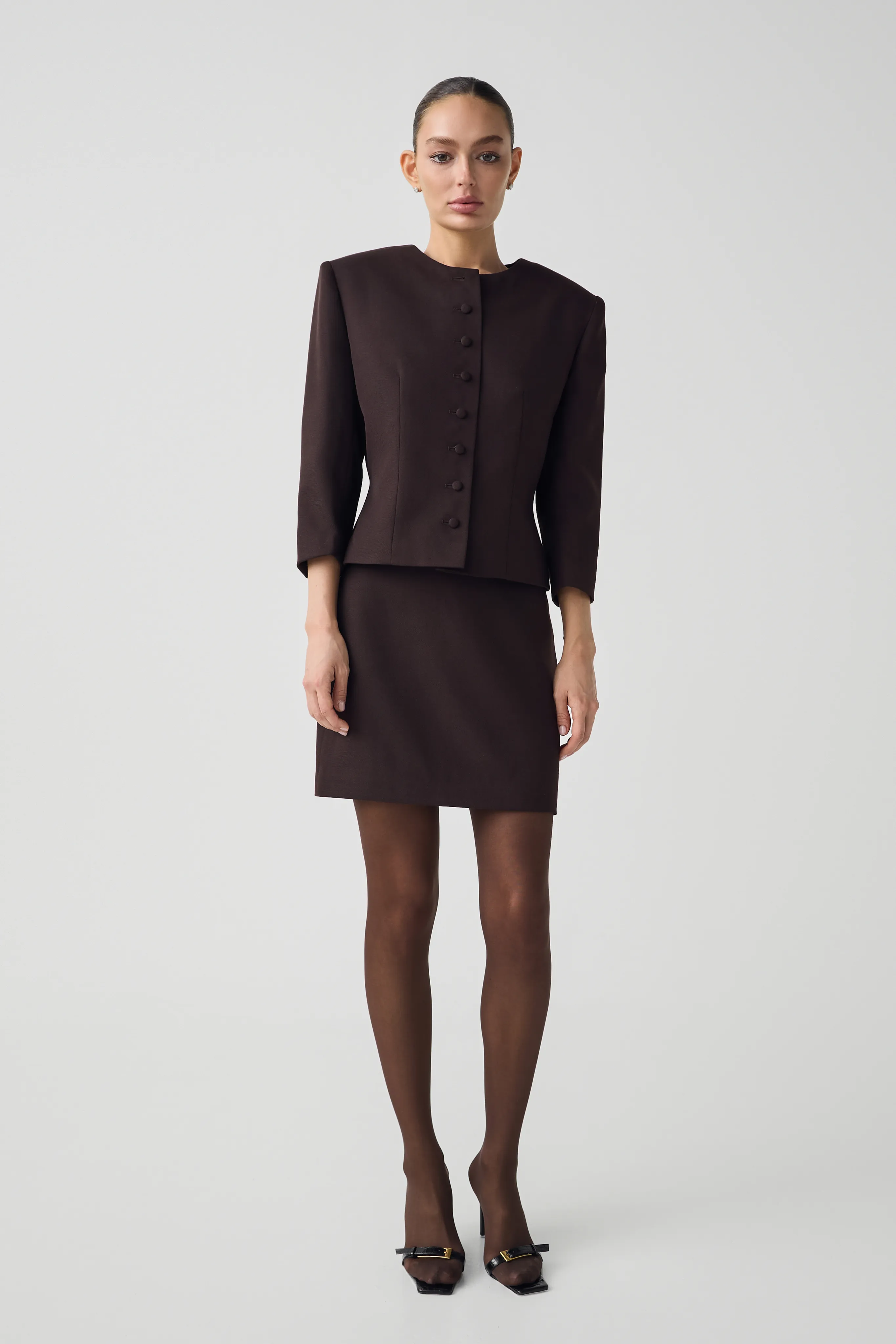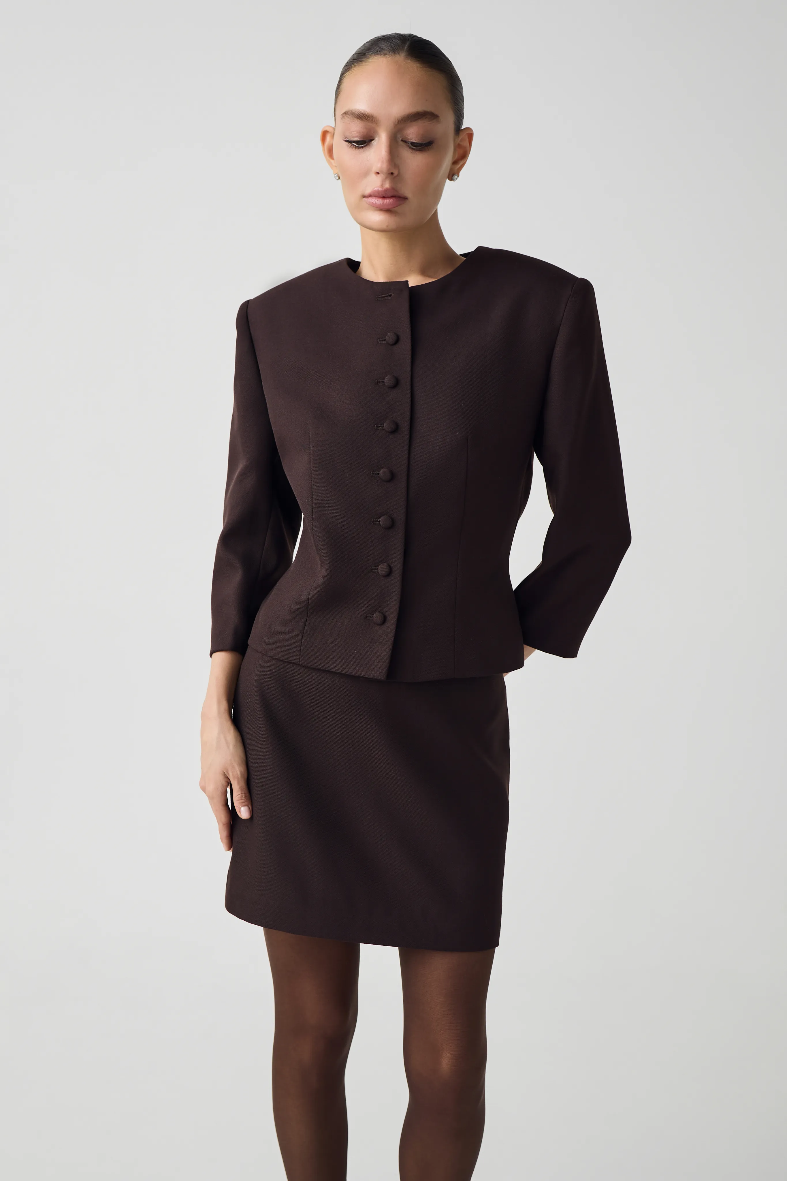 Каждая деталь жакета четко выверенная: приталенный силуэт, рукав три четверти, плечевой шов точно на месте и линия горловины подчеркивает форму подбородка.