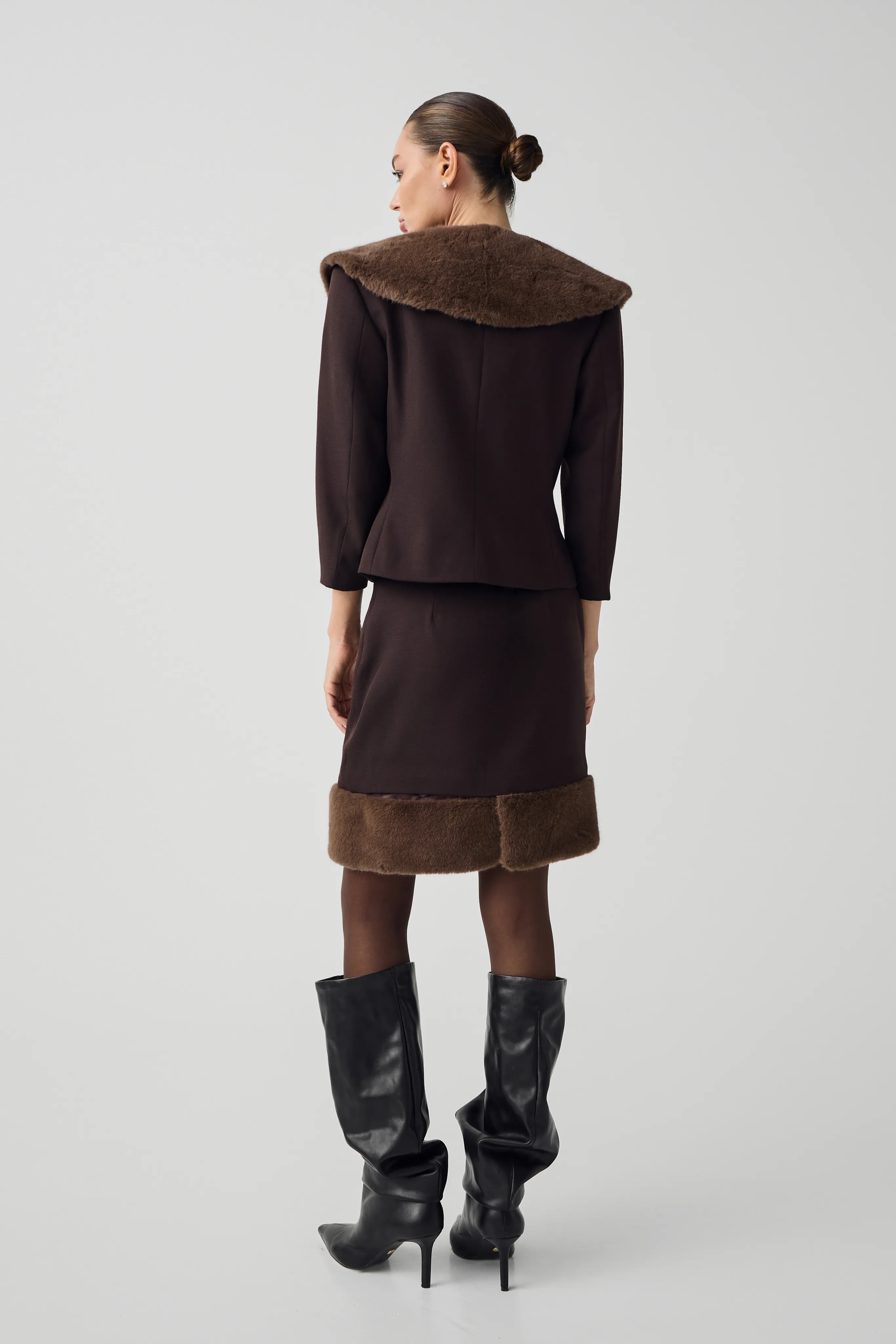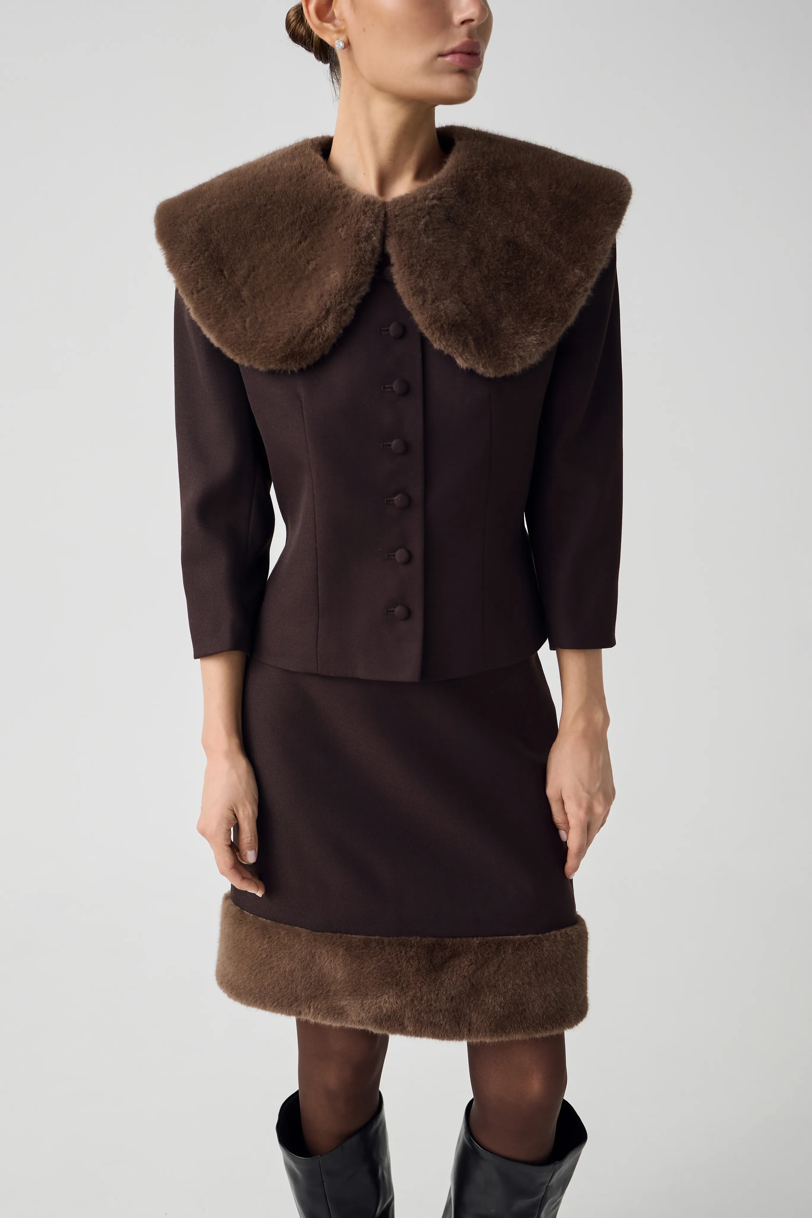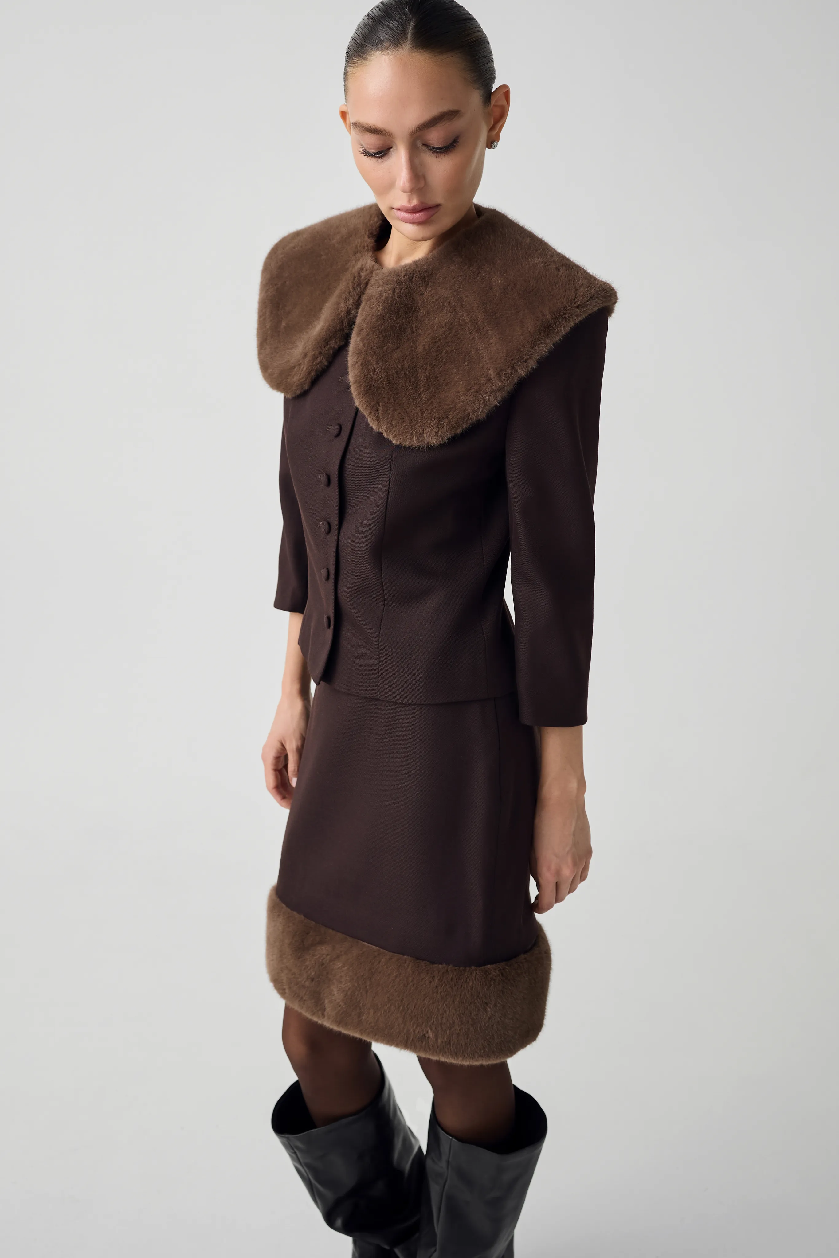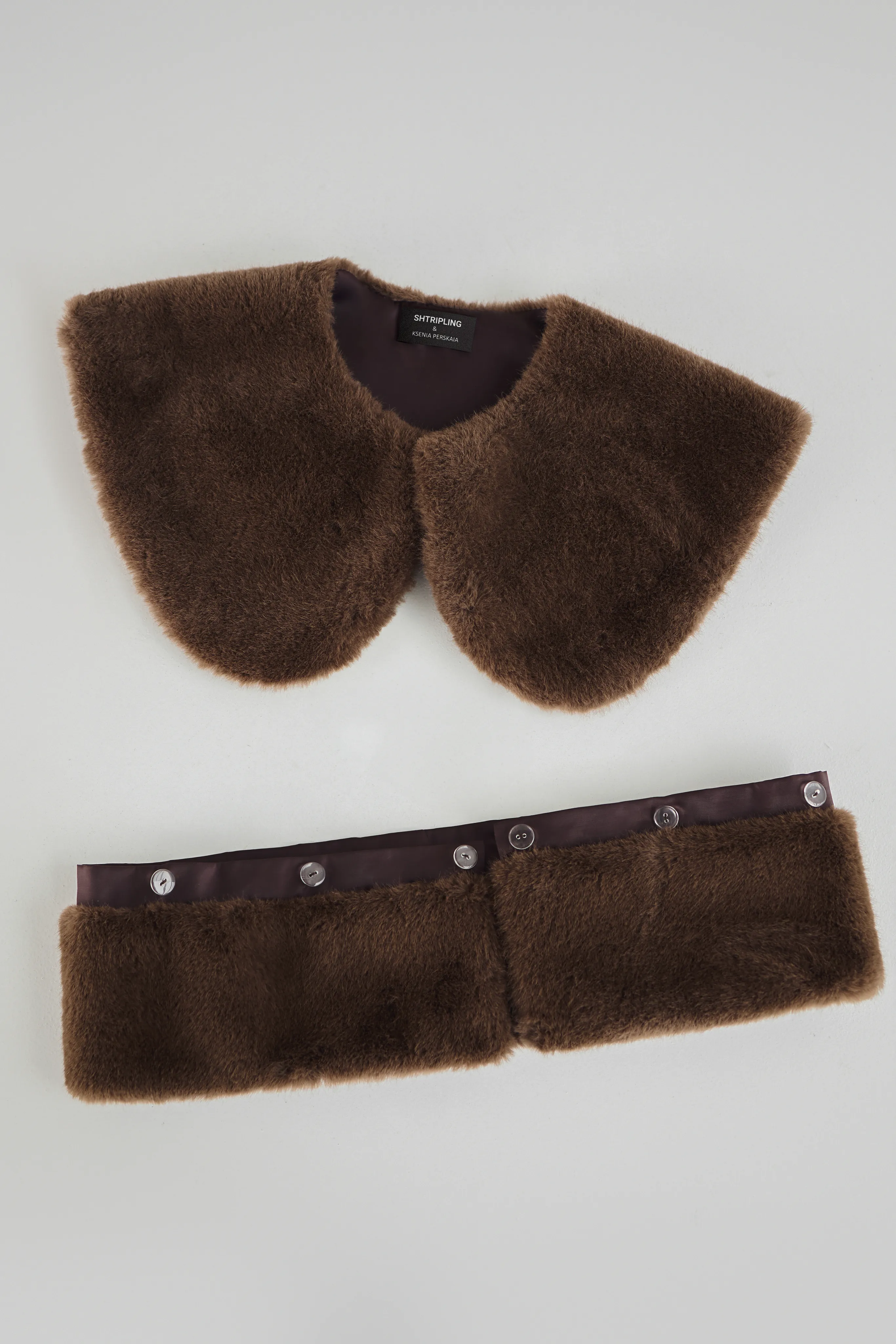 Меховой воротник - съемный аксессуар, который можно носить отдельно от костюма поверх своей верхней одежды. Он чуть выходит за плечевой шов, создавая легкость и воздушность образа. Он выполнен из дубленочного плотного меха на подкладе и застегивается на деликатный обтянутый крючок.