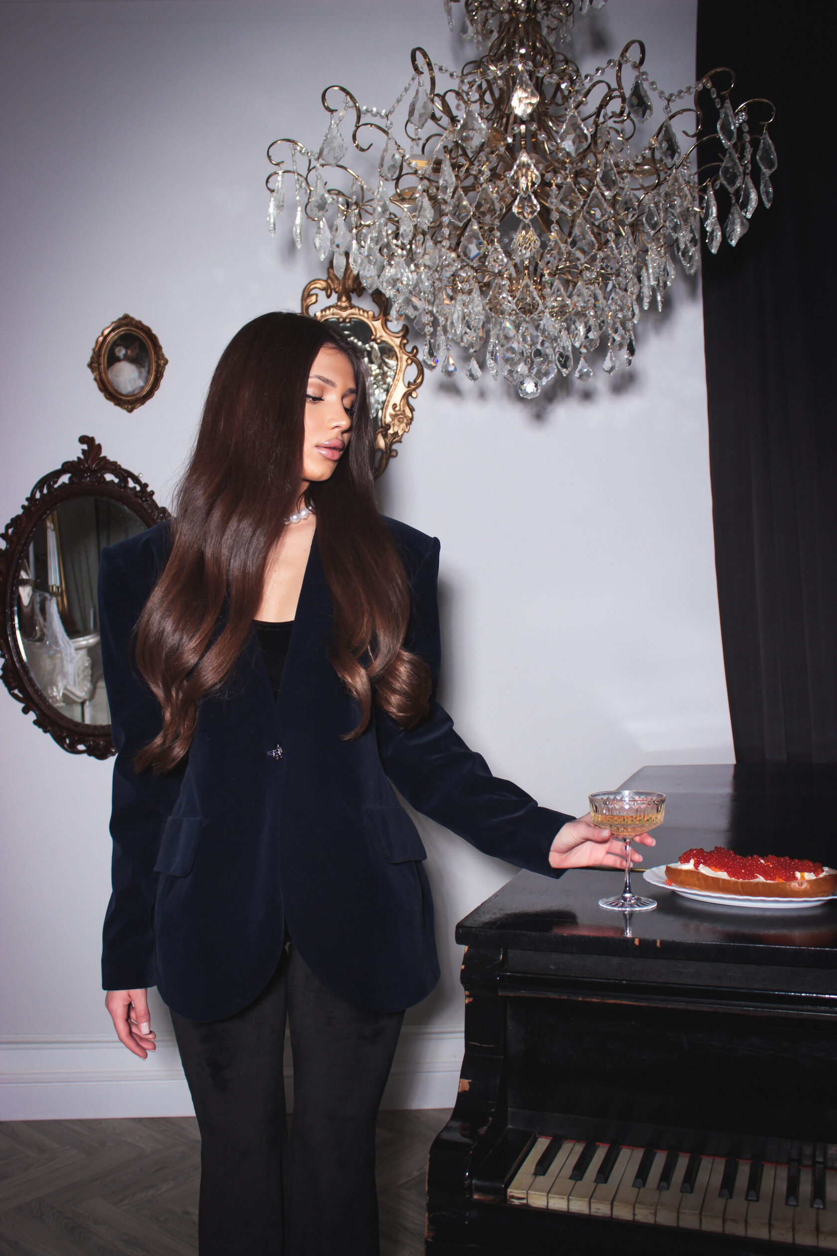 Бархатный приталенный пиджак на одной пуговице — элегантный и выразительный элемент гардероба. Матовый бархат без блеска создаёт благородный эффект, а чёткий силуэт подчёркивает фигуру. Модель представлена в двух насыщенных оттенках: бордовом и глубоком синем — для тех, кто ценит стиль с характером.
