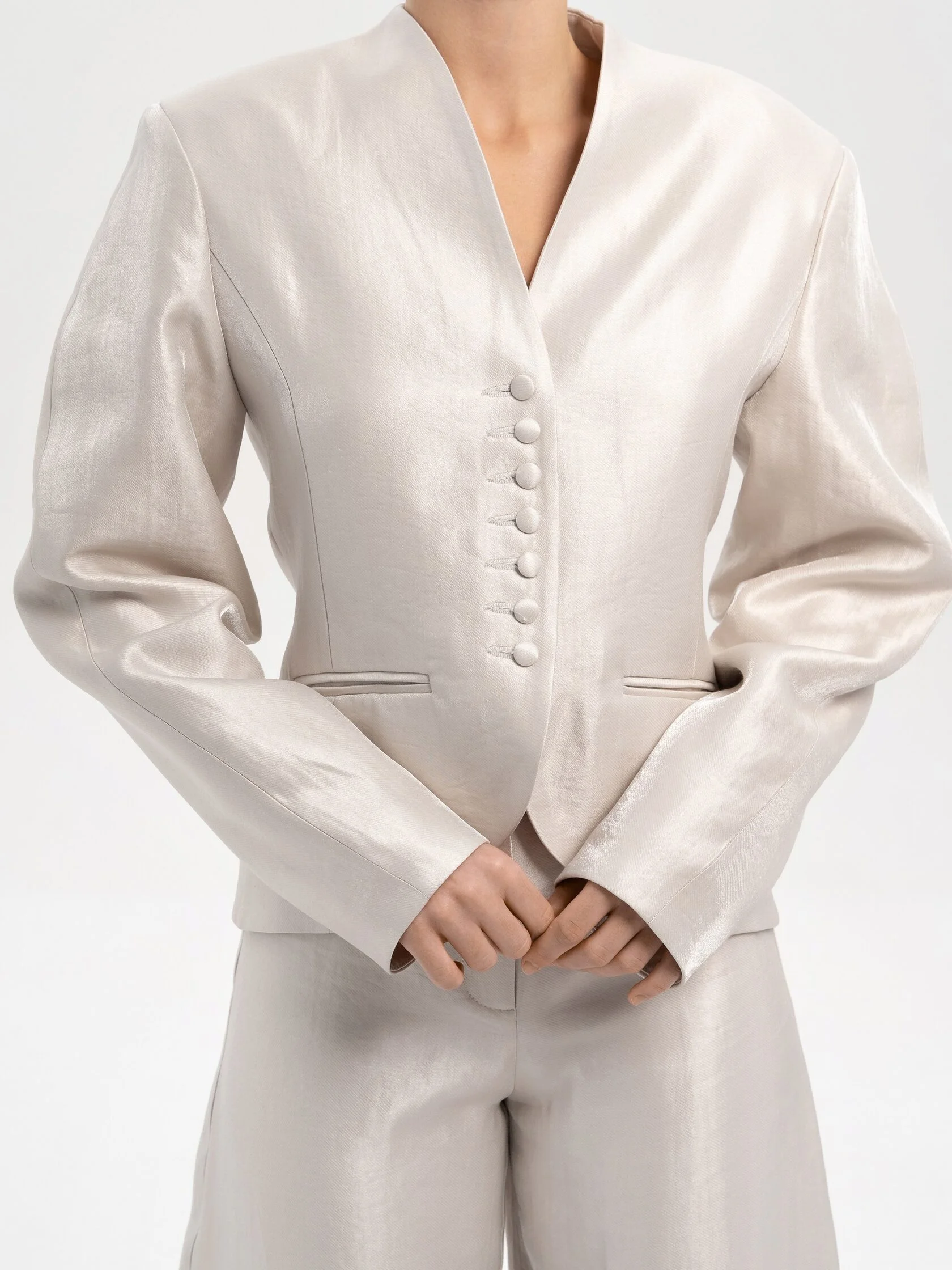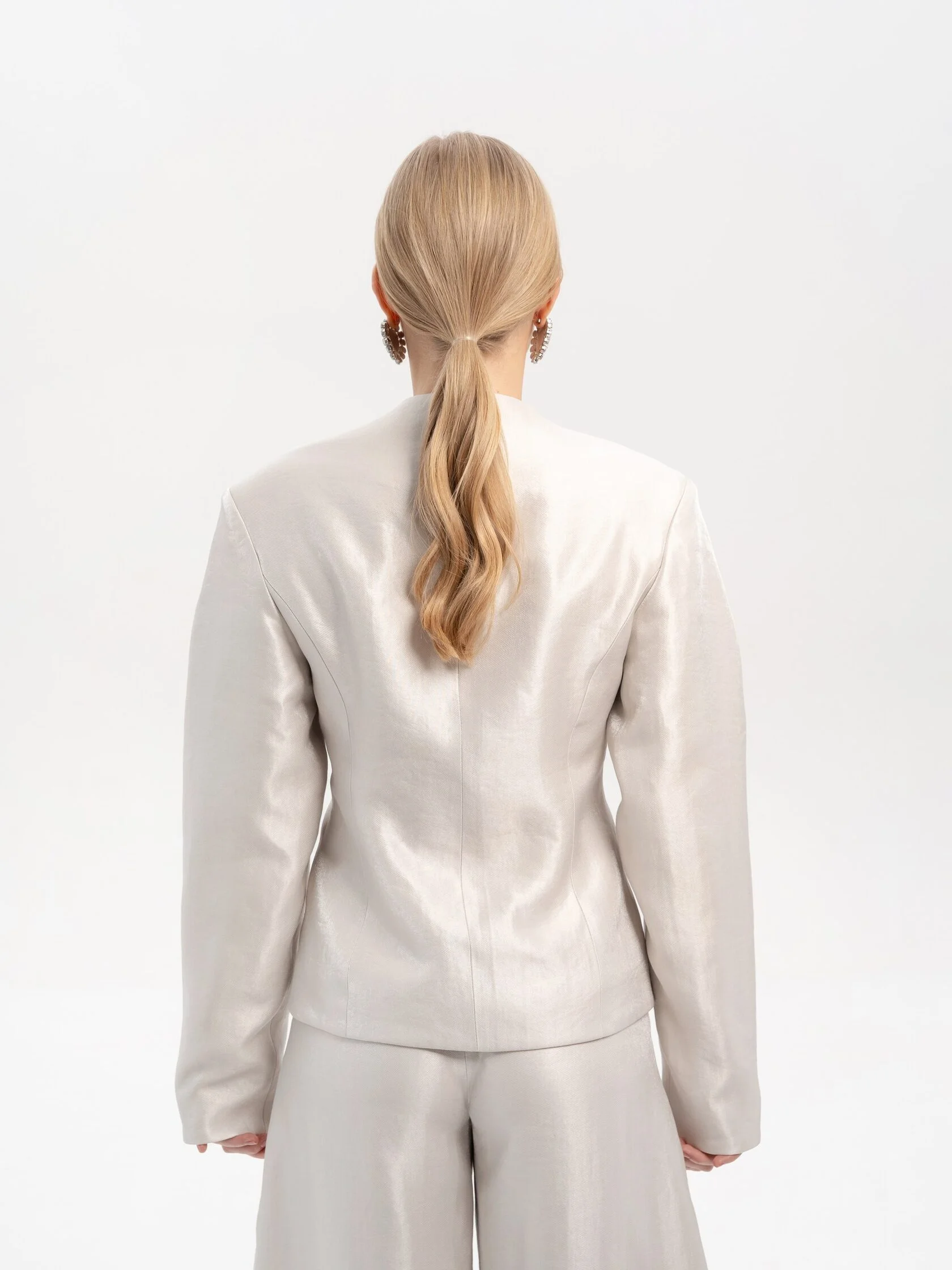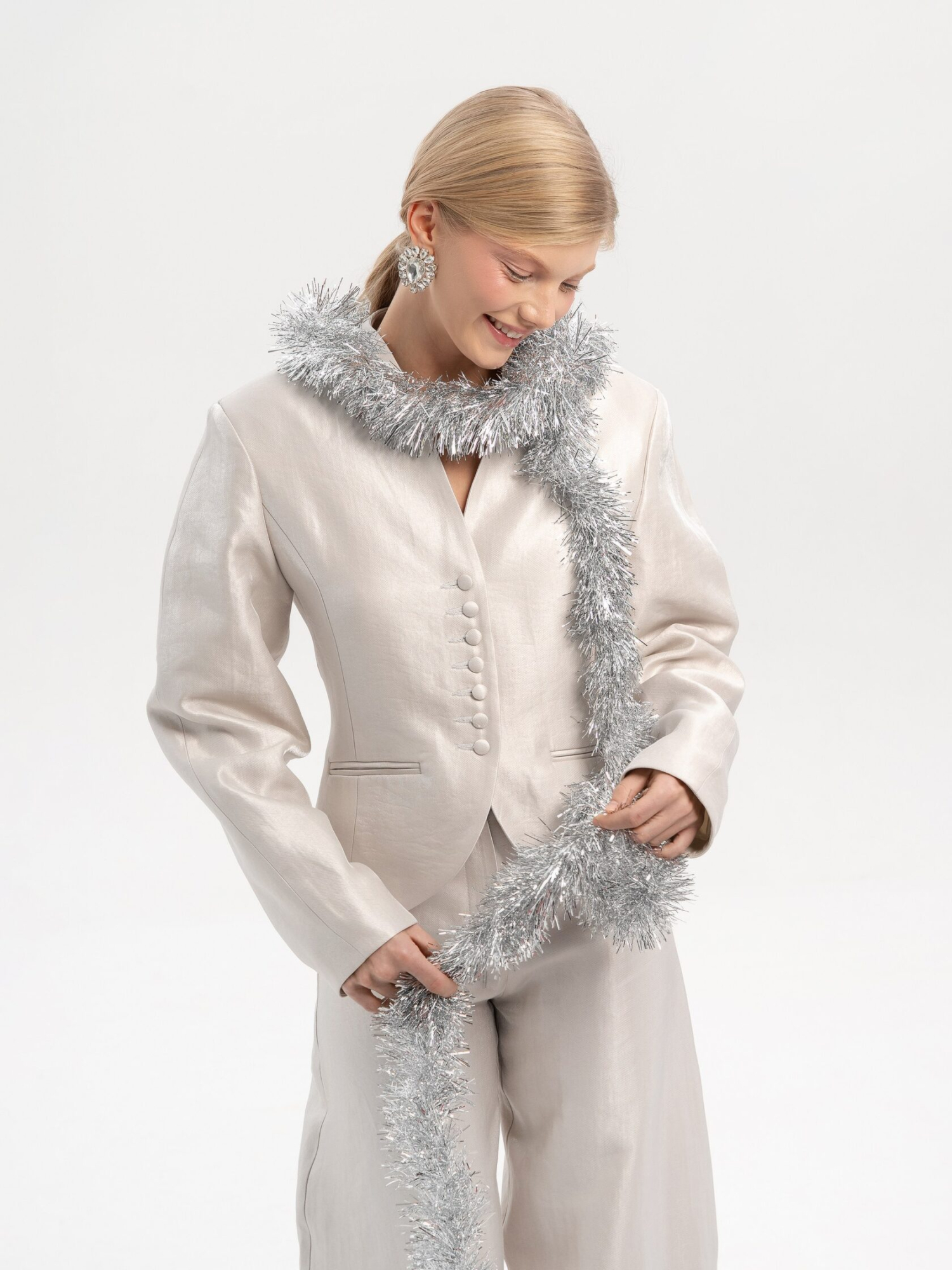 Серебристый жакет с приталенным силуэтом и объемными рукавами создает эффект мягкого сияния, который особенно красиво раскрывается в вечернем свете. Эта вещь превращает любой образ в праздничный, но при желании может стать и частью повседневного гардероба – достаточно сочетать его с джинсами или строгими брюками.