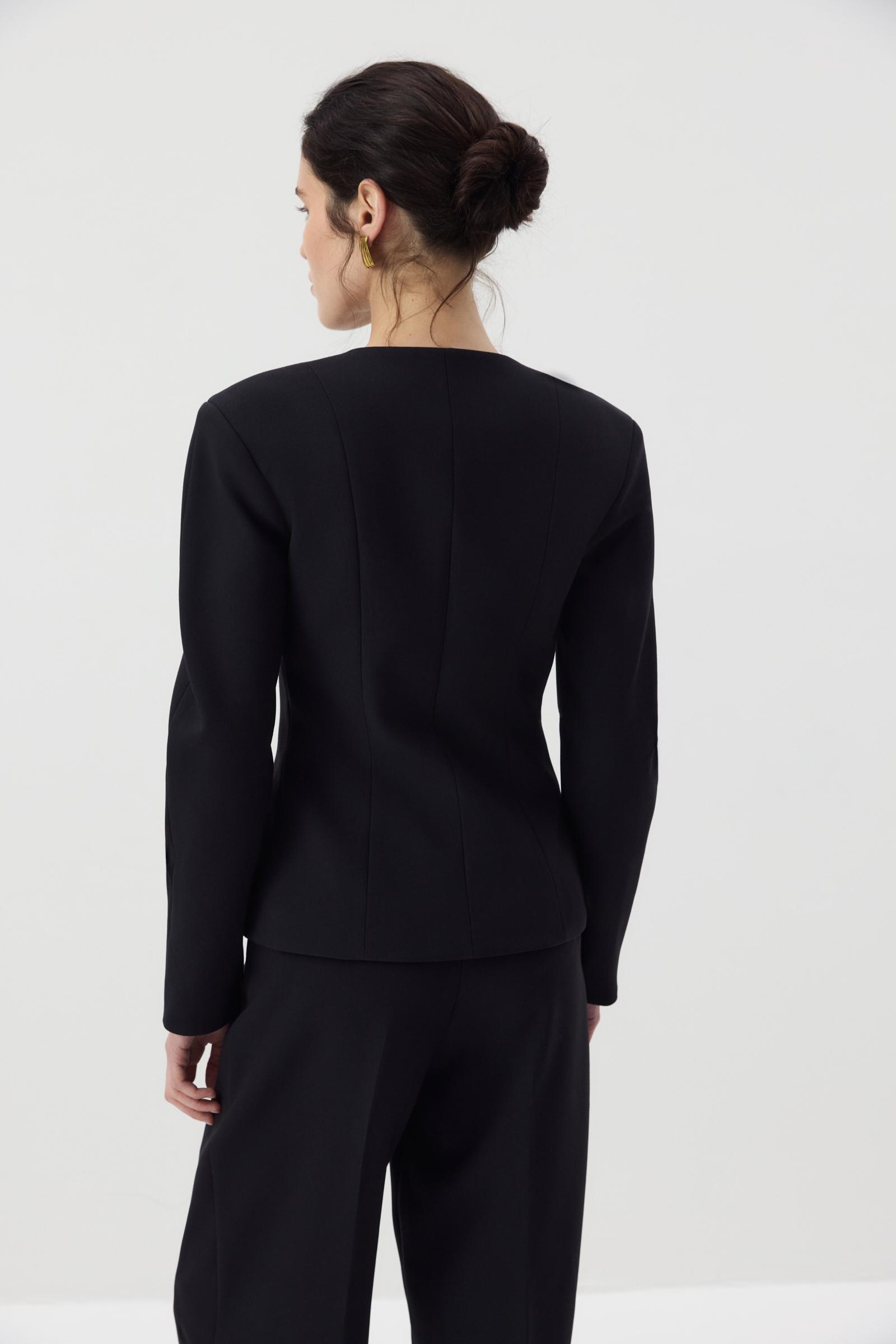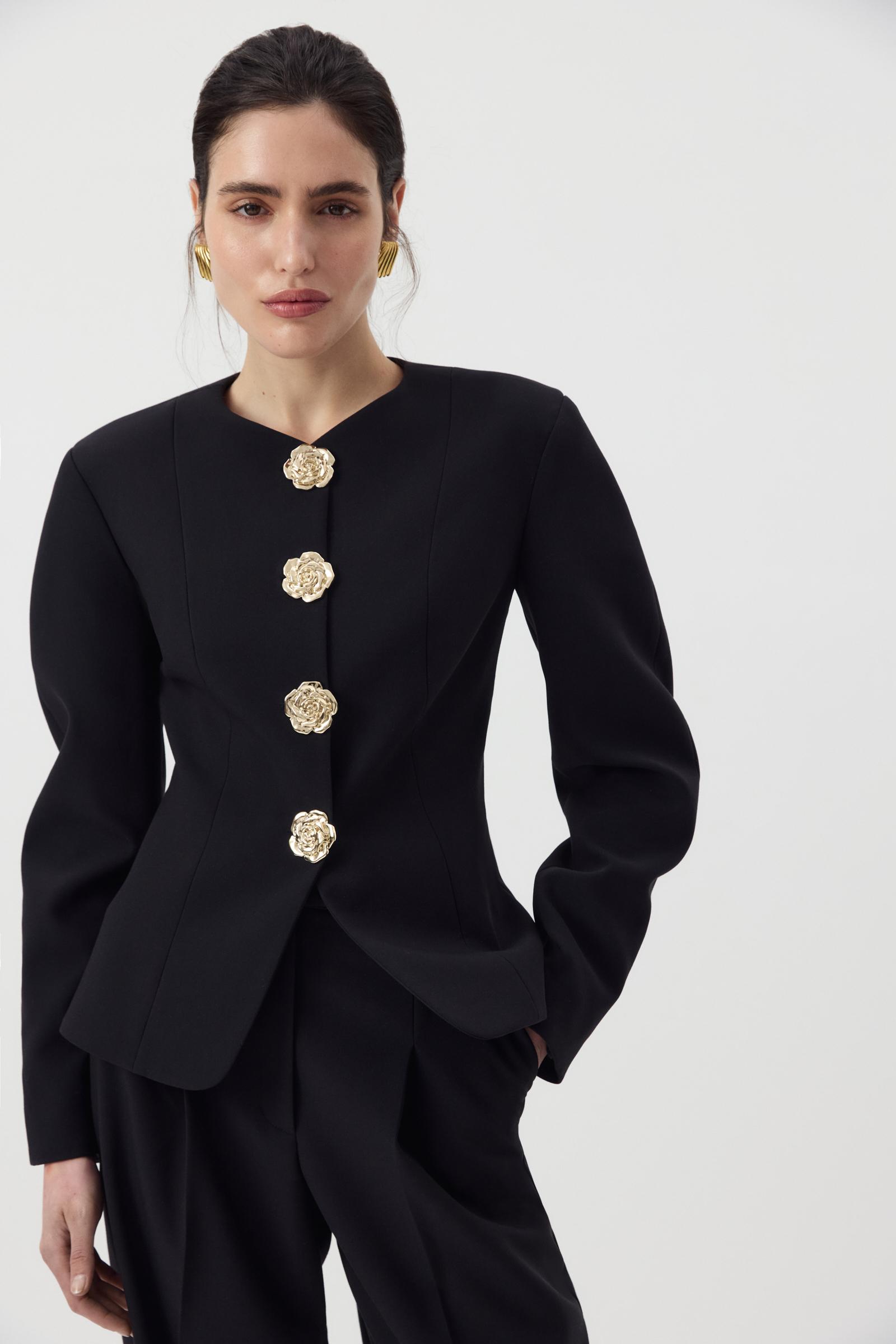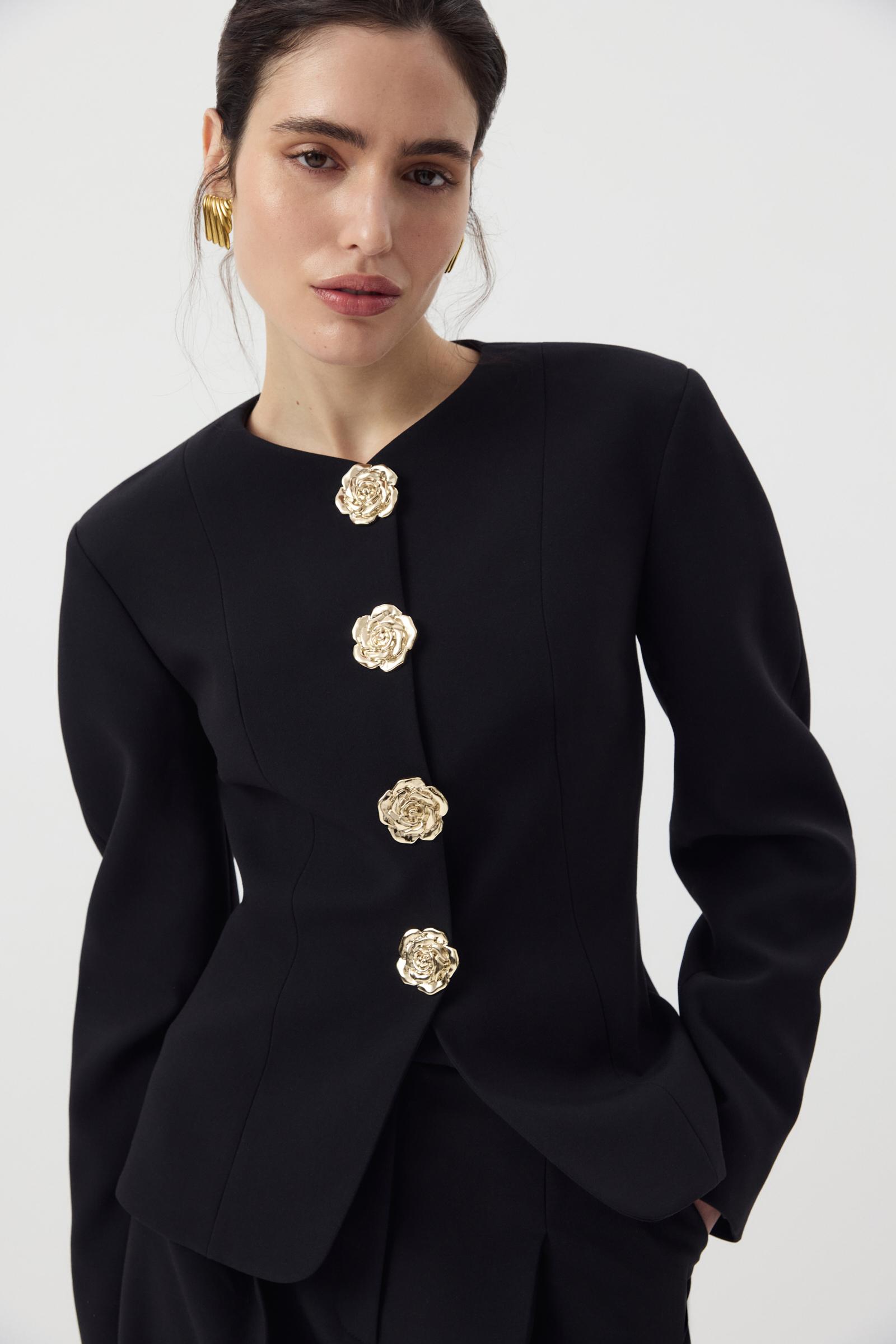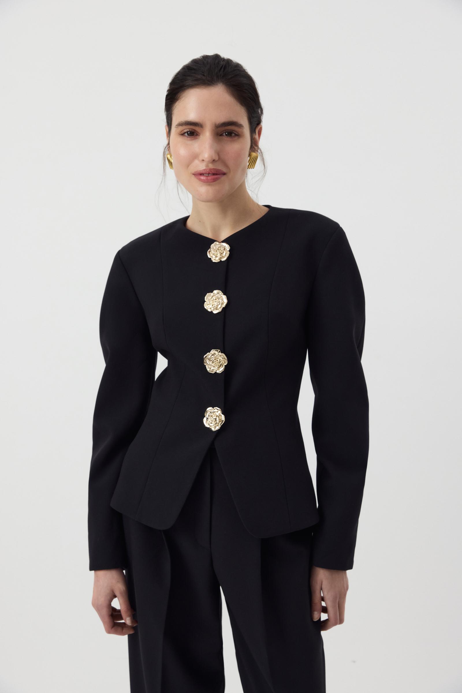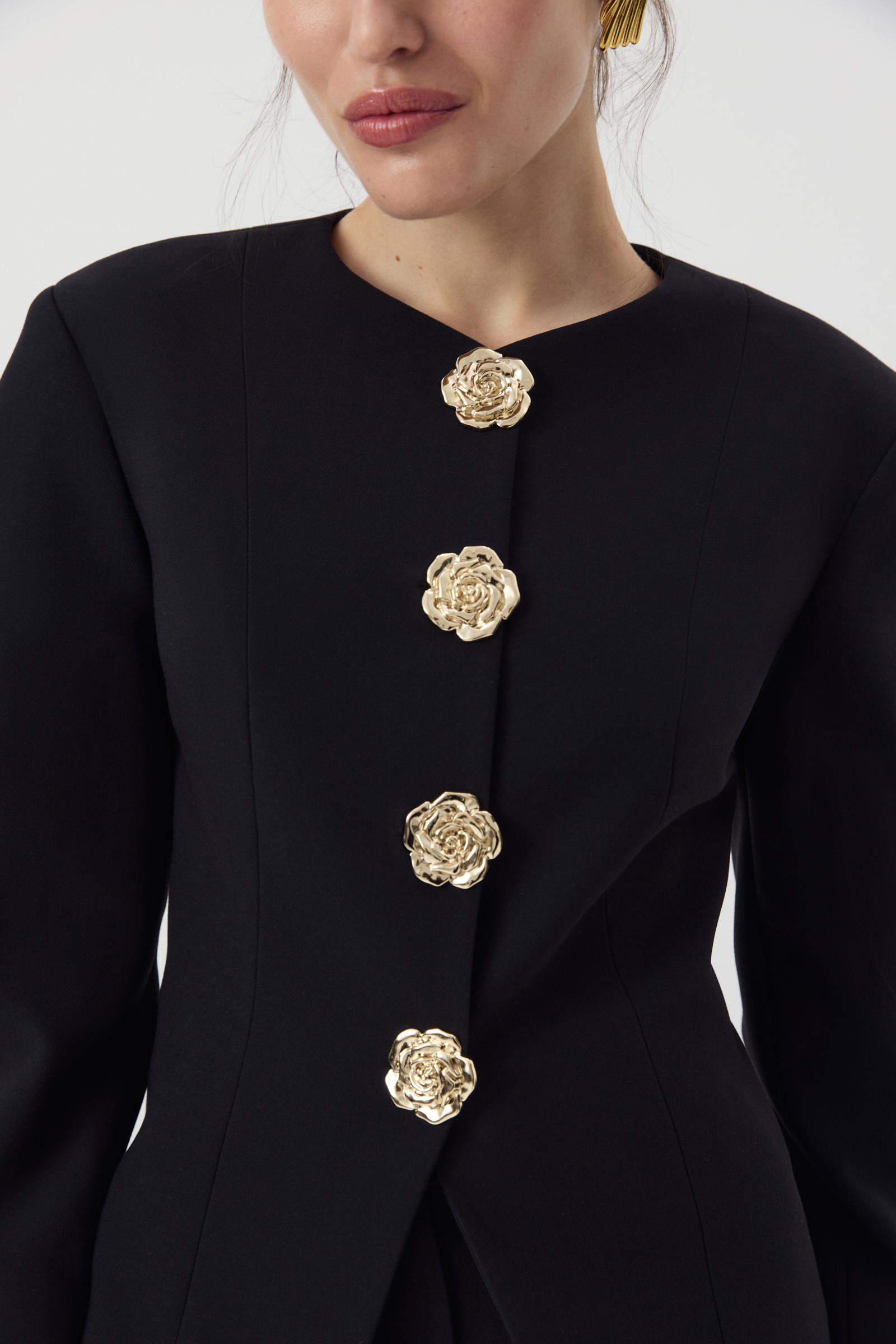 Жакет О-силуэта. Модель из костюмной ткани без воротника с округлыми рукавами. На подборте четыре декоративные пуговицы в виде золотых роз. Благодаря вертикальным рельефам и приталенному силуэту жакет подчеркивает женственные линии.