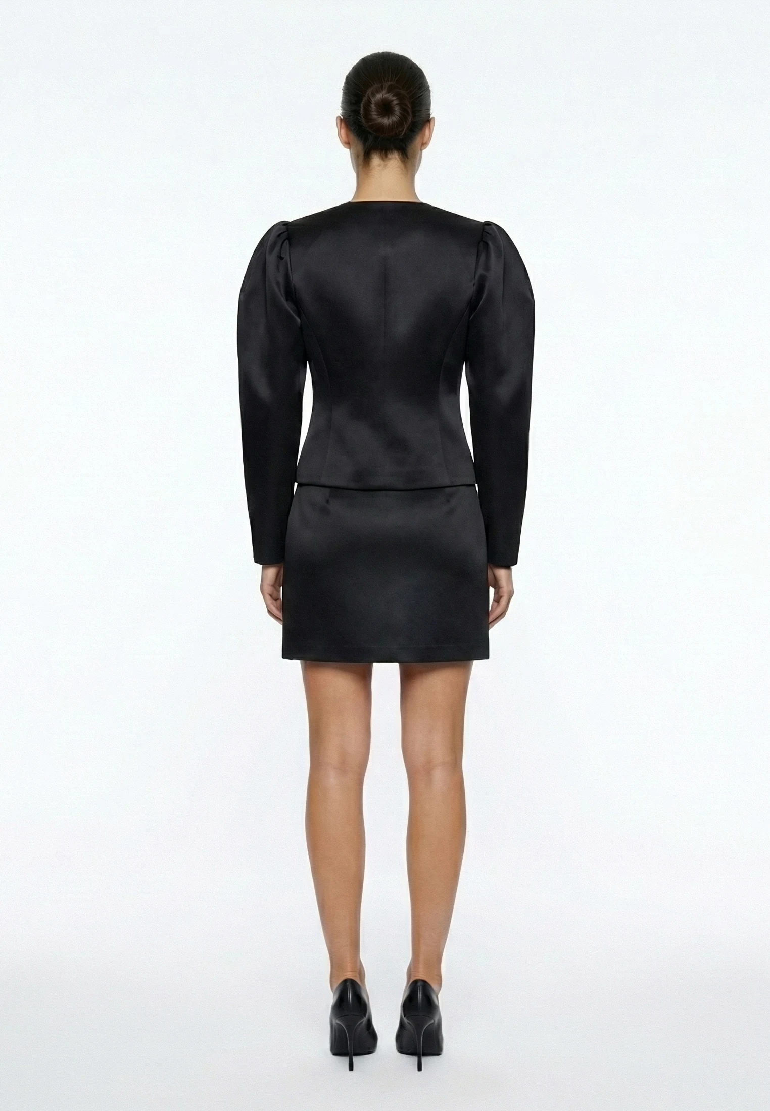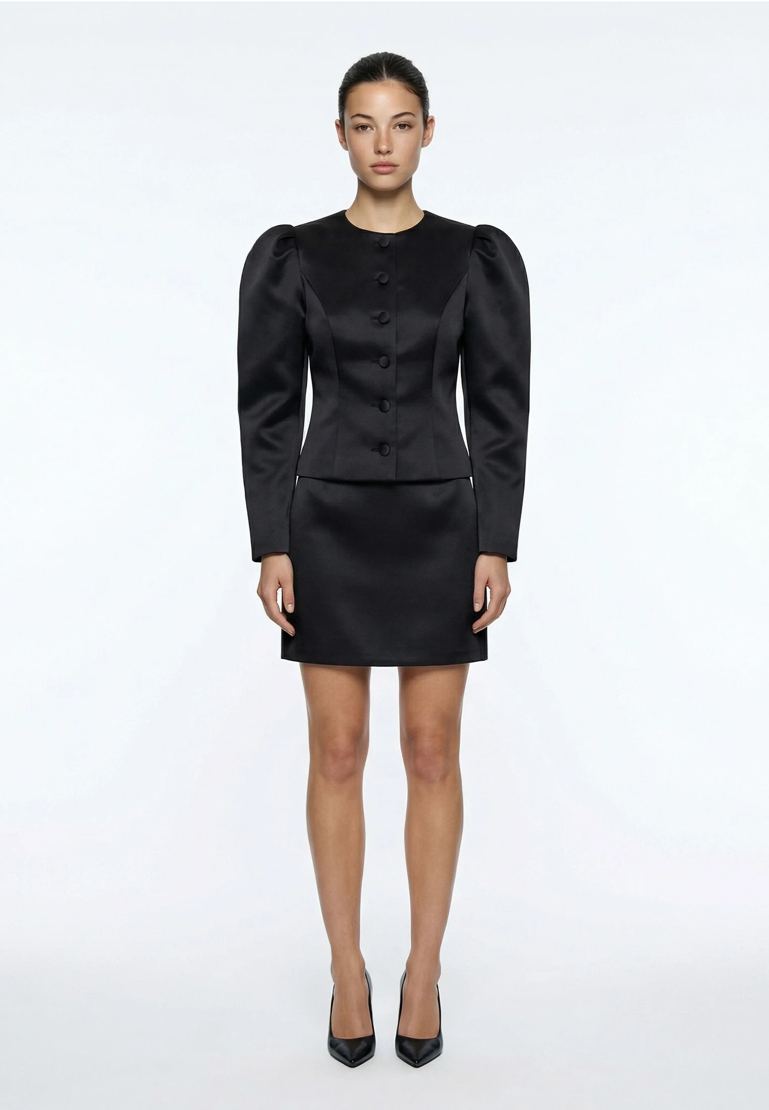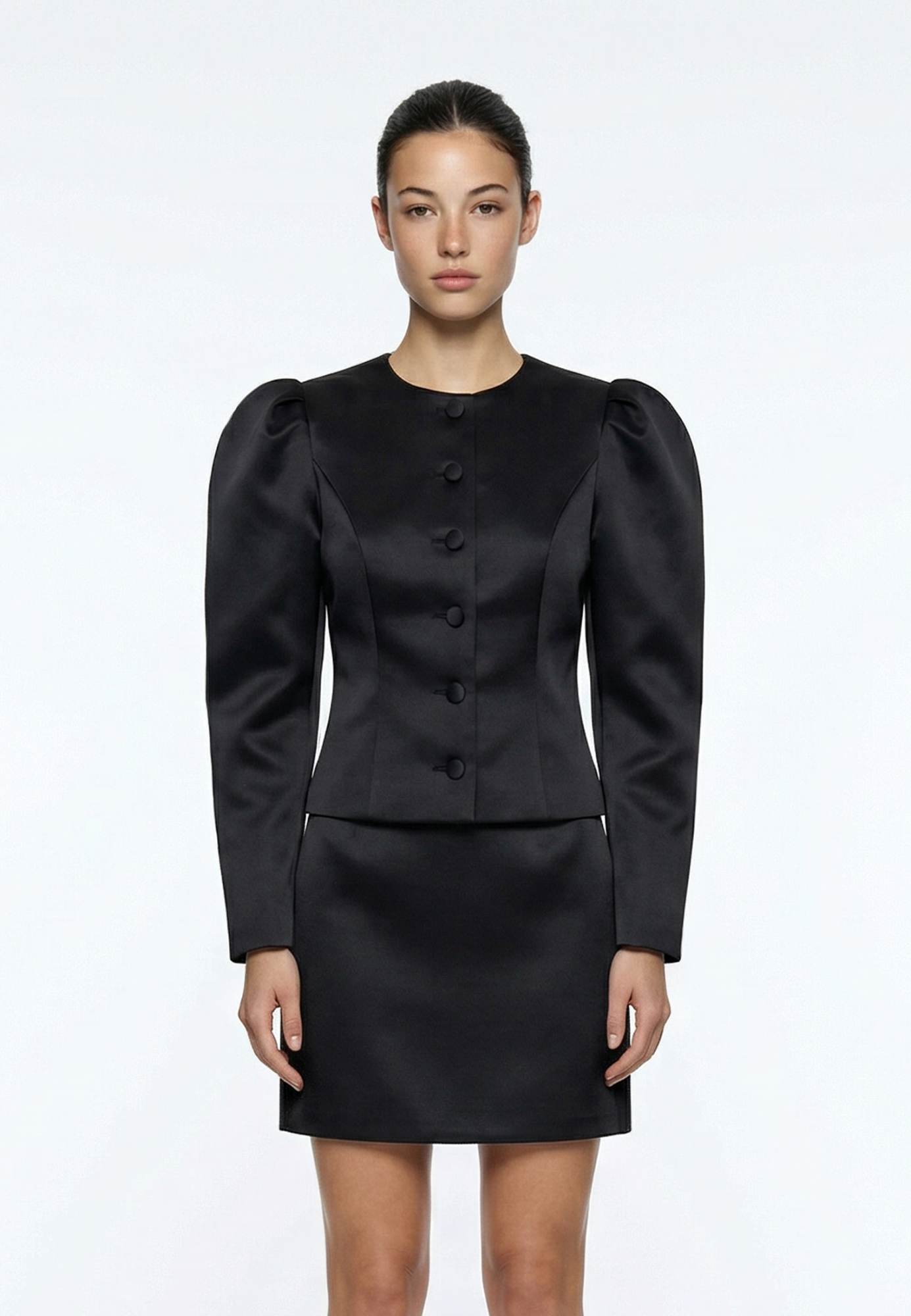 Жакет из сатина в чёрном цвете — это стильный и элегантный элемент гардероба. Буфы на рукавах придают модели изысканность и оригинальность. Идеально подходит для создания как повседневных, так и более формальных образов.