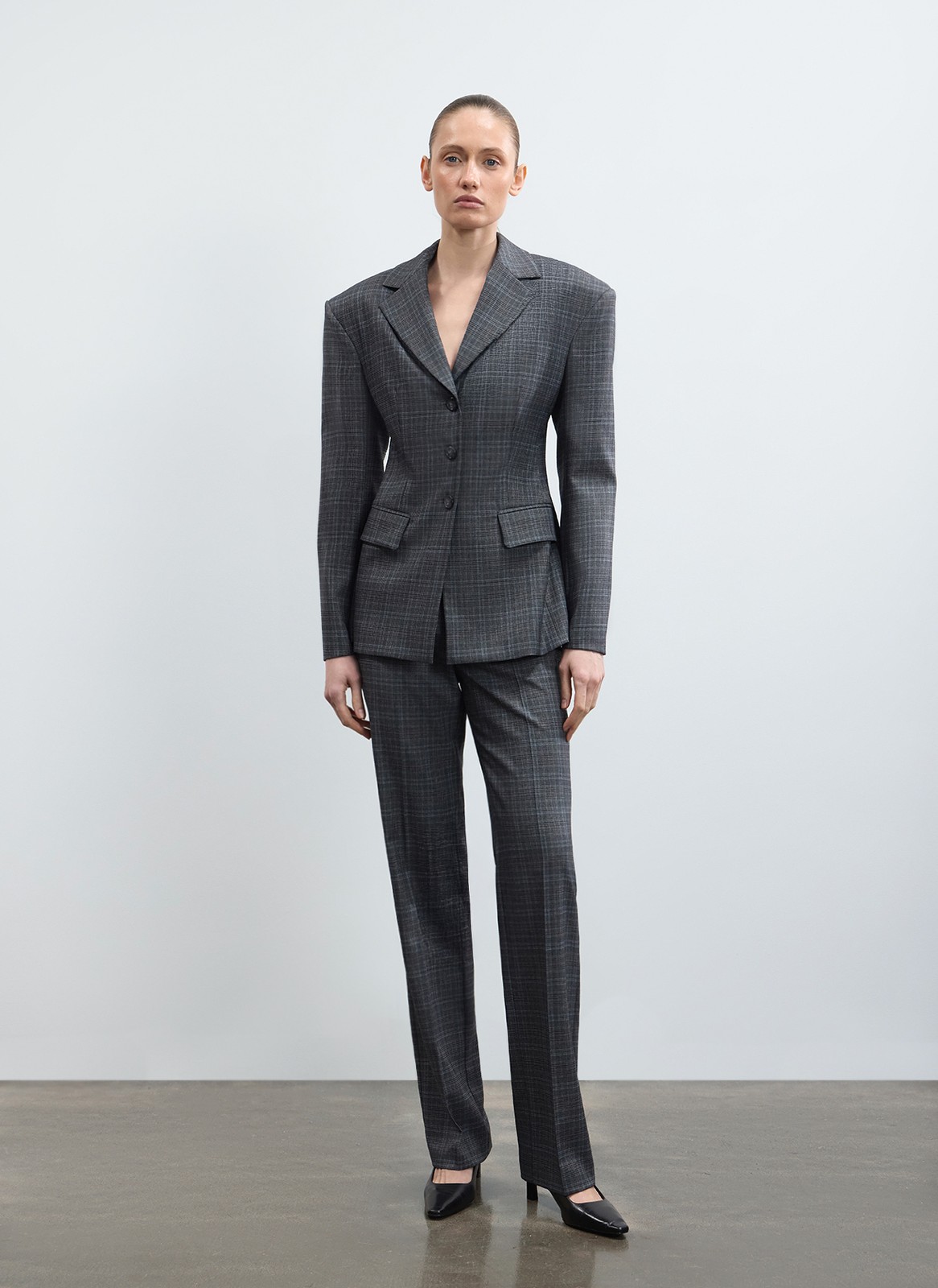 Приталенная модель с увеличенной линией плеч и акцентом на талии формирует эффектный силуэт «песочные часы».