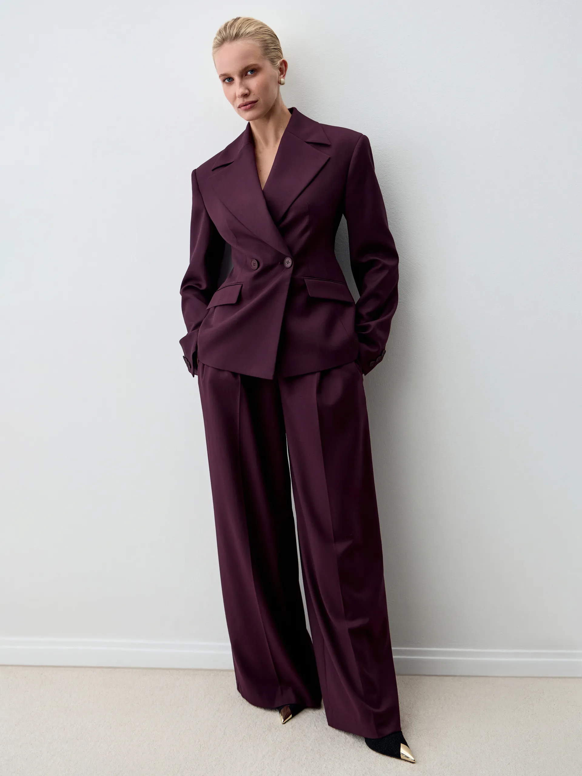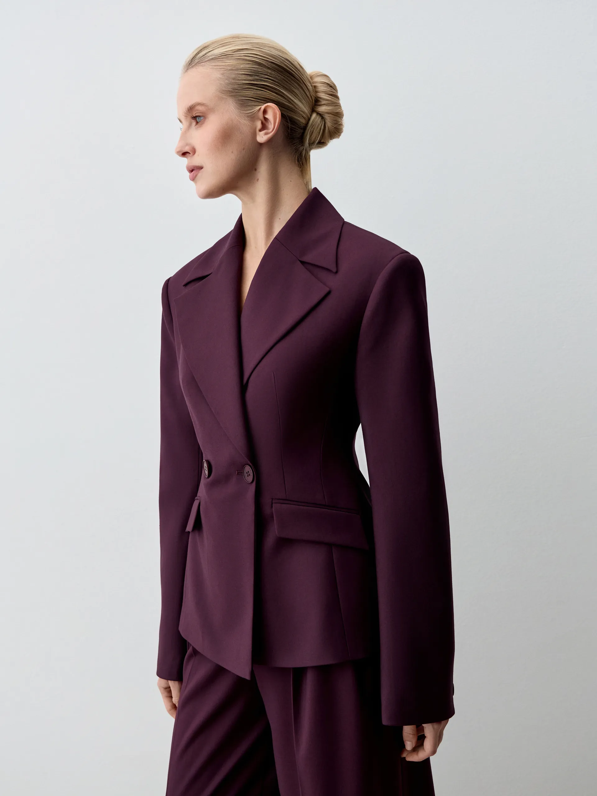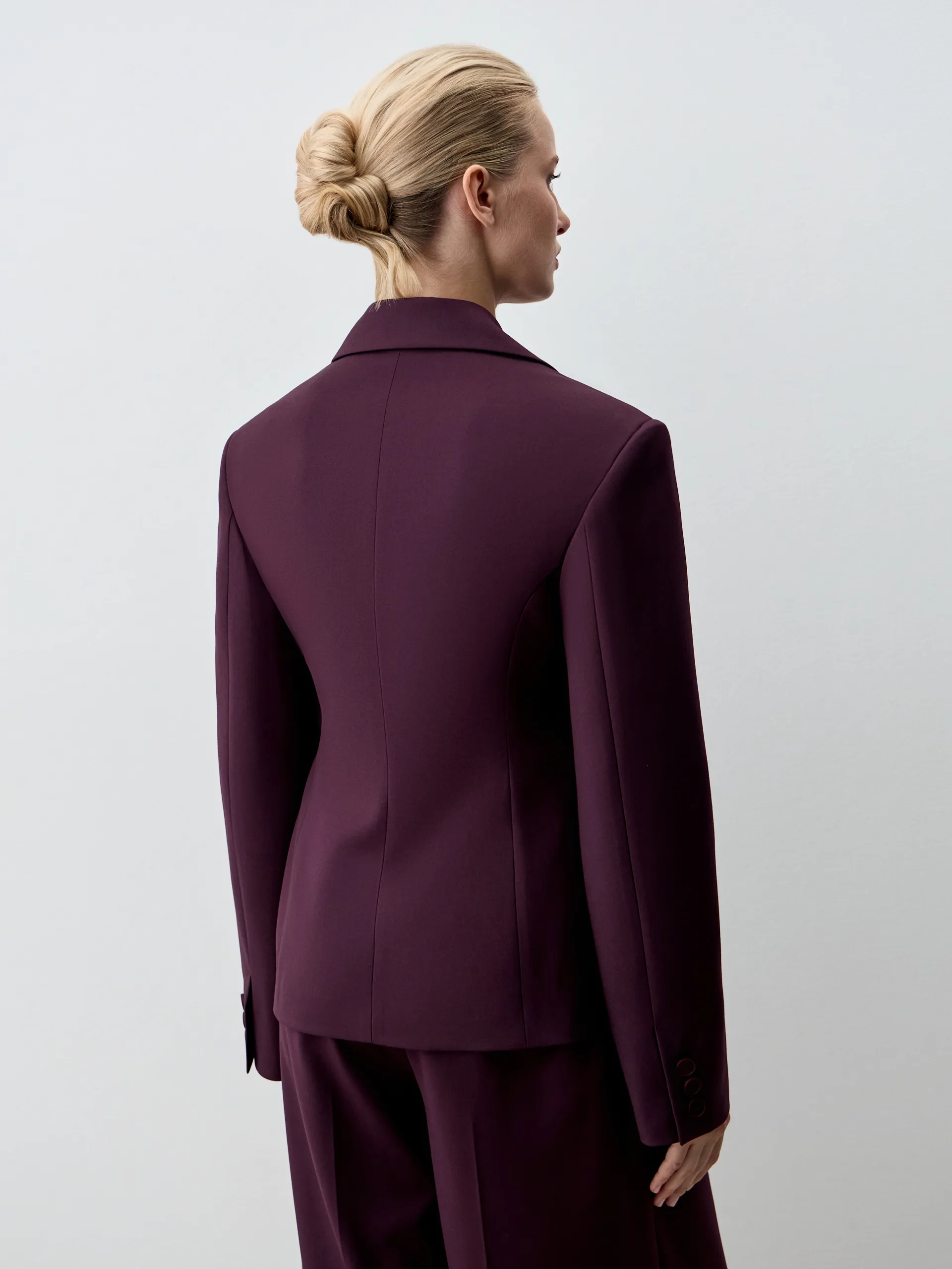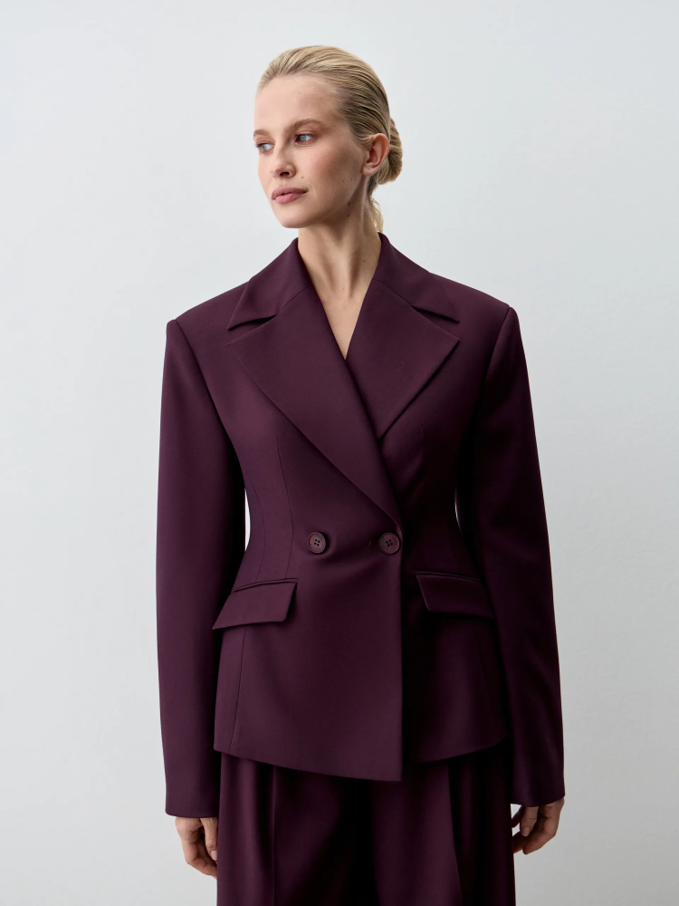 Жакет Diego. Приталенный жакет с увеличенной линией плеча и длиной чуть выше классической выполнен из костюмной ткани глубокого фиолетового оттенка. Материал отличается комфортом в носке, не мнётся и не пилингуется, сохраняя аккуратный вид в течение всего дня. Приталенный крой подчёркивает фигуру, а акцентная линия плеча придаёт силуэту современный характер. Модель универсальна: её легко адаптировать под деловые, повседневные и вечерние образы. Рекомендуем сочетать с классическими брюками или юбкой-карандаш для офисного стиля, с джинсами и футболкой для расслабленного кэжуал-лука или с платьем для многослойного и более нарядного ансамбля.