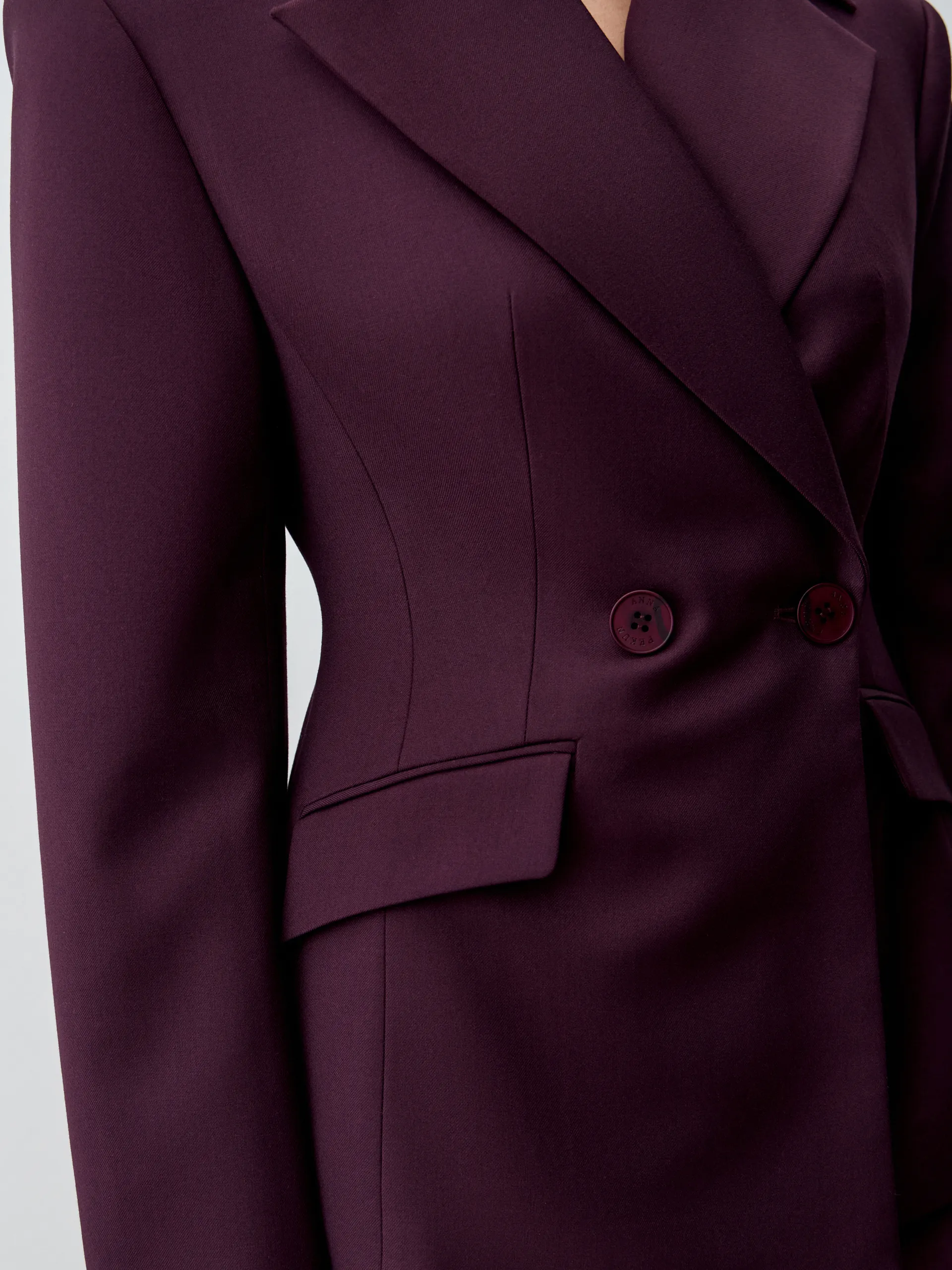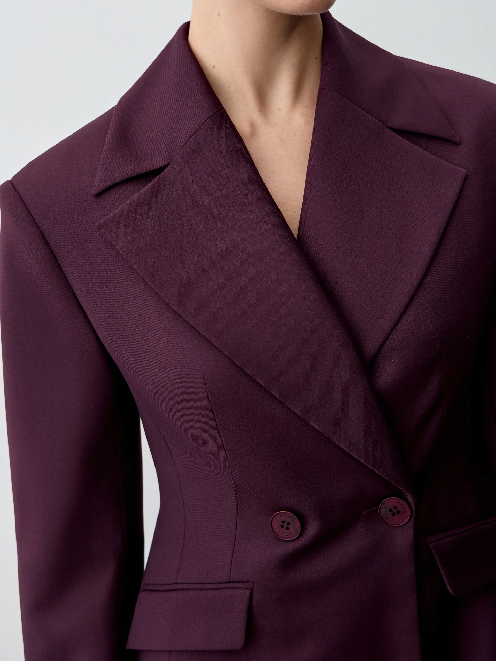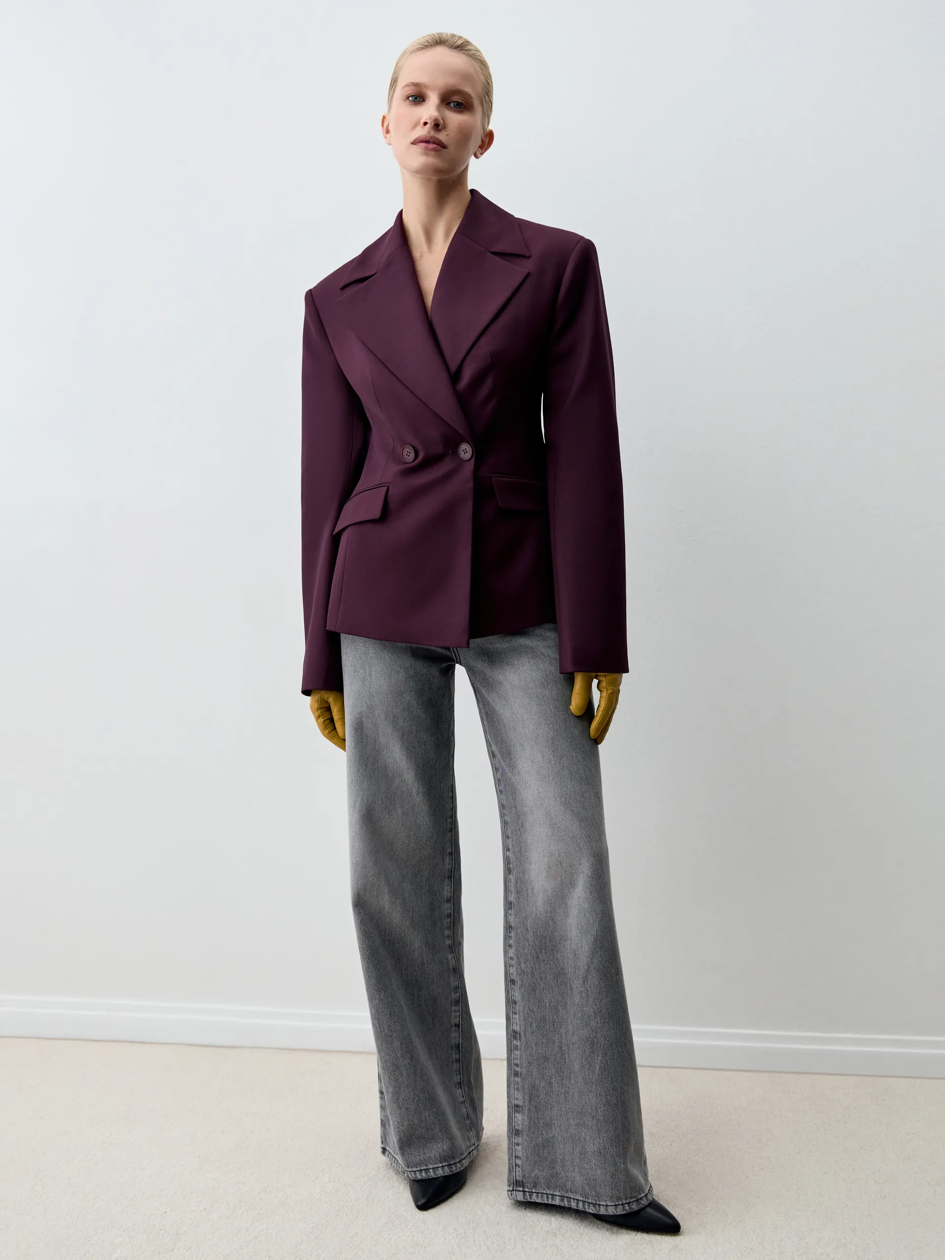 Жакет Diego. Приталенный жакет с увеличенной линией плеча и длиной чуть выше классической выполнен из костюмной ткани глубокого фиолетового оттенка. Материал отличается комфортом в носке, не мнётся и не пилингуется, сохраняя аккуратный вид в течение всего дня. Приталенный крой подчёркивает фигуру, а акцентная линия плеча придаёт силуэту современный характер. Модель универсальна: её легко адаптировать под деловые, повседневные и вечерние образы. Рекомендуем сочетать с классическими брюками или юбкой-карандаш для офисного стиля, с джинсами и футболкой для расслабленного кэжуал-лука или с платьем для многослойного и более нарядного ансамбля.