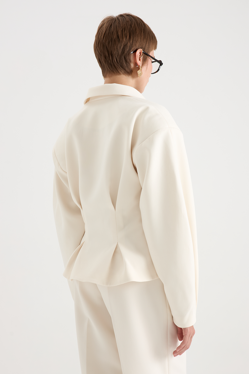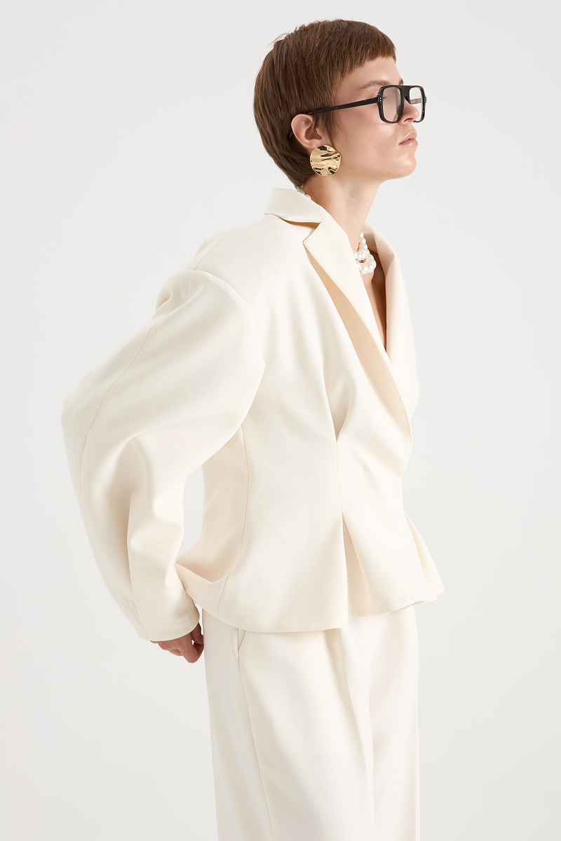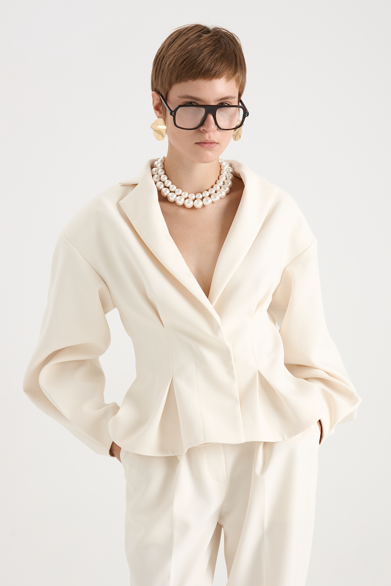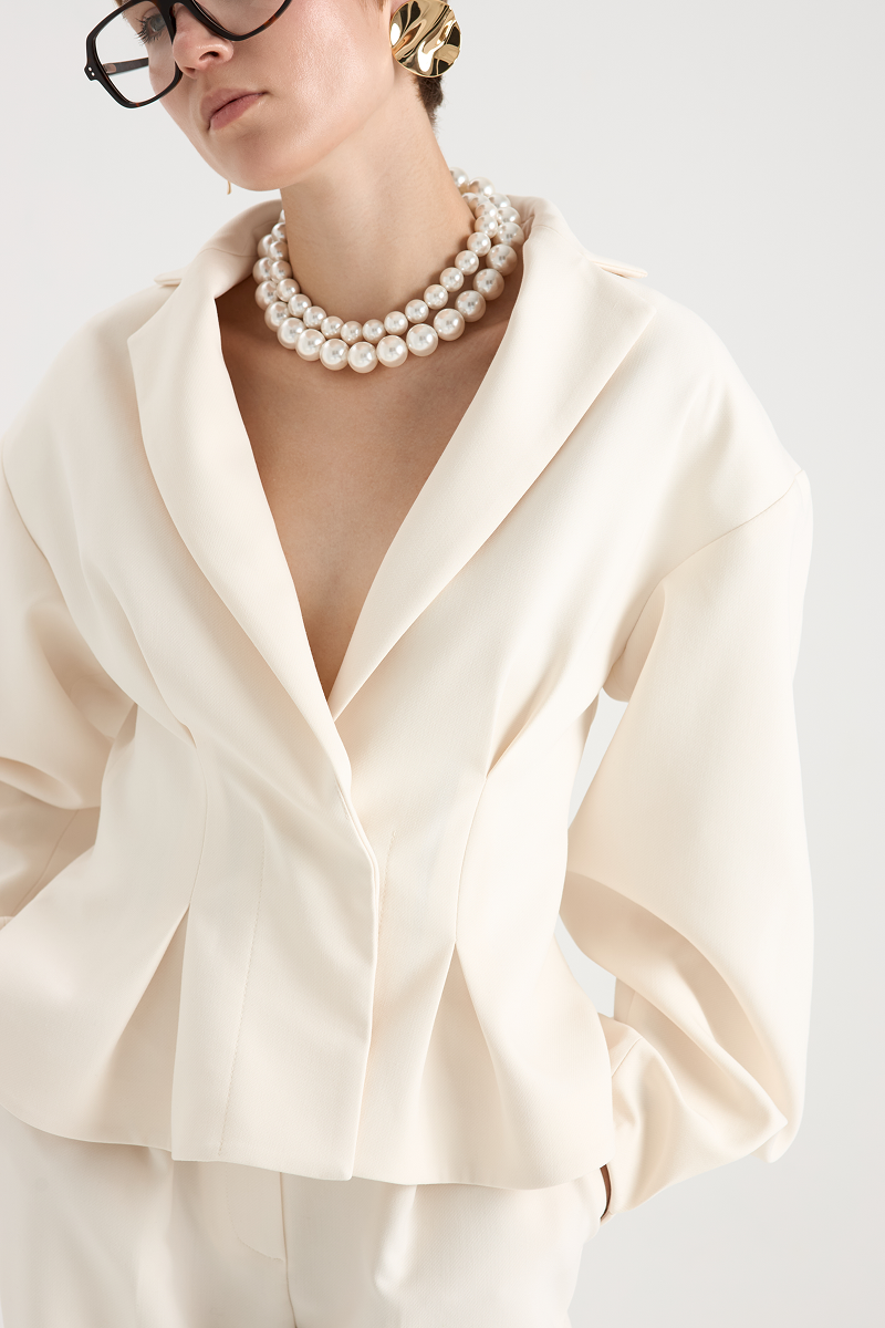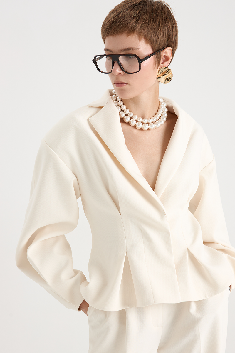 Элегантная и стильная вещь, которая подчеркнёт достоинства фигуры. Вытачки на талии создают чёткий силуэт и придают жакету изящный вид, а объёмные плечи добавляют образу динамики и уверенности.