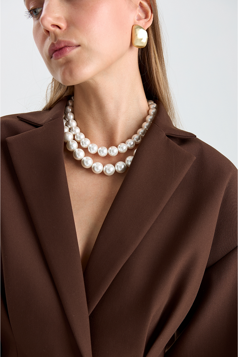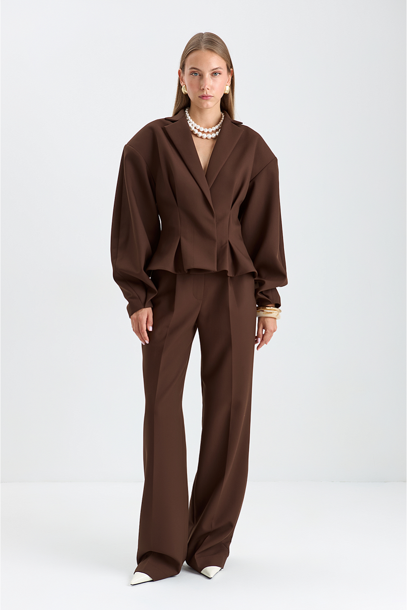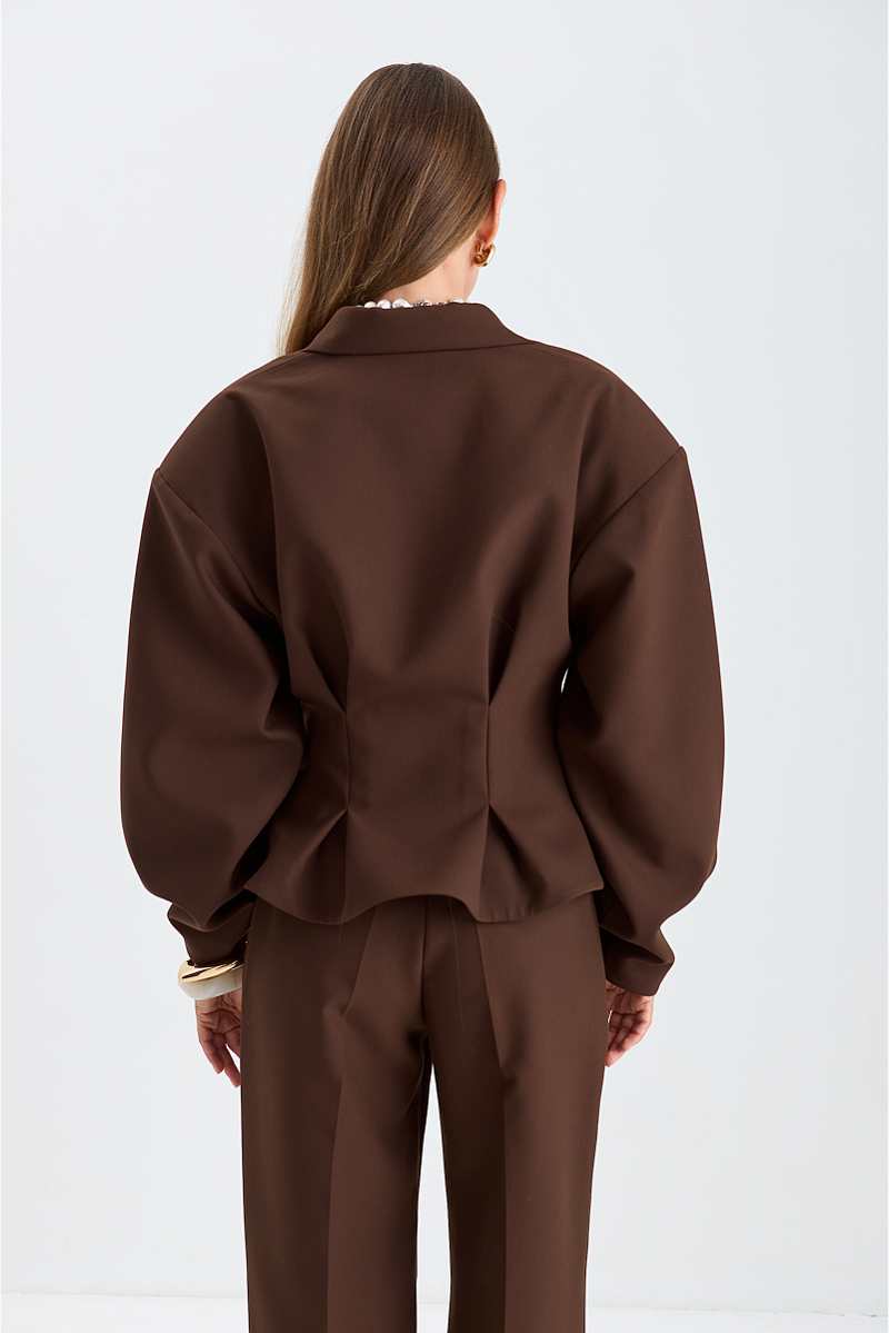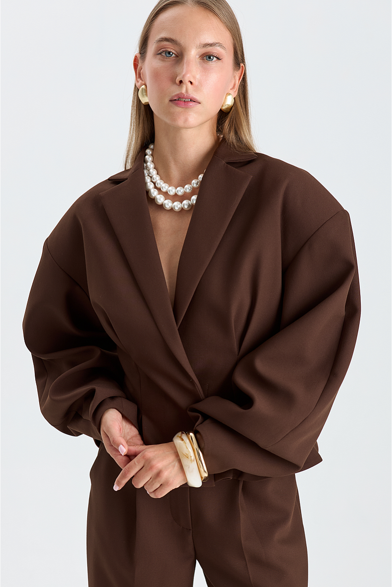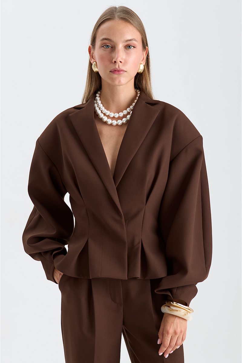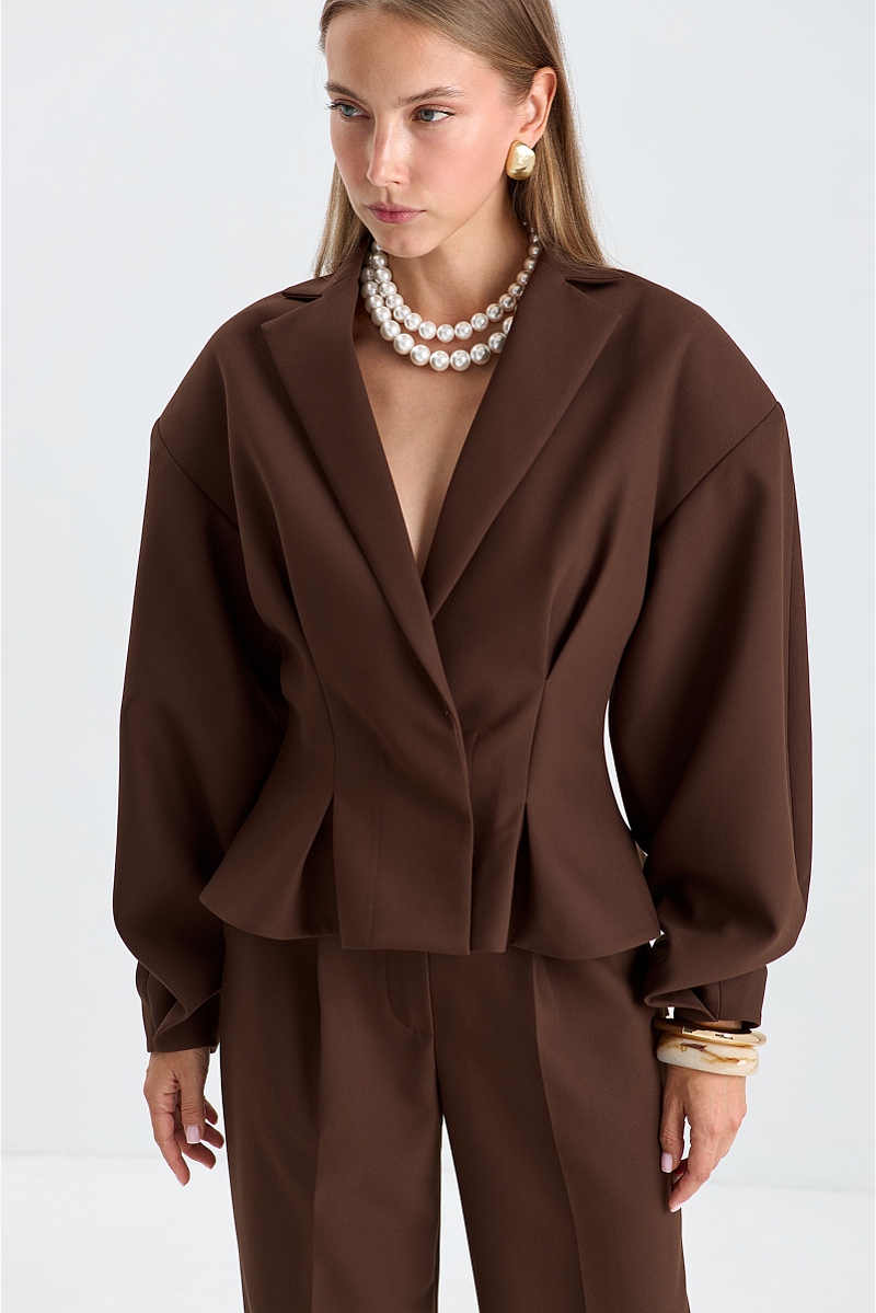 Элегантная и стильная вещь, которая подчеркнёт достоинства фигуры. Вытачки на талии создают чёткий силуэт и придают жакету изящный вид, а объёмные плечи добавляют образу динамики и уверенности.