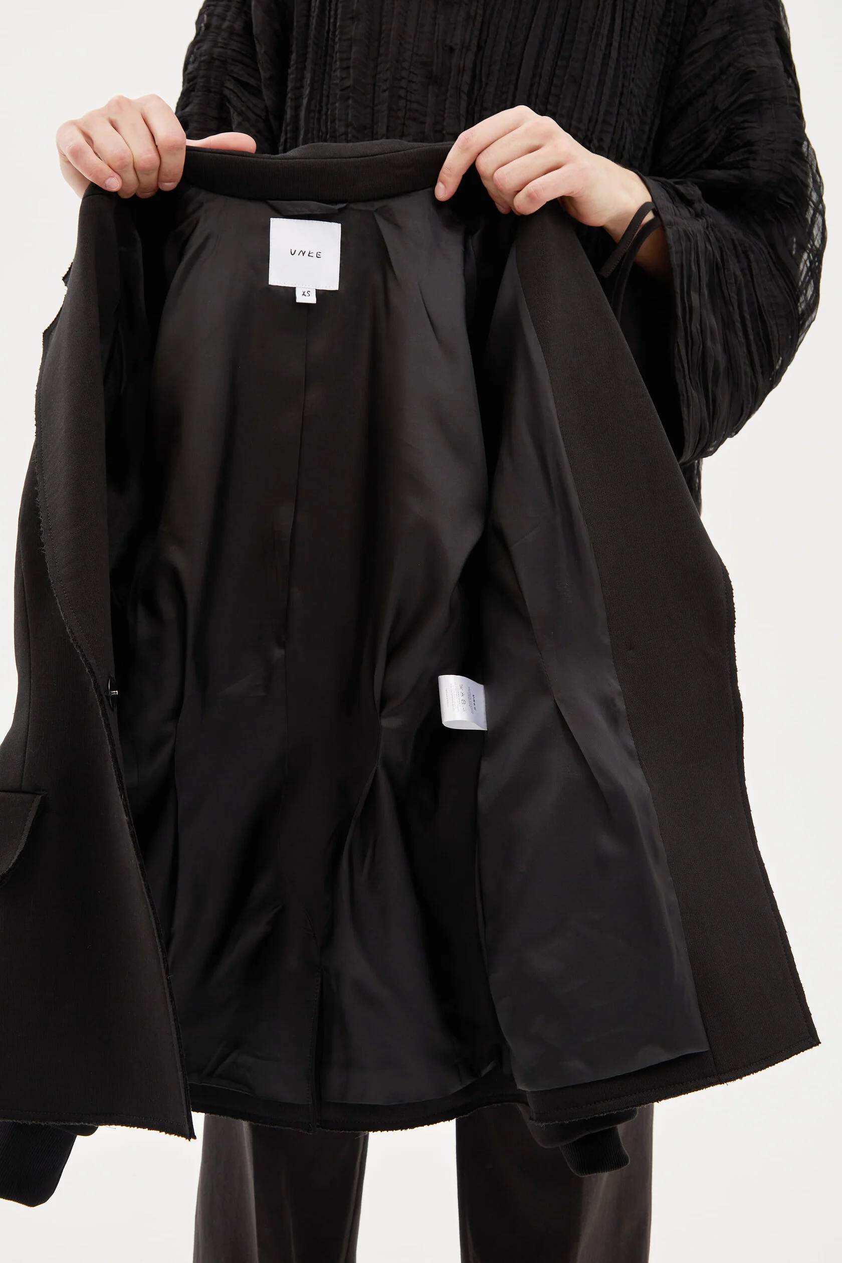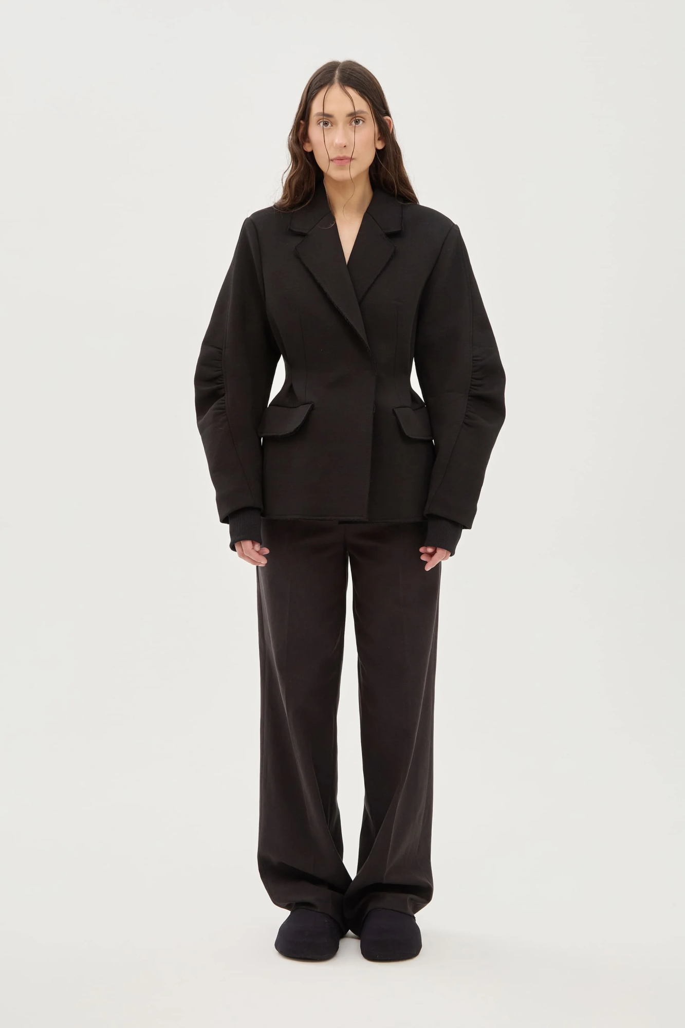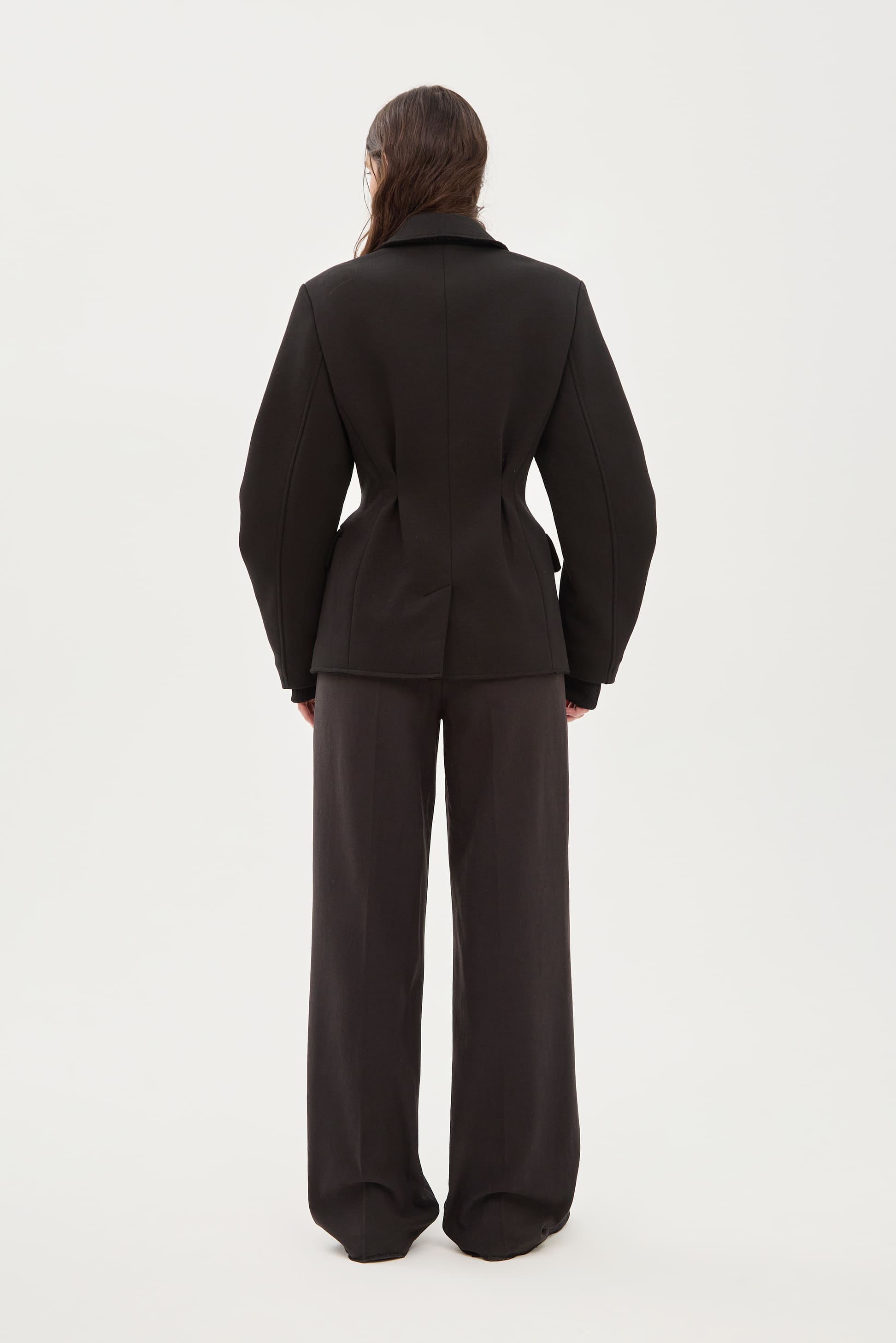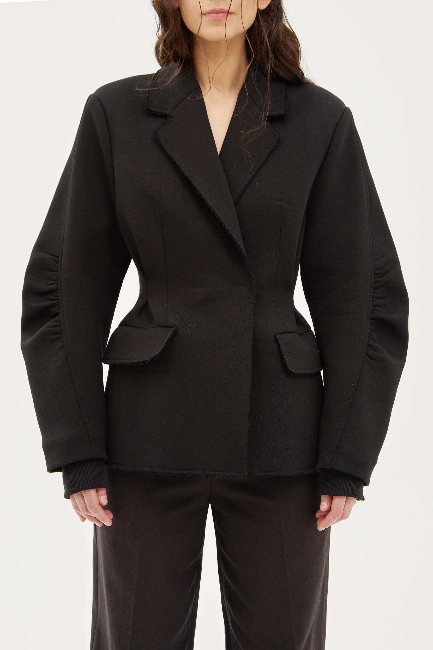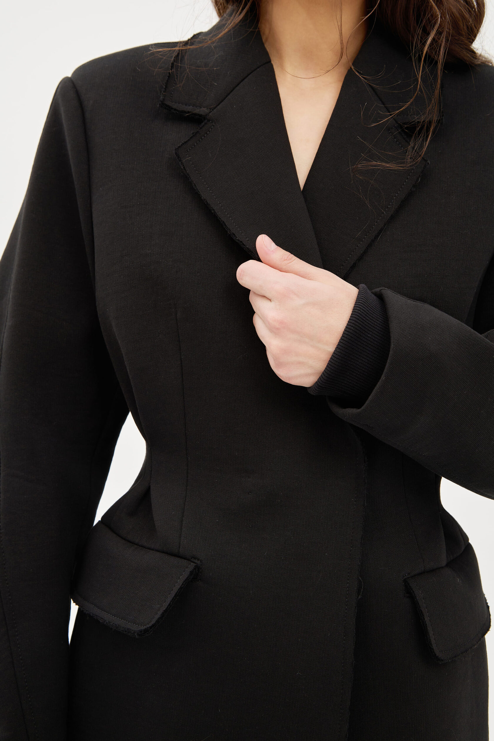 Двубортный жакет с чуть расширенным плечом из плотного футера с необработанным краем. Приталенный силуэт за счет защипов на спинке. Скульптурный рукав со сборкой в районе локтя для свободы движения. Классический английский воротник. Трикотажный манжет для дополнительного тепла. Теплый, мягкий и удобный в носке, не сковывает движения.