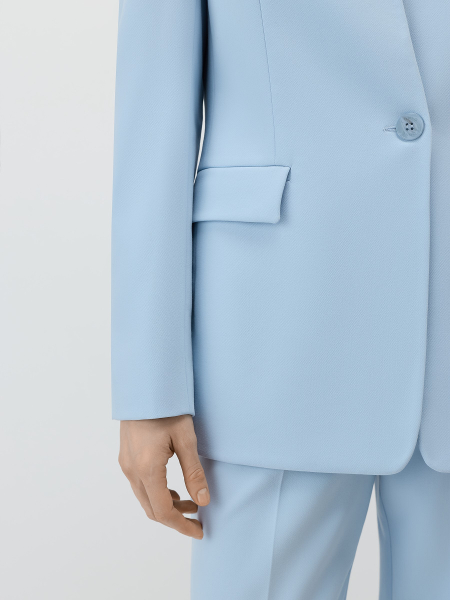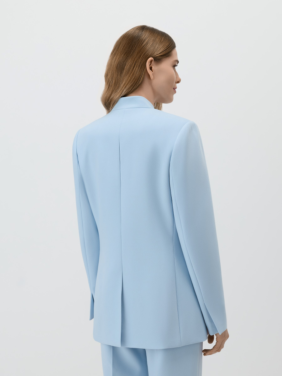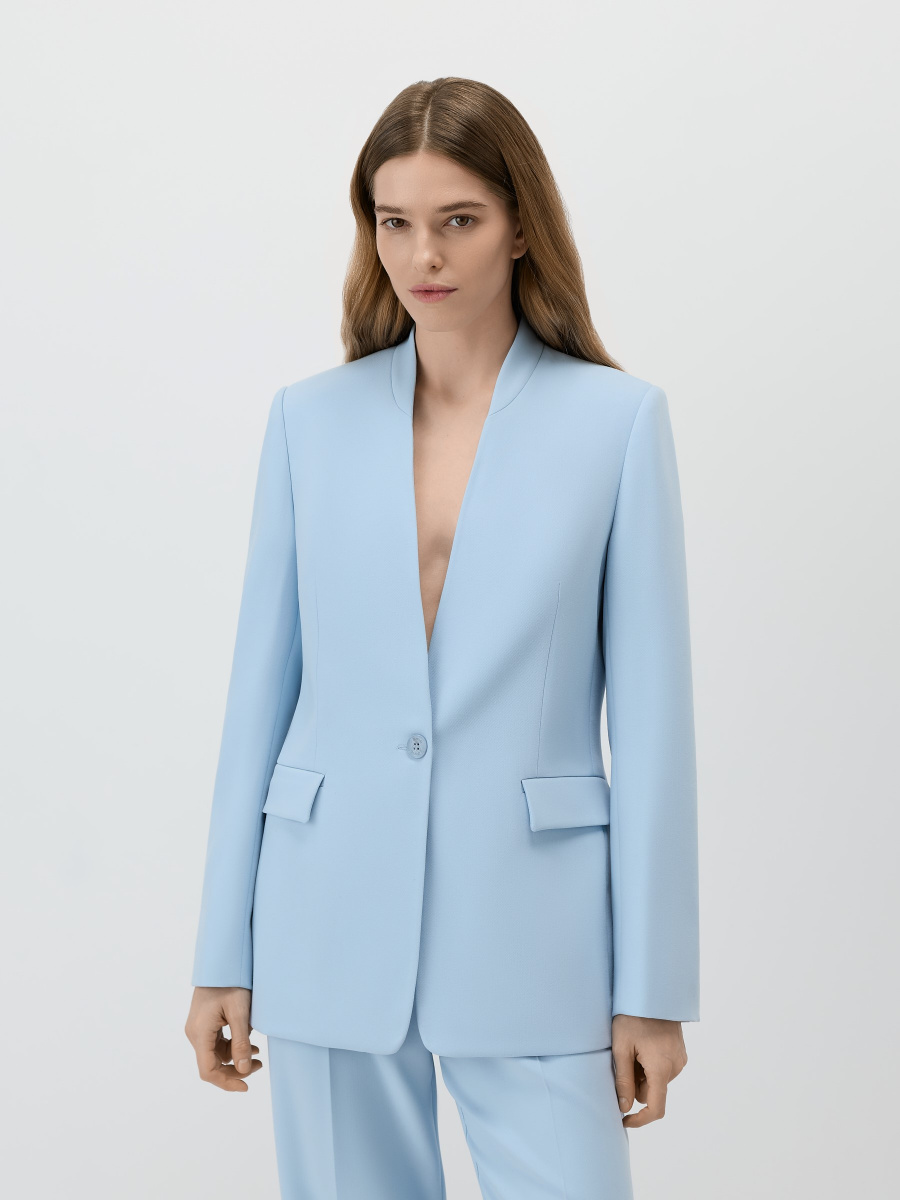 Однобортный полуприлегающий жакет из немнущейся костюмной поливискозы с матовым финишем. Модель без воротника и лацканов, четкого структурного кроя с мягкими подплечниками, центральным швом на спинке и двухшовными рукавами. Жакет дополнен прорезными карманами с клапанами, шлицей и шелковистой подкладкой в тон. Застежка на пуговицу под рог в тон изделия.
