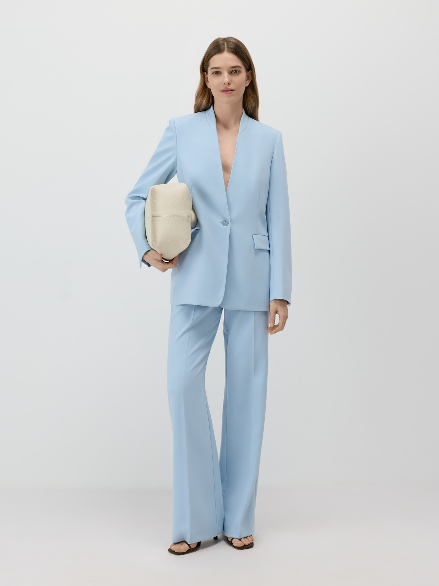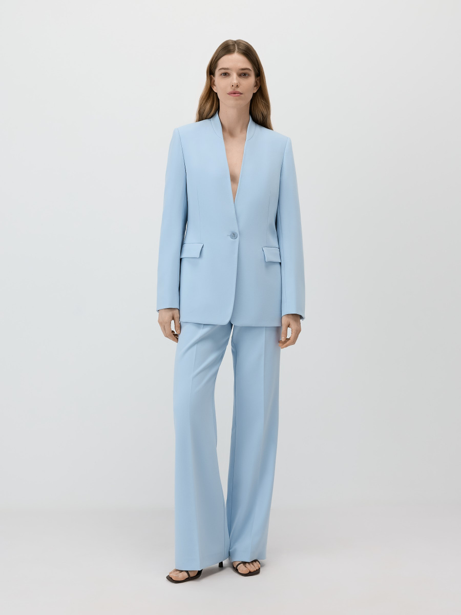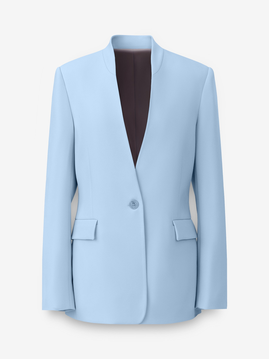 Однобортный полуприлегающий жакет из немнущейся костюмной поливискозы с матовым финишем. Модель без воротника и лацканов, четкого структурного кроя с мягкими подплечниками, центральным швом на спинке и двухшовными рукавами. Жакет дополнен прорезными карманами с клапанами, шлицей и шелковистой подкладкой в тон. Застежка на пуговицу под рог в тон изделия.