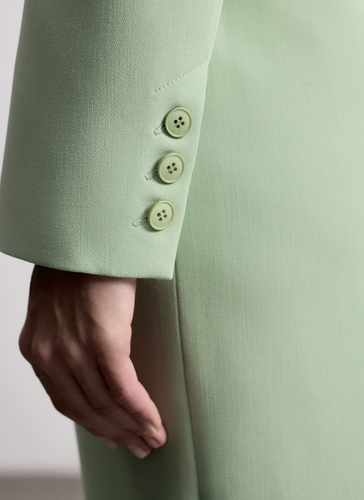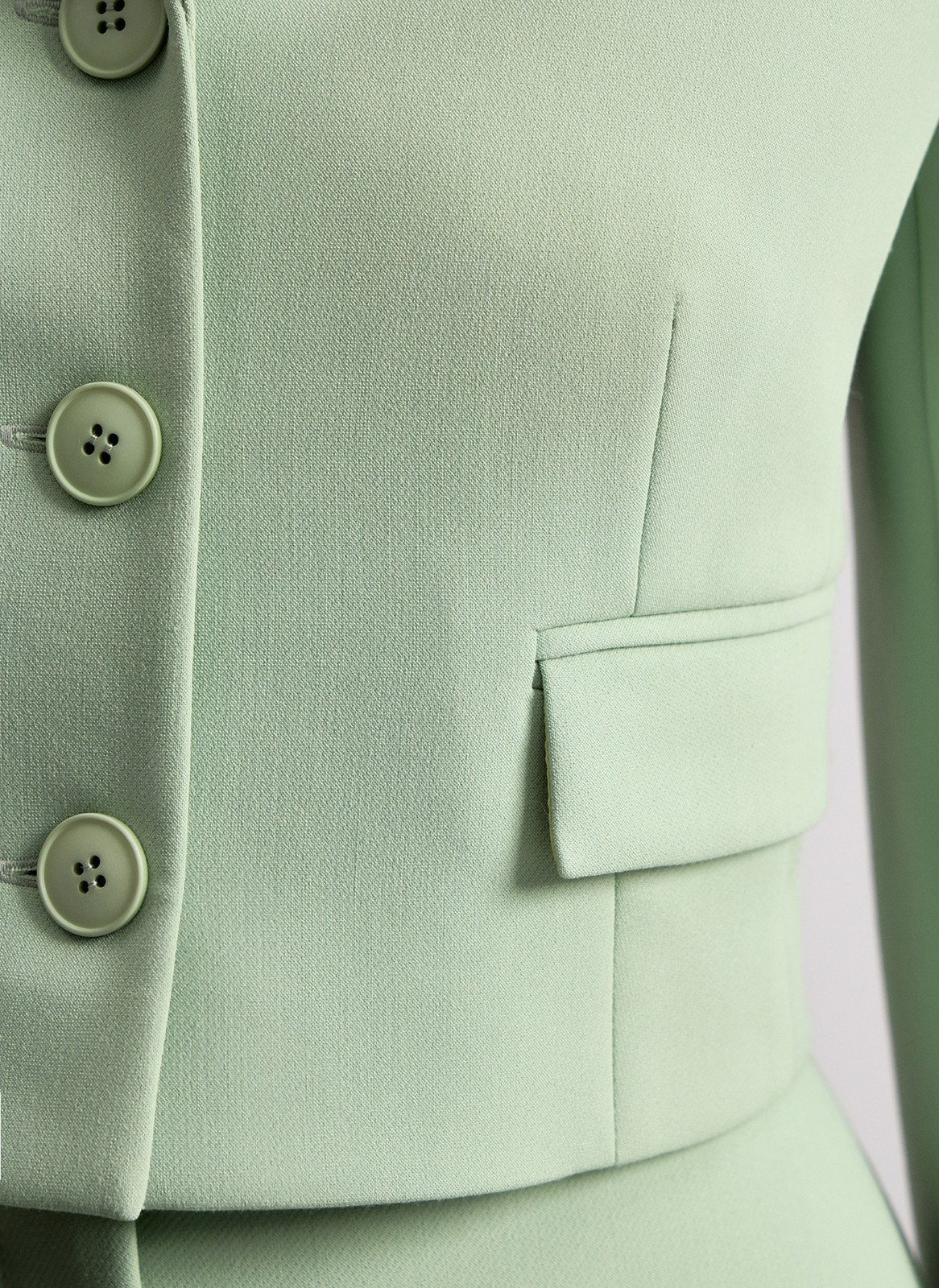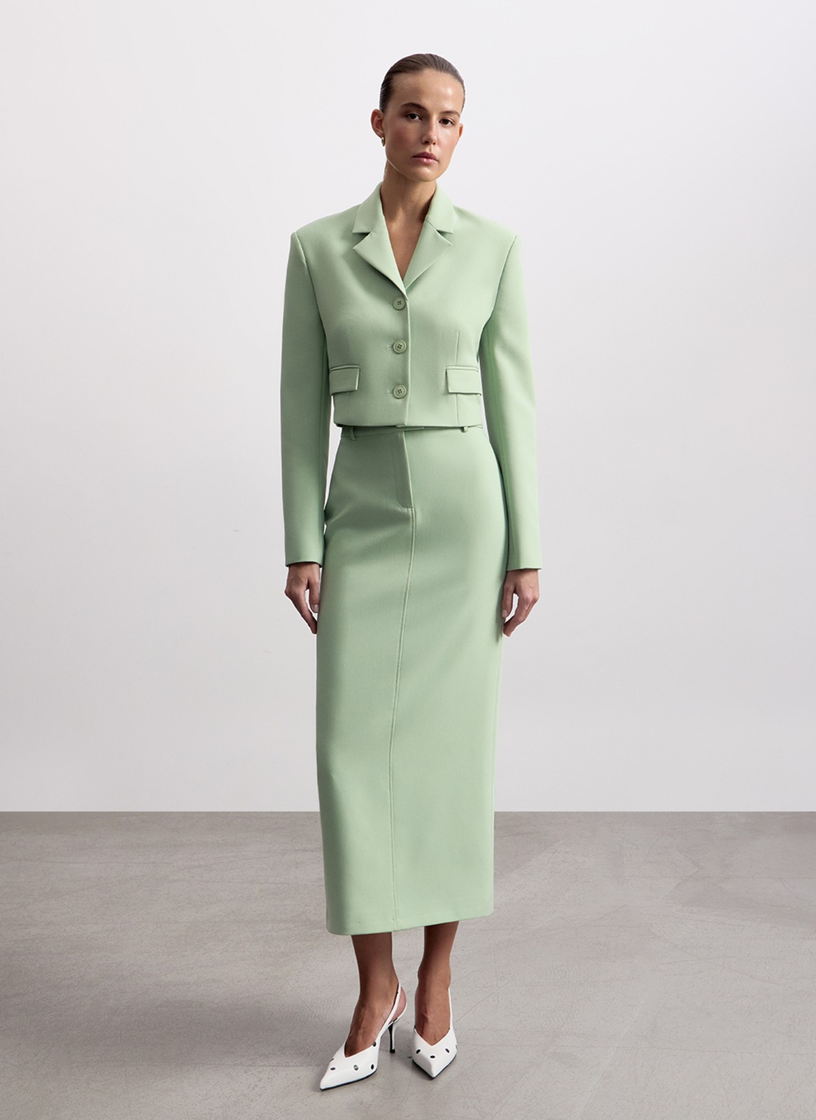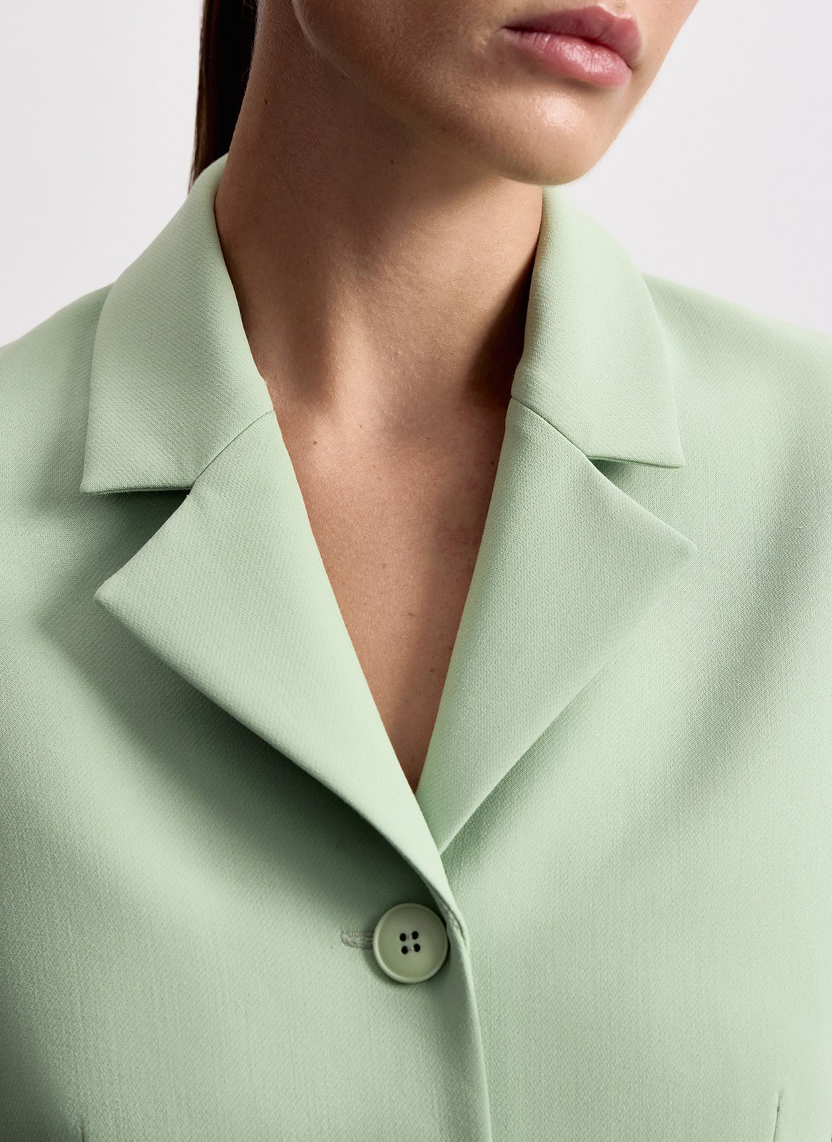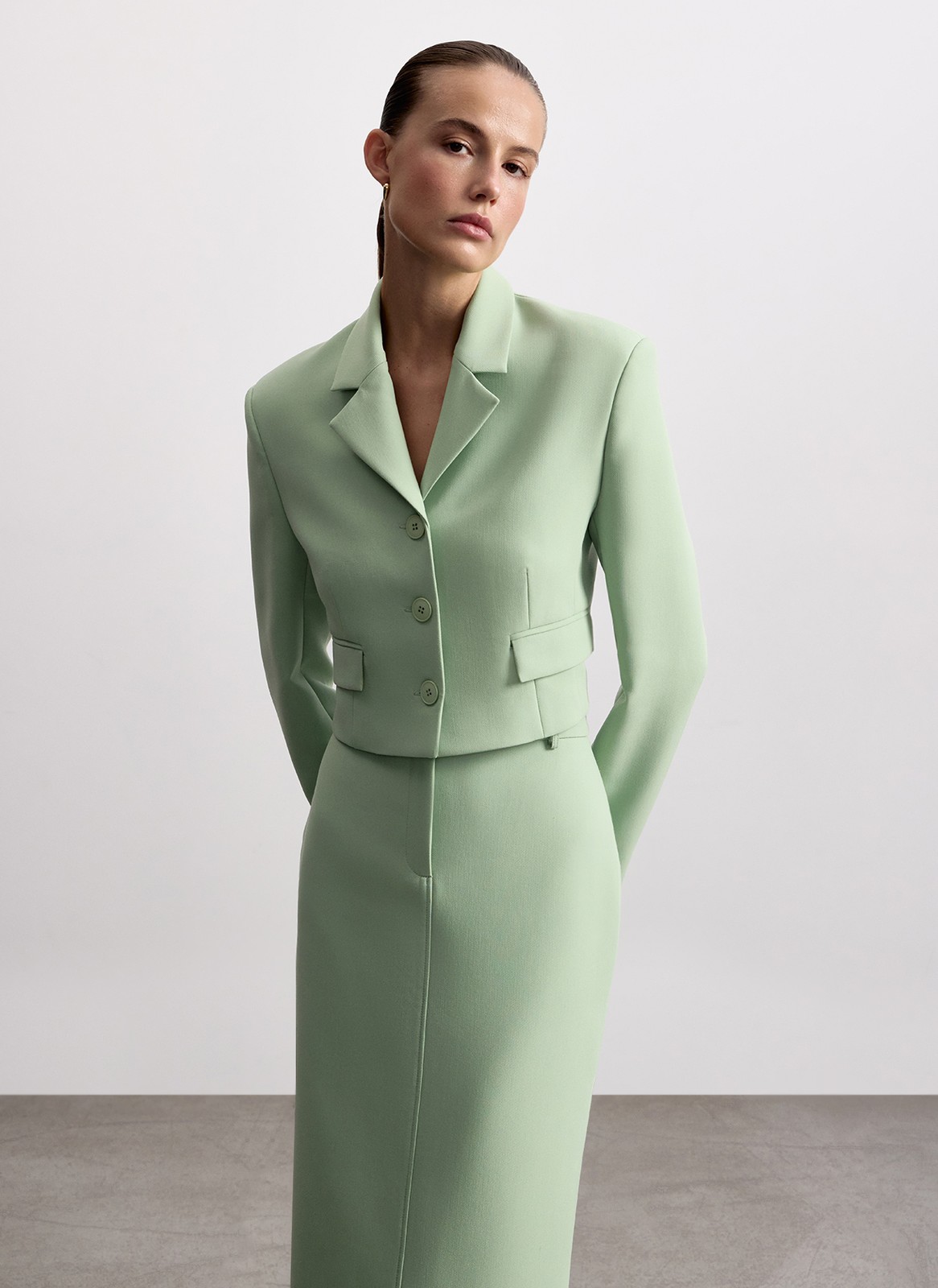 Укороченный однобортный крой подчёркивает талию и прекрасно смотрится с брюками с высокой посадкой. Линия плеч формирует чёткий и актуальный силуэт.