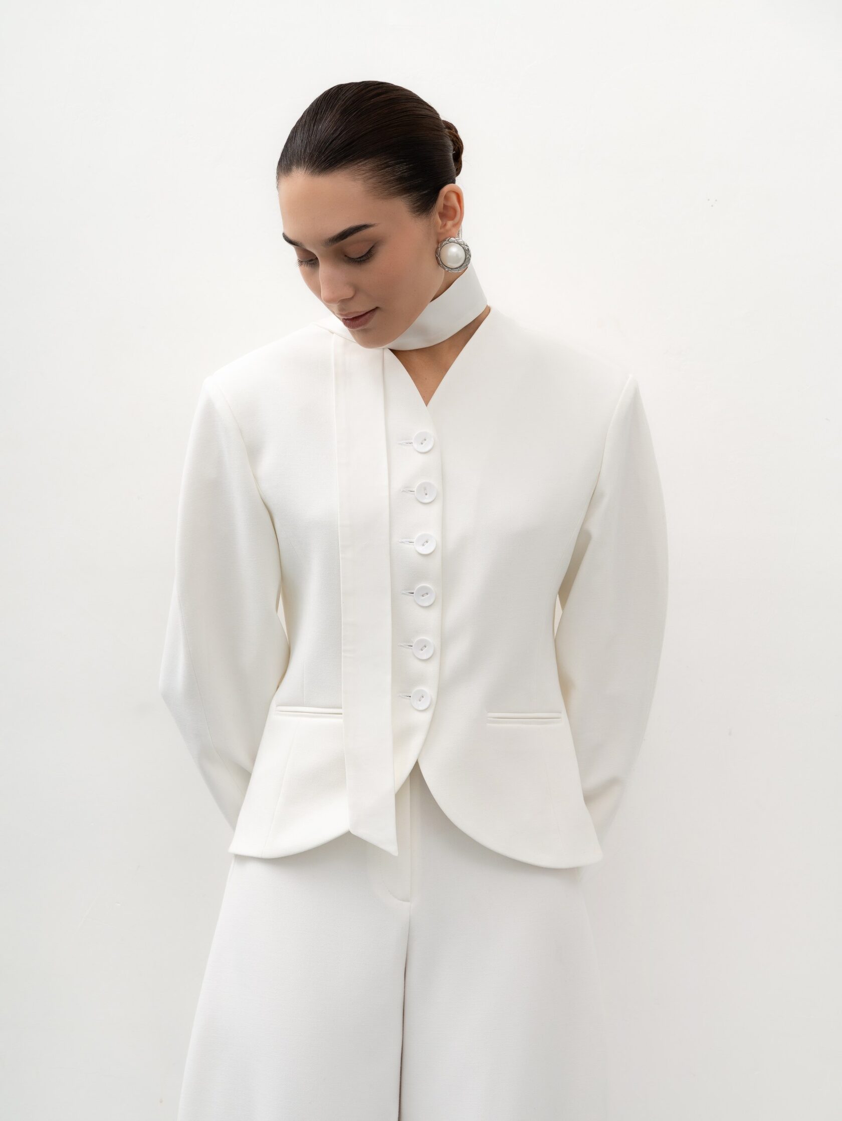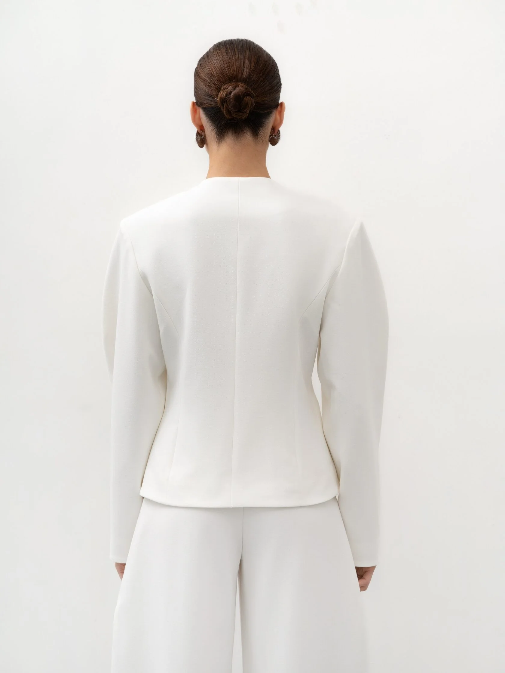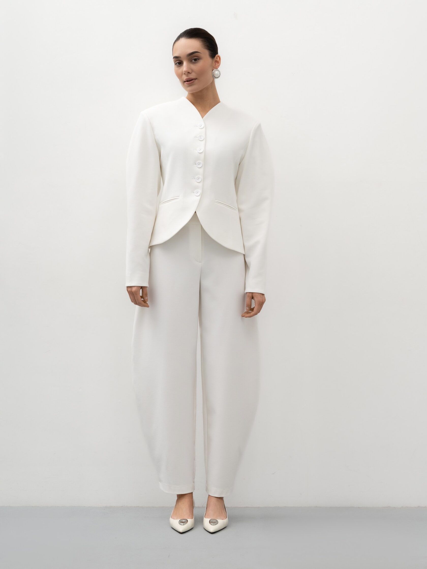 Светлый оттенок легко вписывается в гардероб: жакет гармонично смотрится с брюками, юбками и платьями, создавая стильные офисные образы. В вечерних сочетаниях он добавляет образу легкости и изящества, оставаясь лаконичным, но выразительным акцентом.