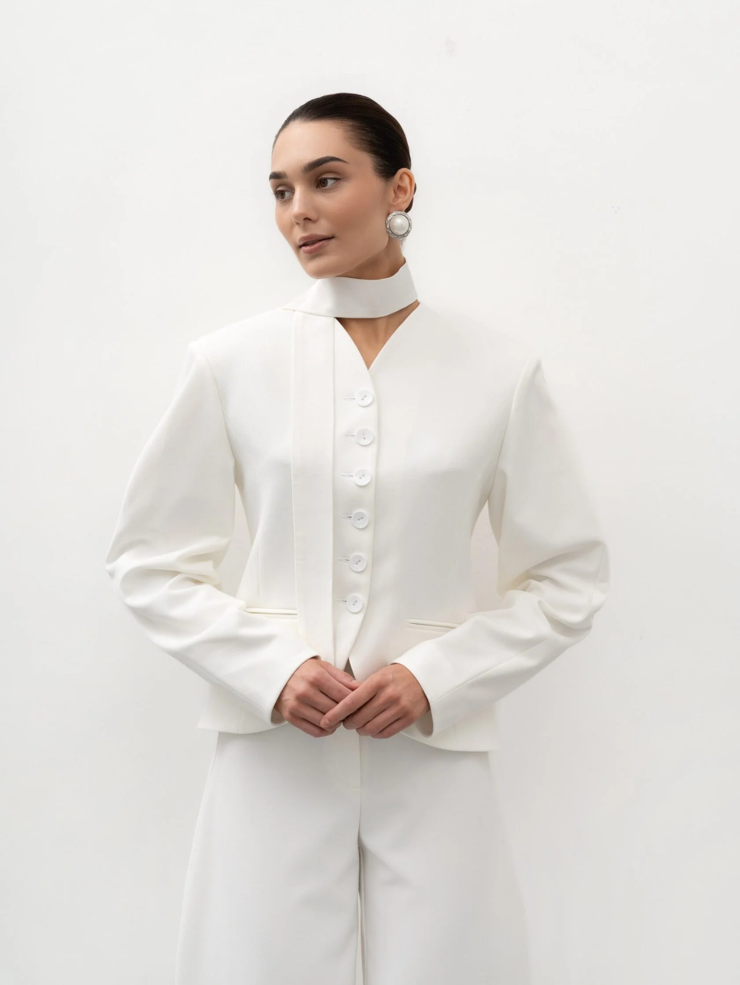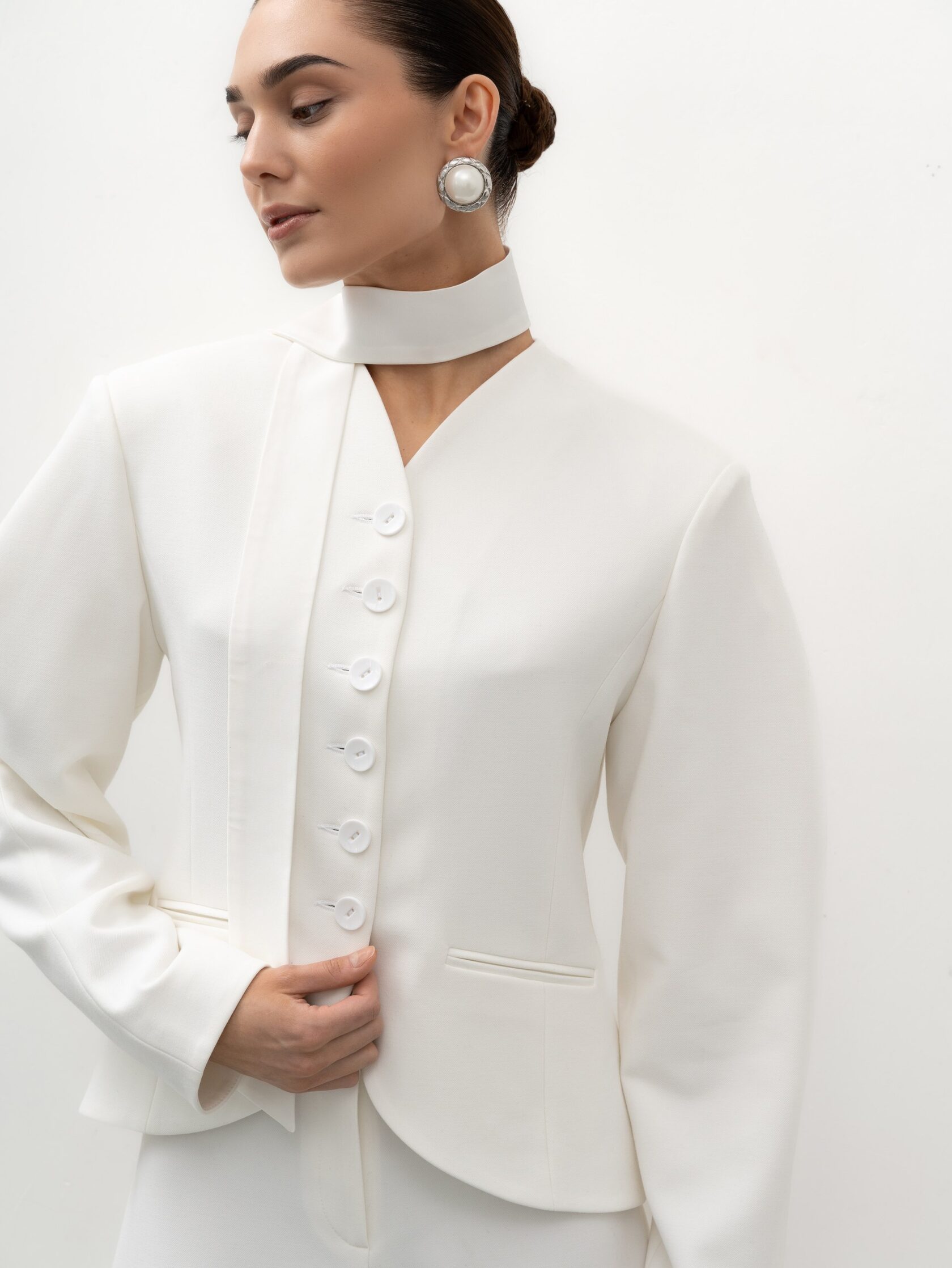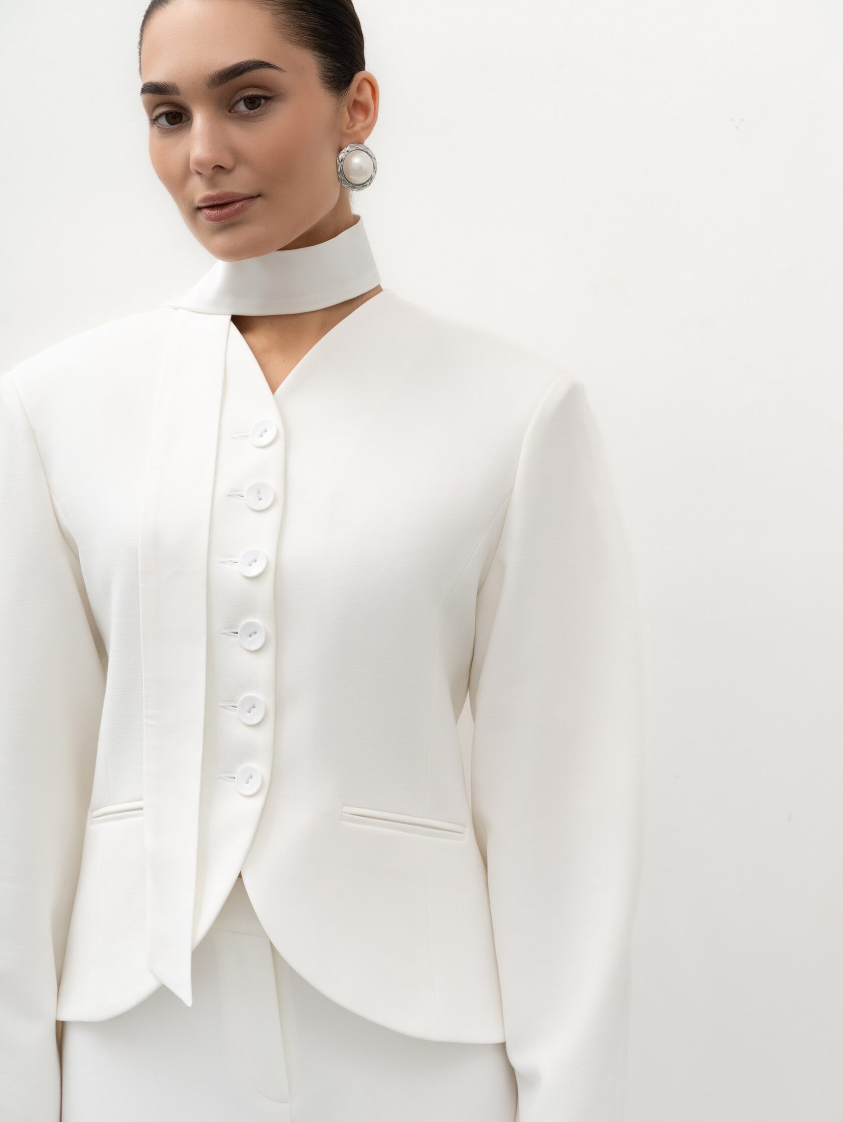 Светлый оттенок легко вписывается в гардероб: жакет гармонично смотрится с брюками, юбками и платьями, создавая стильные офисные образы. В вечерних сочетаниях он добавляет образу легкости и изящества, оставаясь лаконичным, но выразительным акцентом.