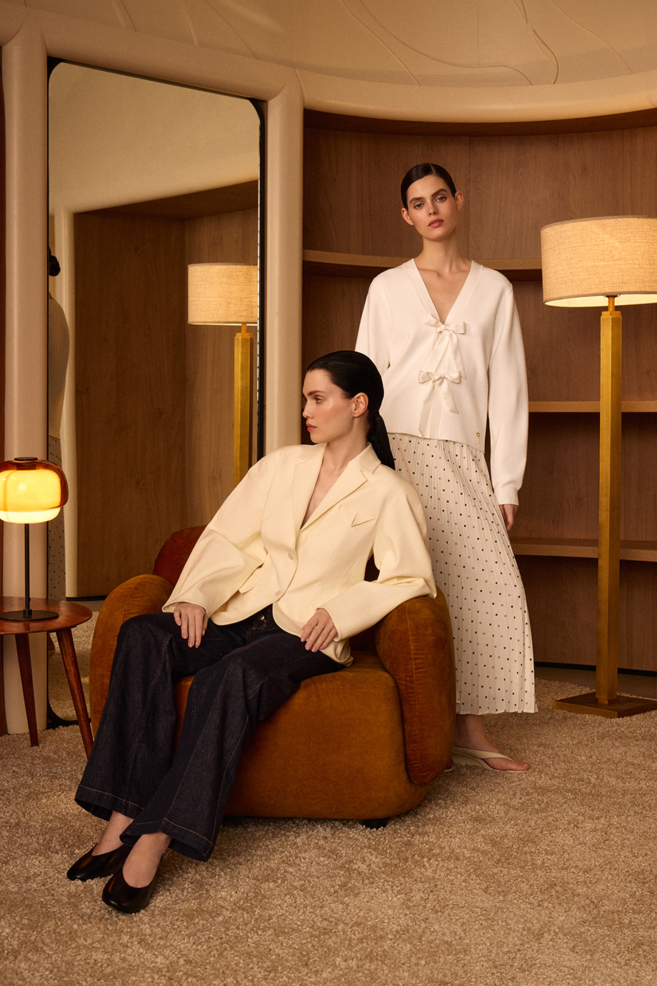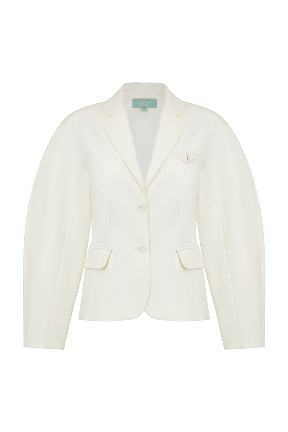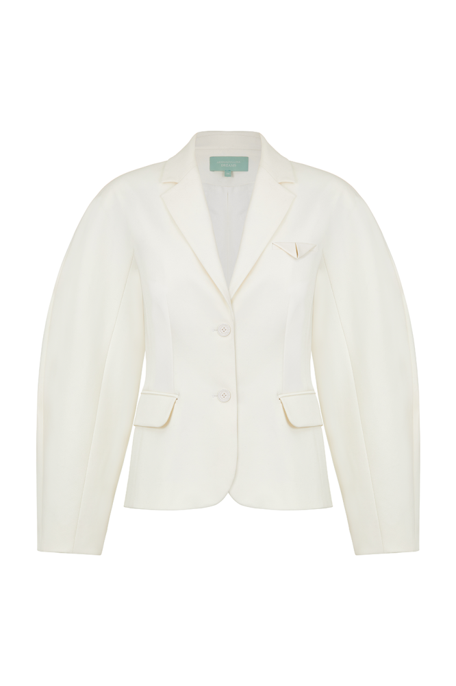 Элегантный жакет с акцентными рукавами выполнен в белом оттенке. Приталенная модель с английским воротником дополнена крупными накладными карманами.