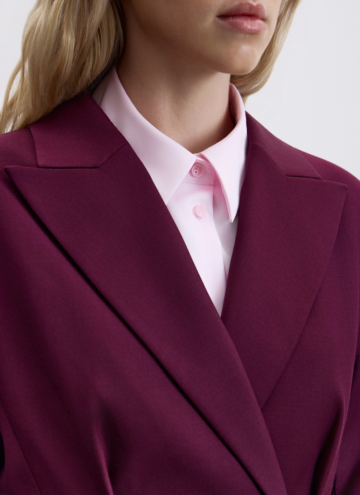 Приталенная модель с увеличенной линией плеч и акцентом на талии формирует эффектный силуэт «песочные часы».