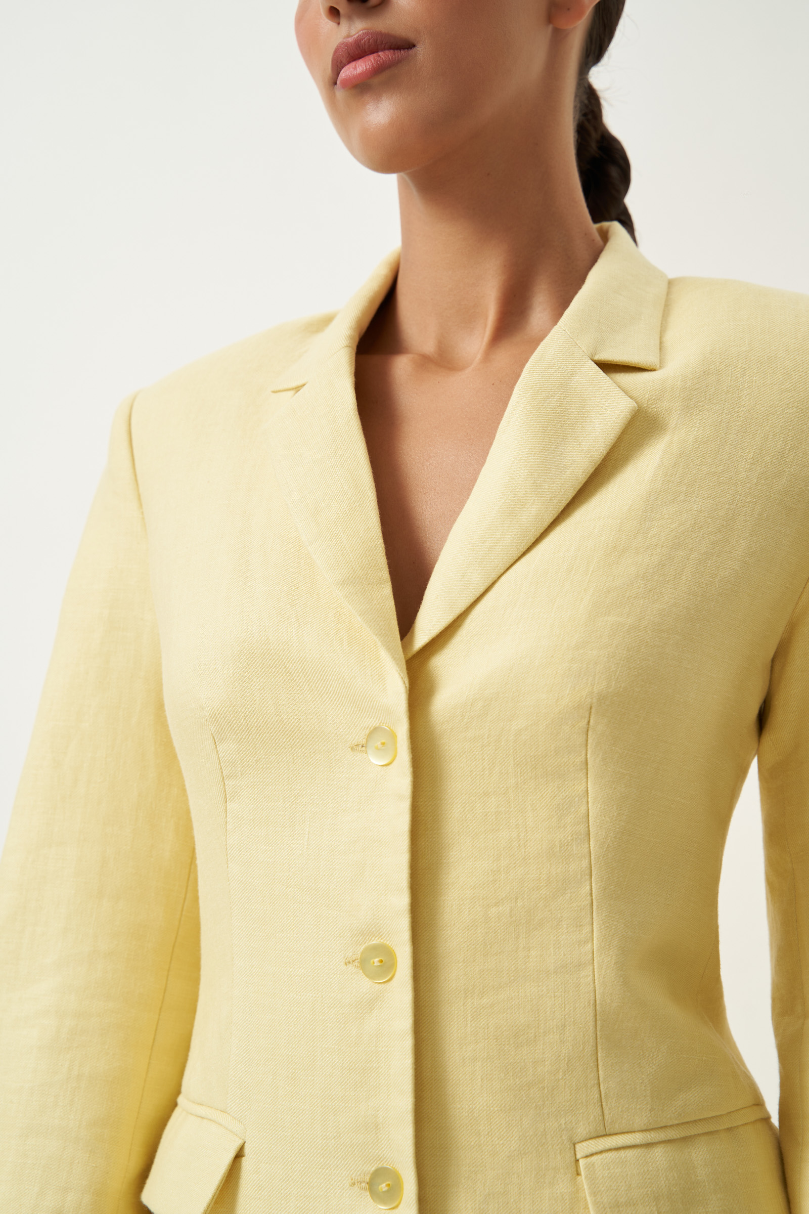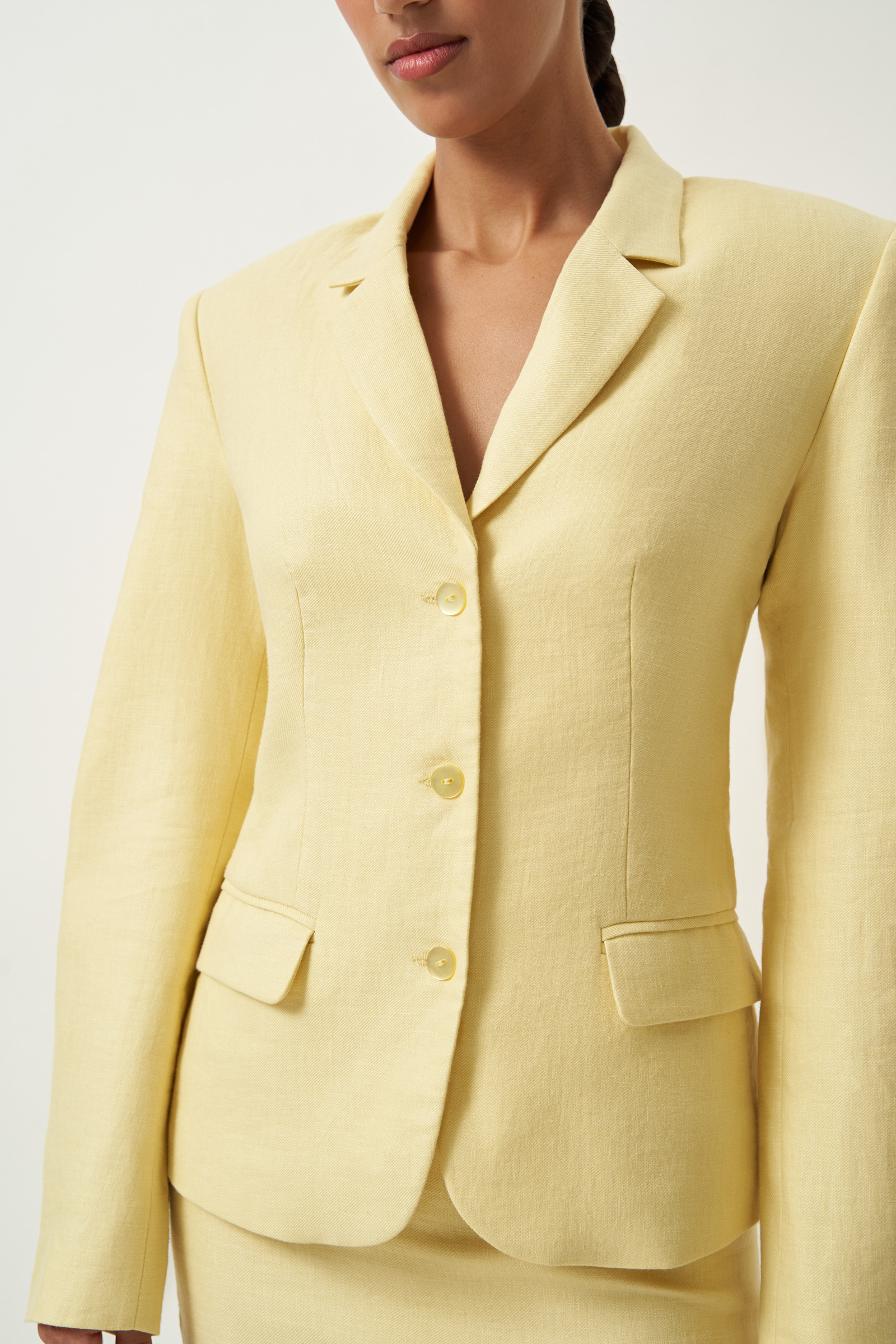 Лаконичный и легкий жакет из льна: мягкий о-образный силуэт, застежка на три пуговицы, прорезные карманы с клапанами. Ткань пластичная, прочная, с характерным твиловым переплетением и приятным блеском. На передней половине и спинке вертикальные формообразующие вытачки. Изделие на подкладке.