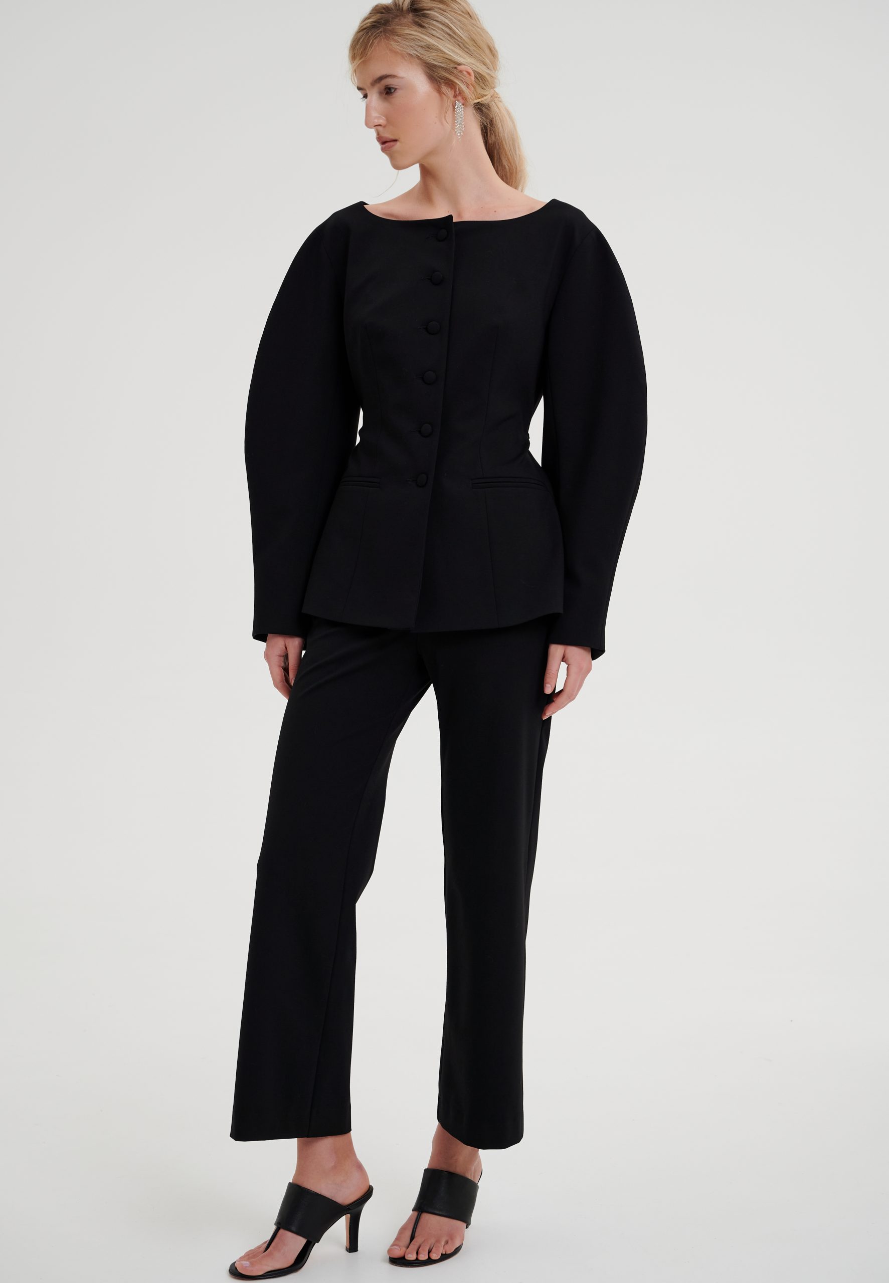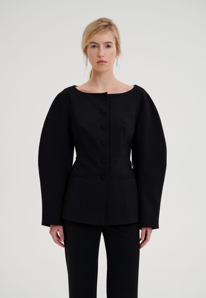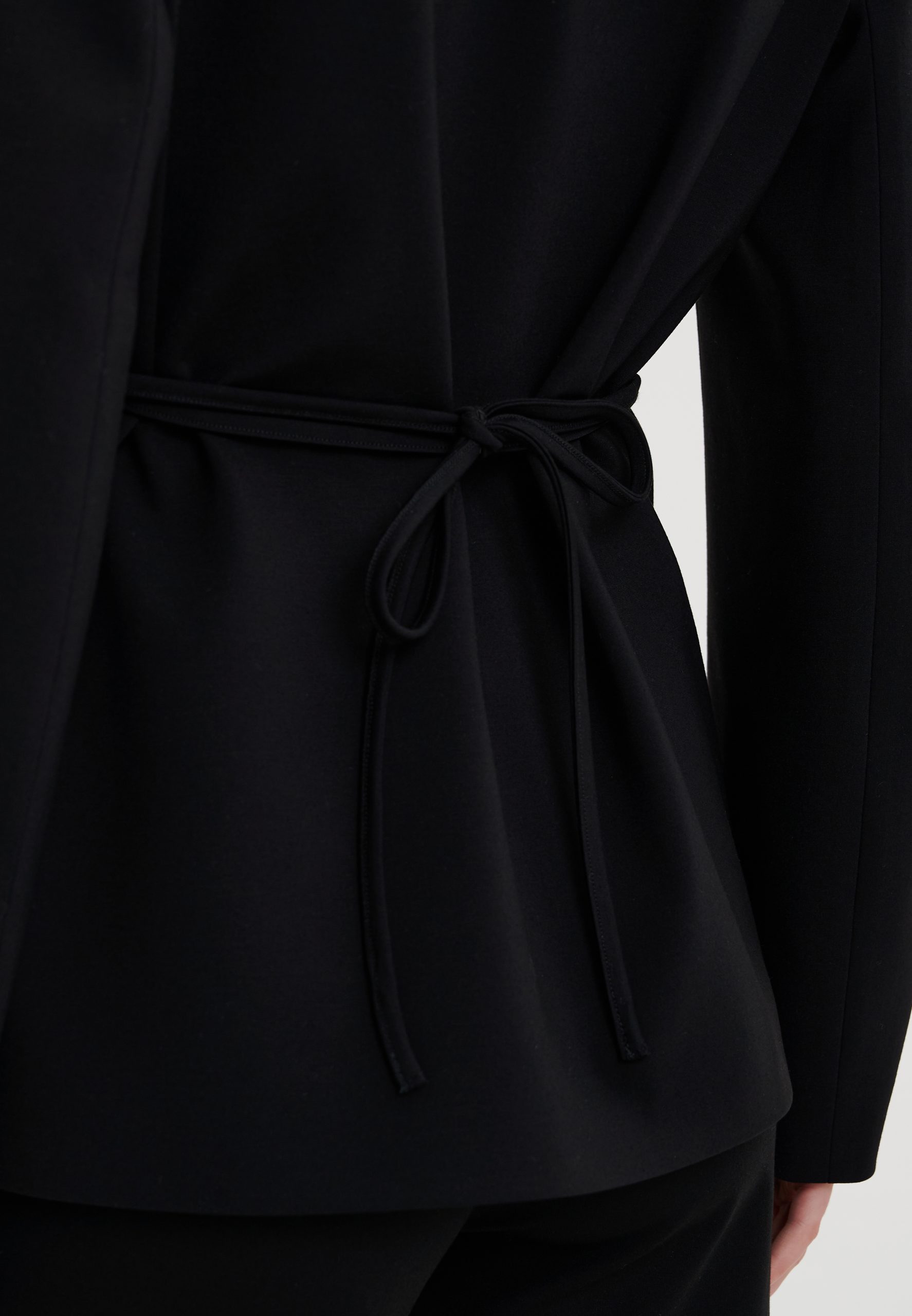 Пиджак приталенного силуэта полуприлегающего кроя выполнен из мягкой костюмной ткани в черном оттенке. Завязка на спинке позволяет регулировать посадку и красиво подчеркивает линию талии, создавая изящный силуэт. Округлые гипертрофированные рукава добавляют образу выразительности и легкой архитектурности, а отсутствие плечиков делает линию плеч мягкой и естественной. Застегивается на обтяжные пуговицы, обработан подкладом из вискозы. Идеальный вариант для тех, кто ценит баланс структуры и женственности.
