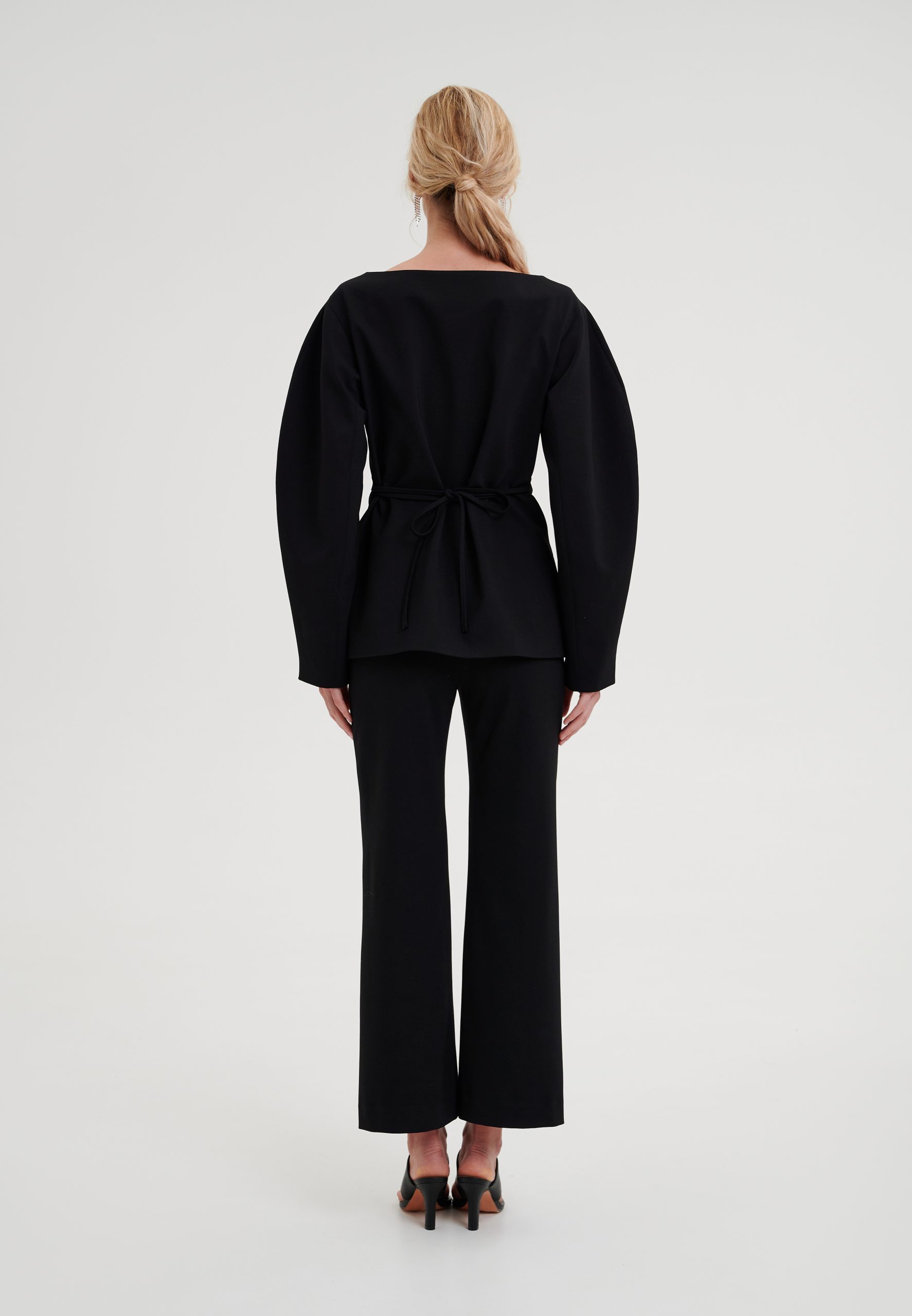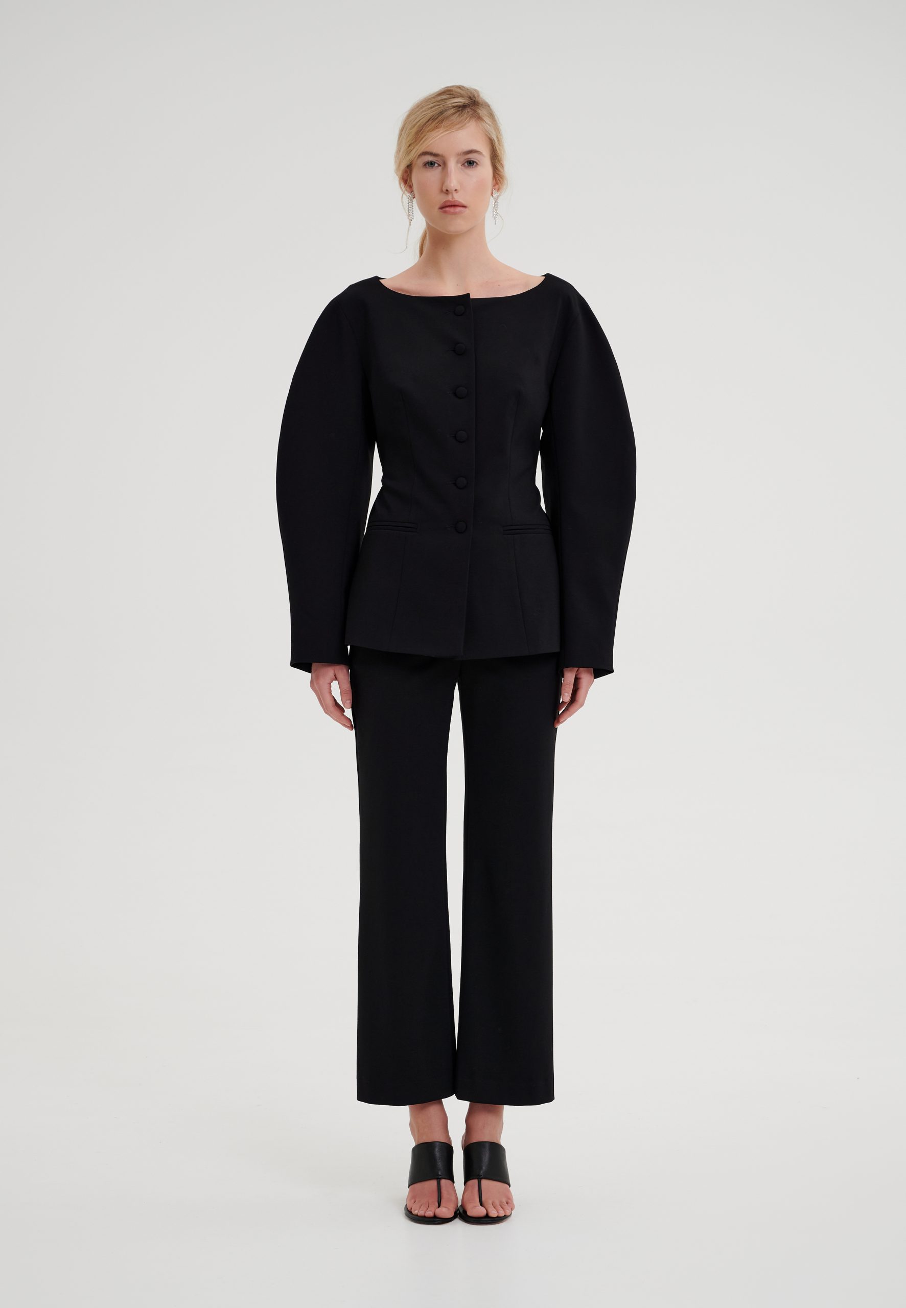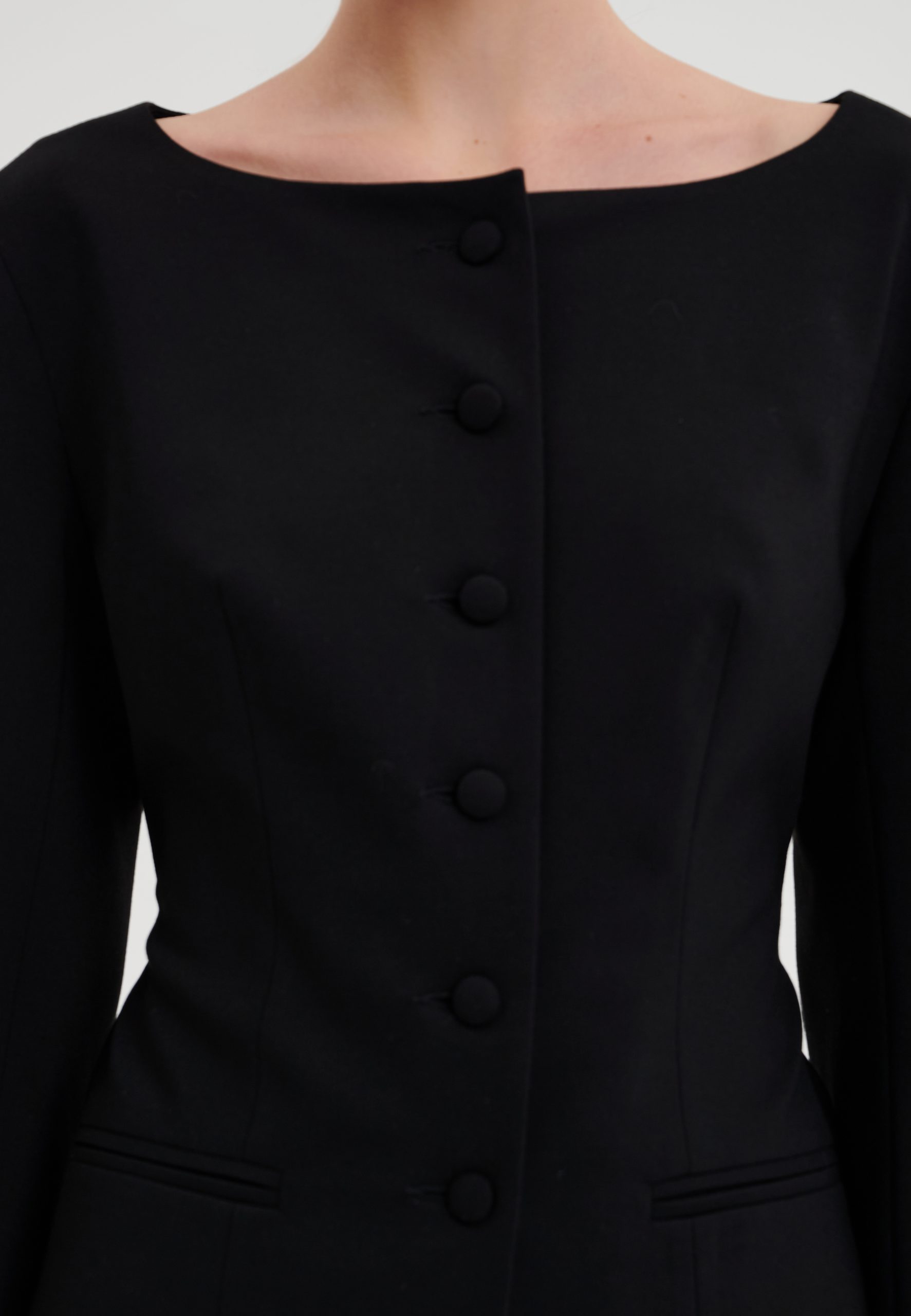 Пиджак приталенного силуэта полуприлегающего кроя выполнен из мягкой костюмной ткани в черном оттенке. Завязка на спинке позволяет регулировать посадку и красиво подчеркивает линию талии, создавая изящный силуэт. Округлые гипертрофированные рукава добавляют образу выразительности и легкой архитектурности, а отсутствие плечиков делает линию плеч мягкой и естественной. Застегивается на обтяжные пуговицы, обработан подкладом из вискозы. Идеальный вариант для тех, кто ценит баланс структуры и женственности.