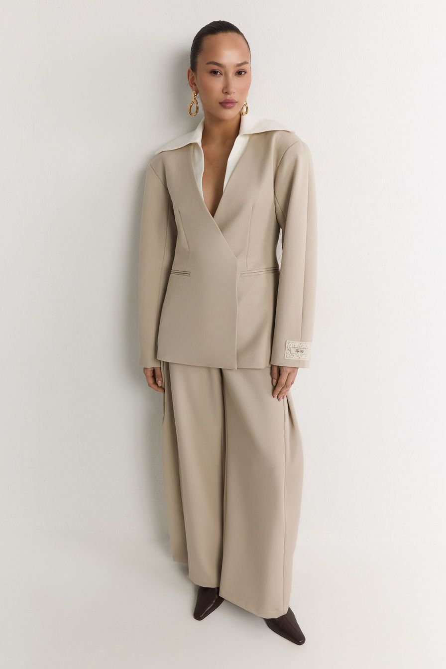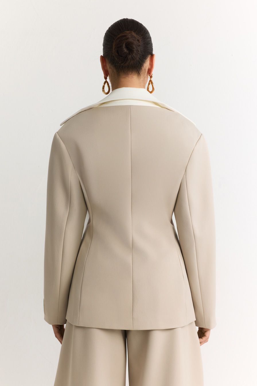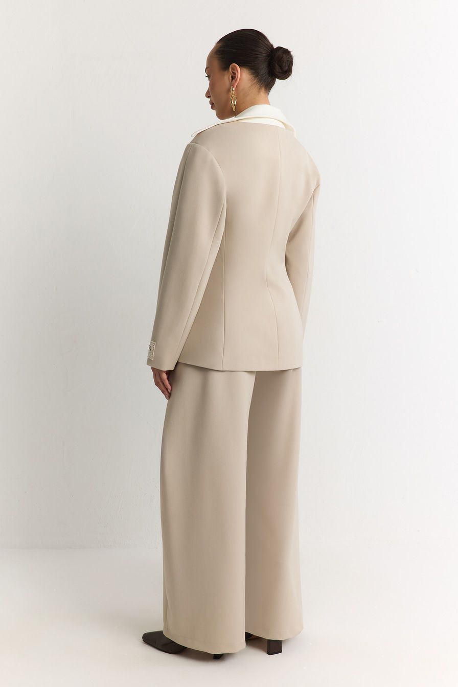 Двубортный молочный жакет со скрытой застежкой – модель приталенного кроя. Жакет выполнен из смесовой ткани с добавлением района – материала на основе целлюлозы. Модель дополнена контрастным отложным воротником.