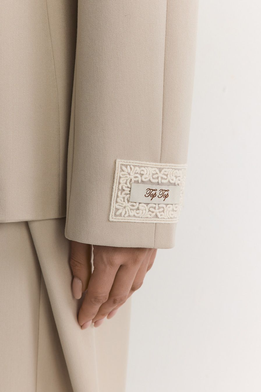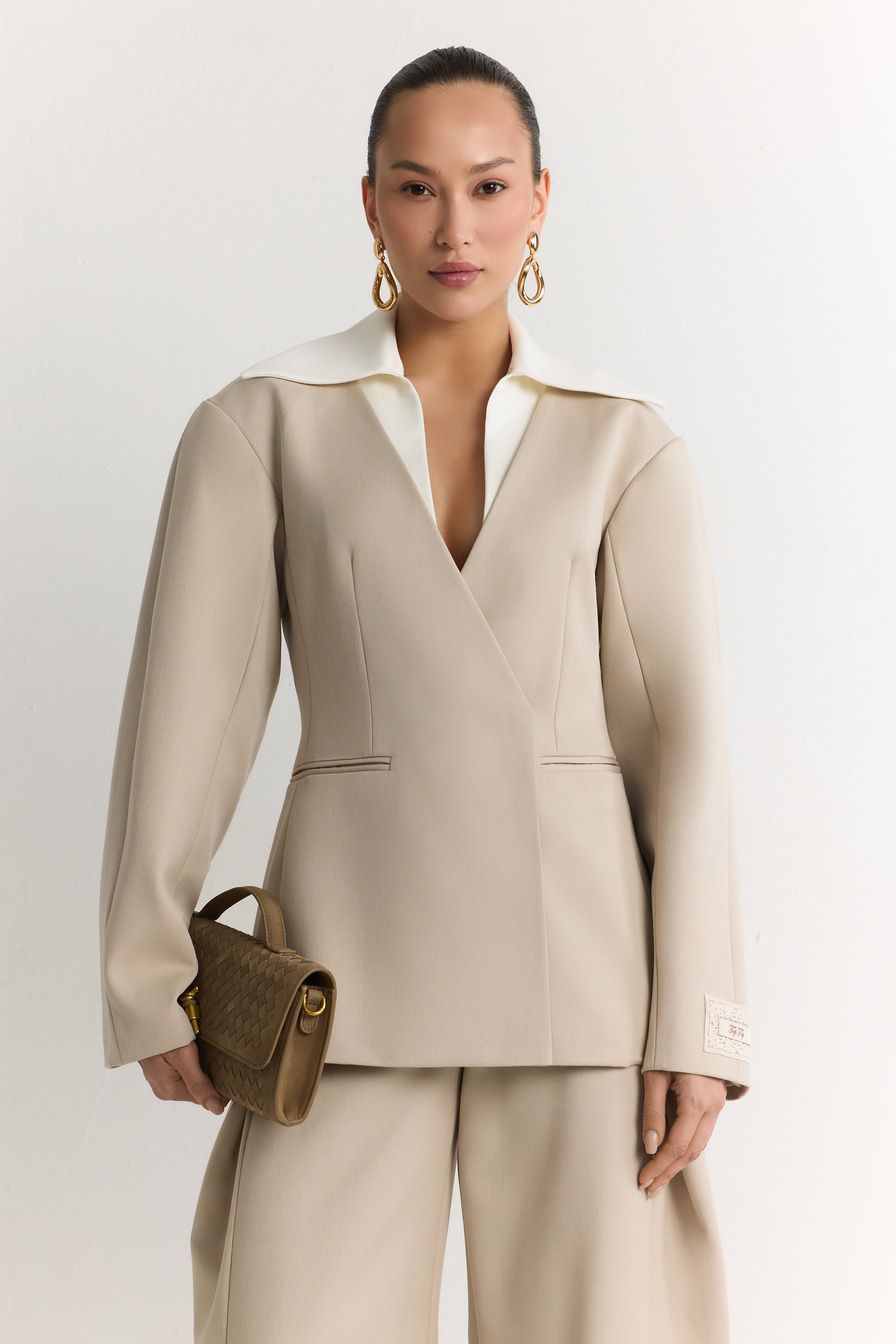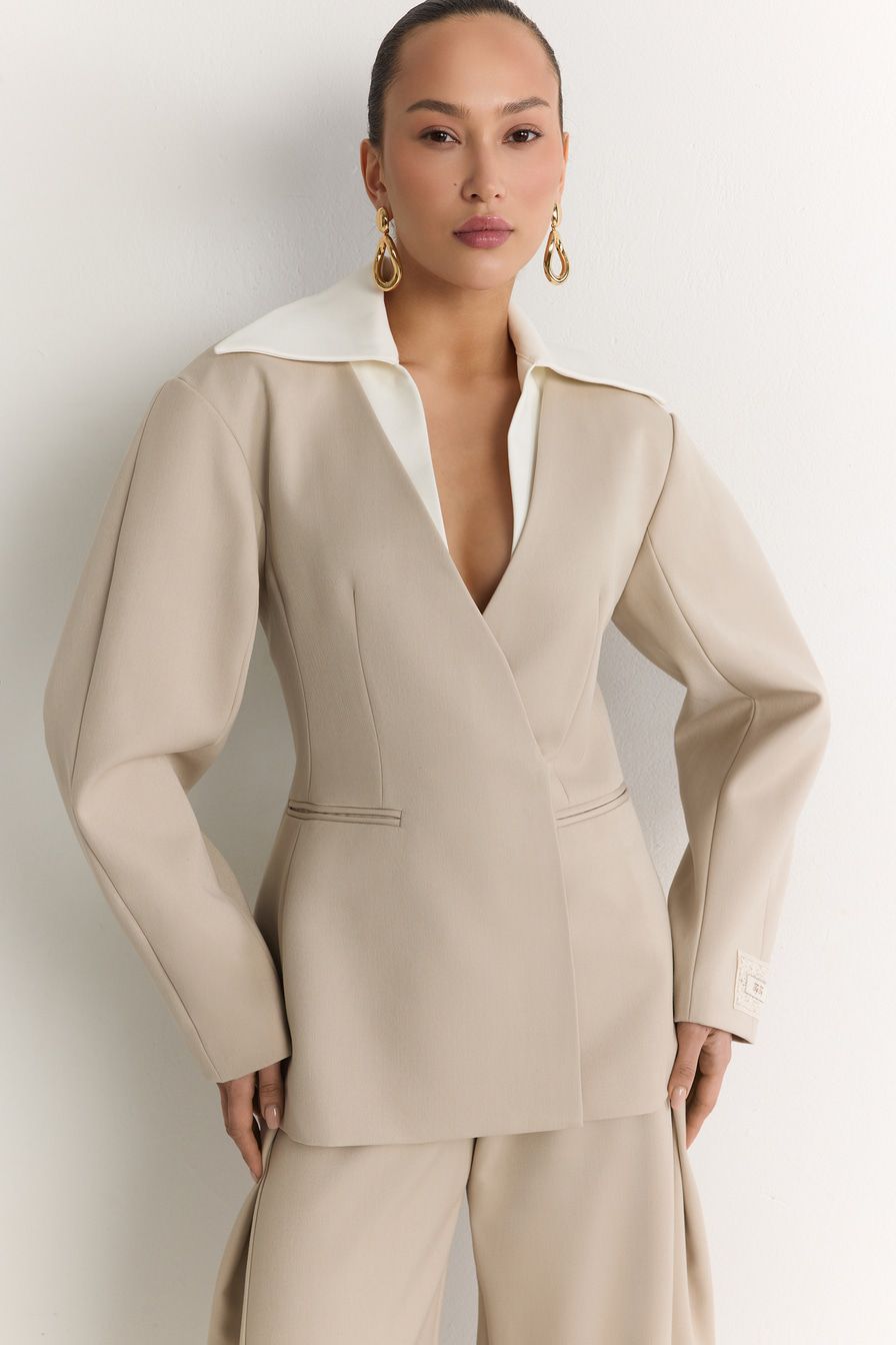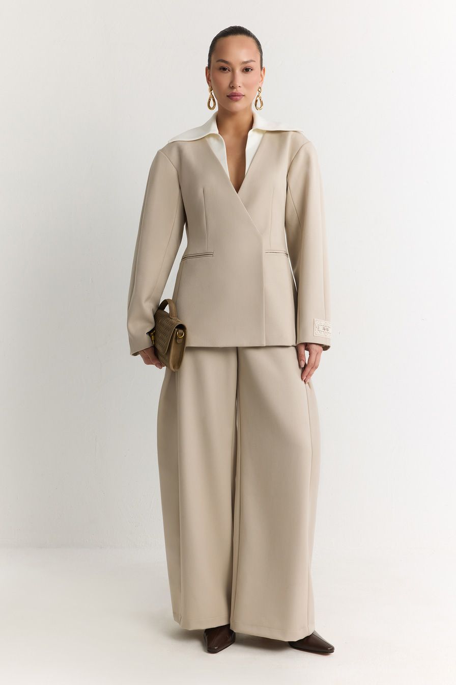 Двубортный молочный жакет со скрытой застежкой – модель приталенного кроя. Жакет выполнен из смесовой ткани с добавлением района – материала на основе целлюлозы. Модель дополнена контрастным отложным воротником.