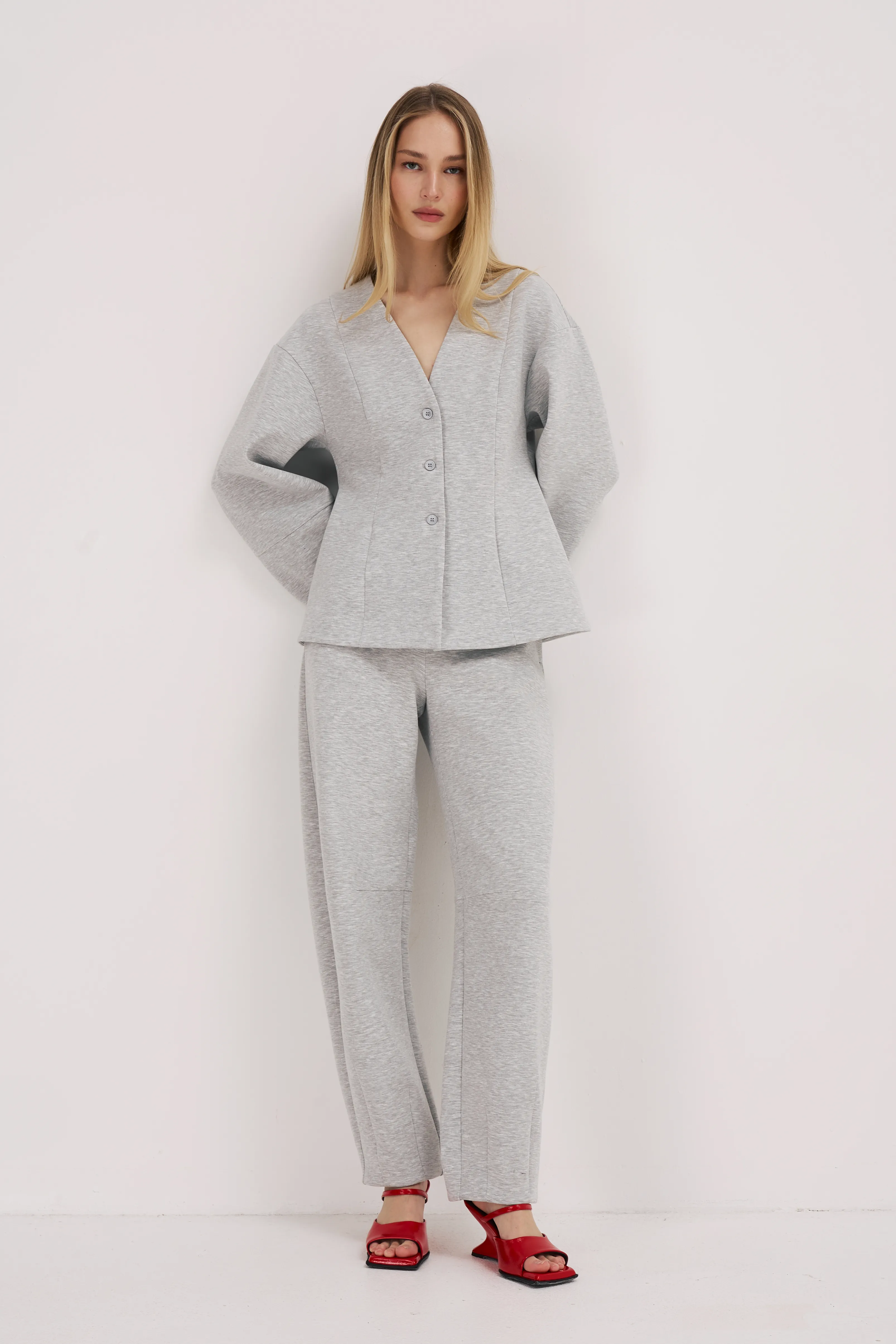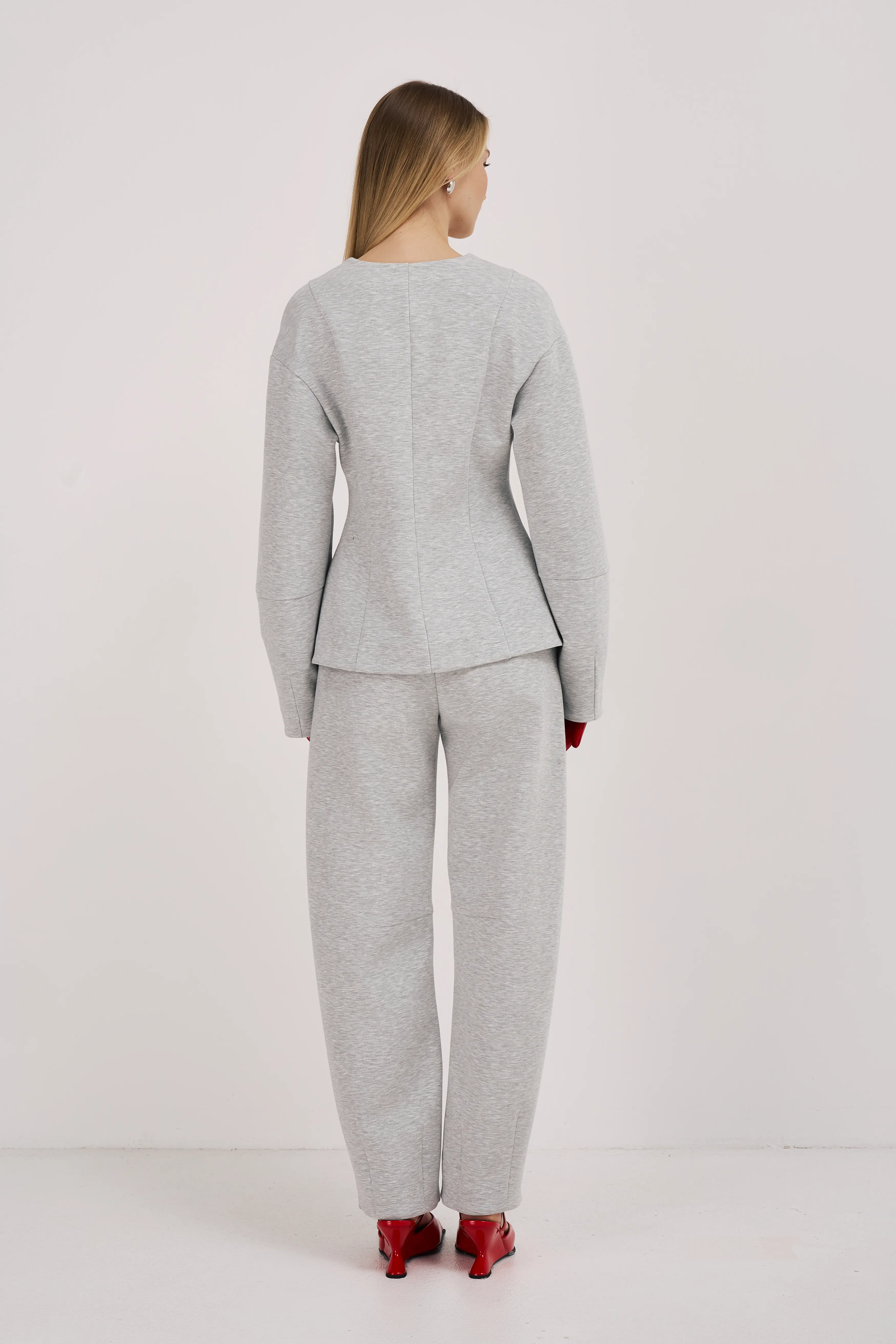 Приталенный жакет без лацканов. Создает лаконичный комплект с брюками из аналогичной ткани.