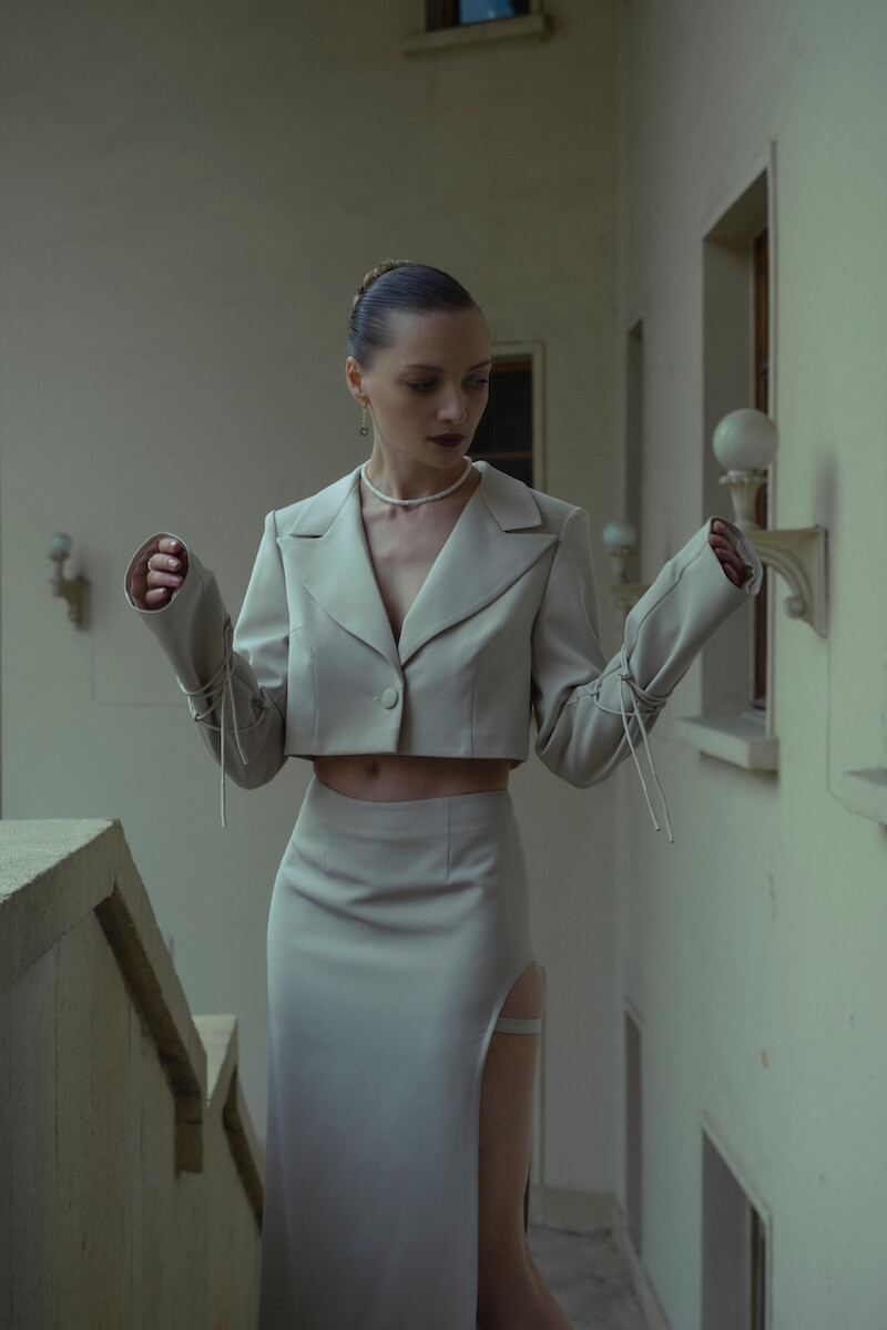 Укороченный бежевый пиджак — это стильный и универсальный элемент гардероба, который легко сочетается с различными предметами одежды. Он станет отличным дополнением к вашему образу и добавит нотку элегантности. Например, вы можете надеть его с юбкой с разрезом, чтобы создать модный и женственный ансамбль.