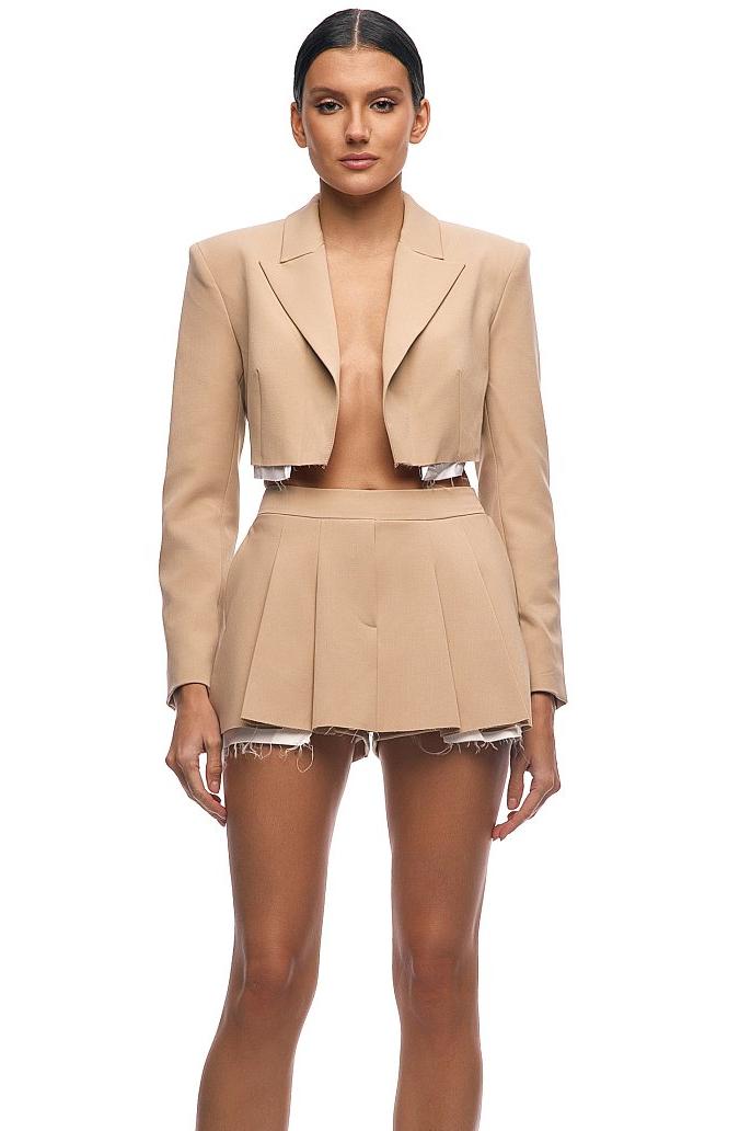 Укороченный жакет в бежевом цвете — идеальный выбор для создания стильного и непринуждённого образа. Необработанный низ добавляет изделию оригинальности и лёгкости. Жакет станет отличным дополнением к вашему гардеробу и позволит выразить индивидуальность.
