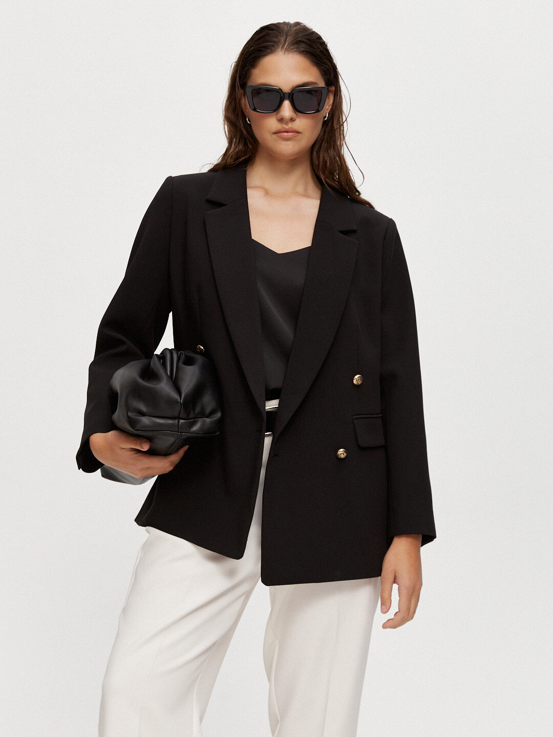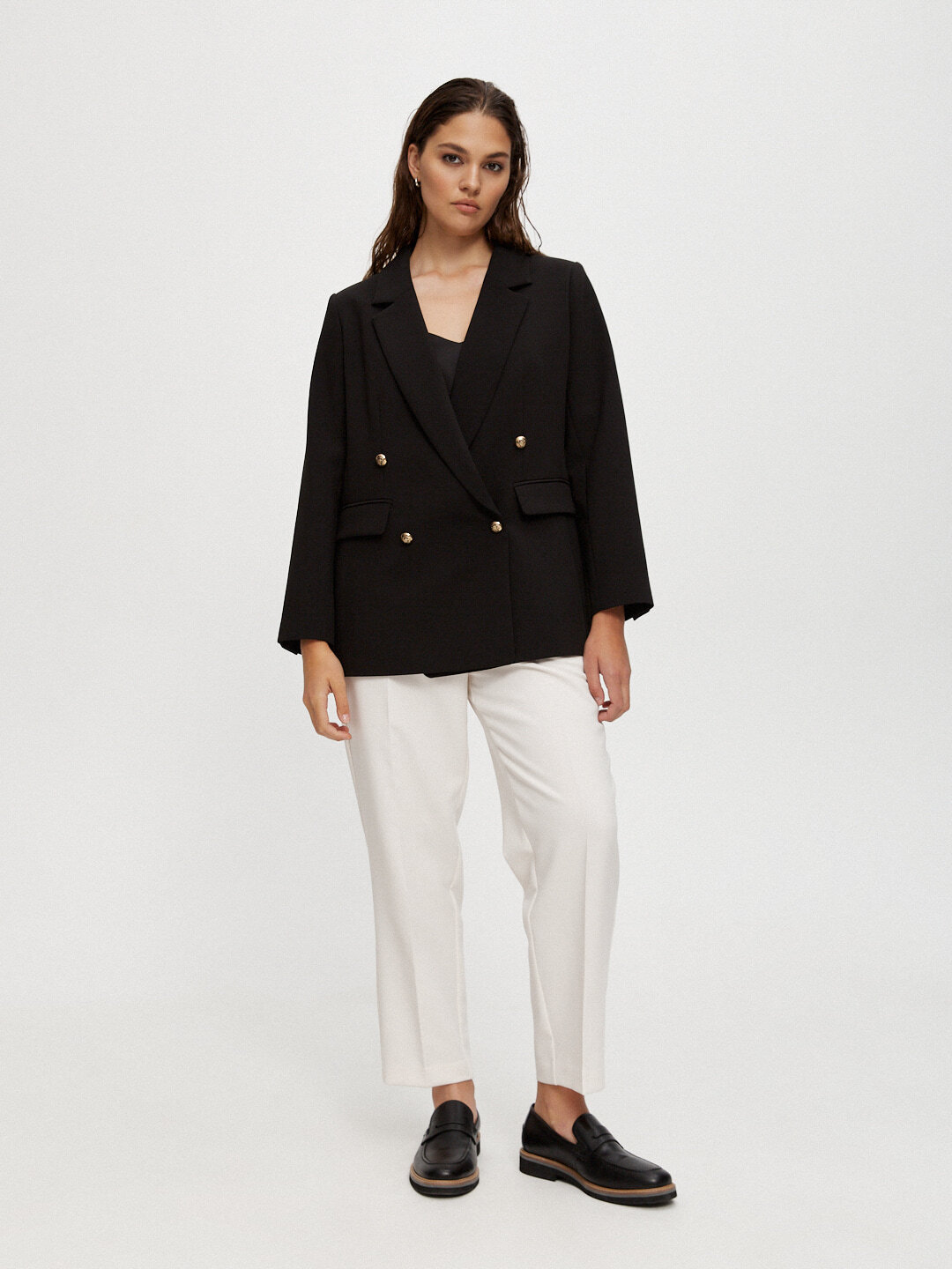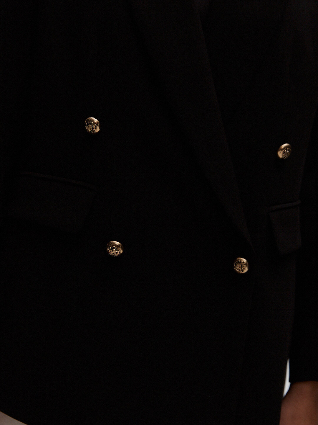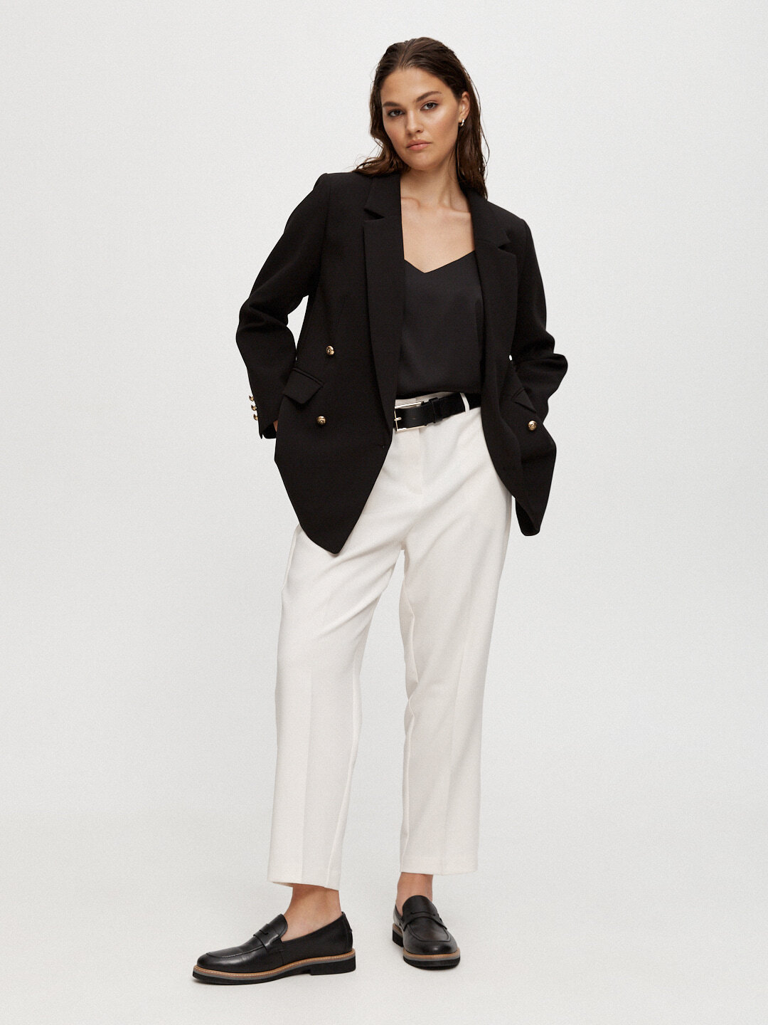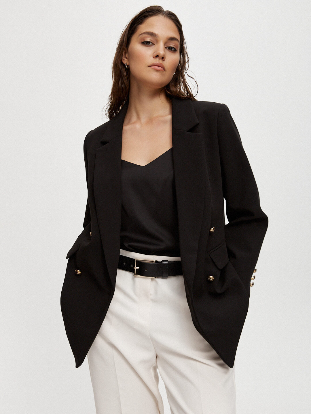 Прямой укороченный двубортный жакет — нестареющая классика, одна из самых универсальных моделей. Правильной длины и конструктива, держит форму. Жакет дополнен аккуратными подплечниками, чтобы он отлично садился на любые типы фигур.