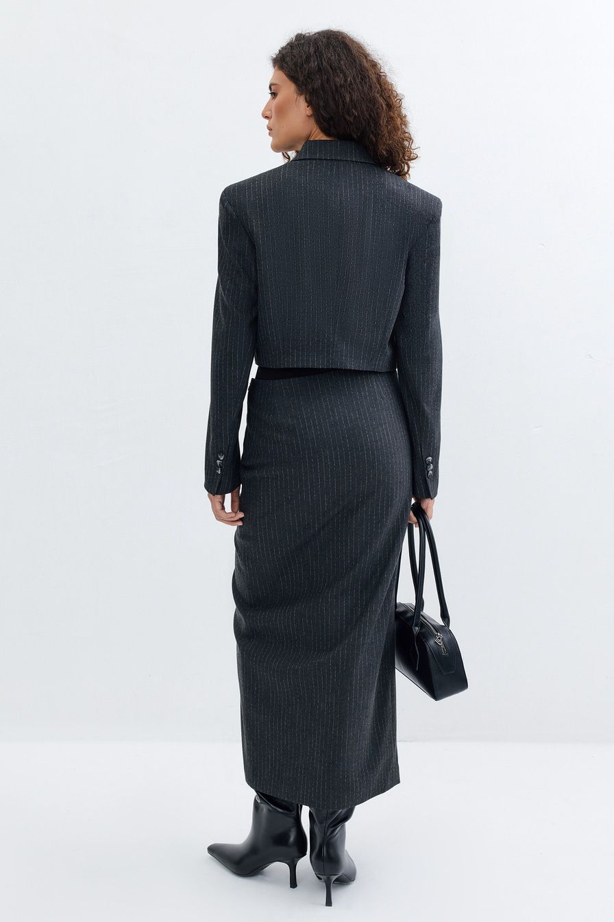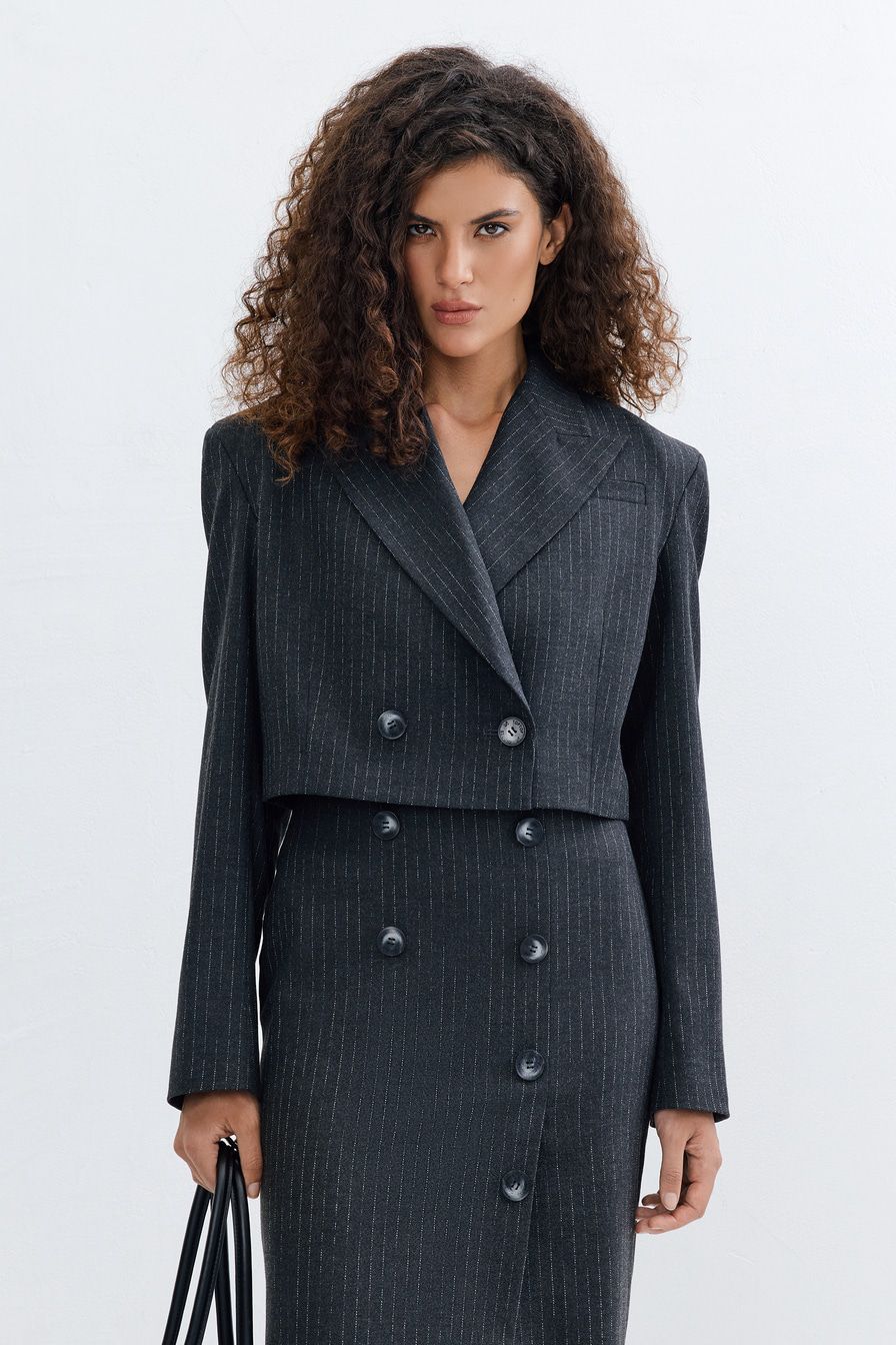 Двубортный кроп-жакет из смесовой вискозы – модель темно-серого цвета с узором «полоска». Жакет дополнен мягкой подкладкой из смесовой вискозы.