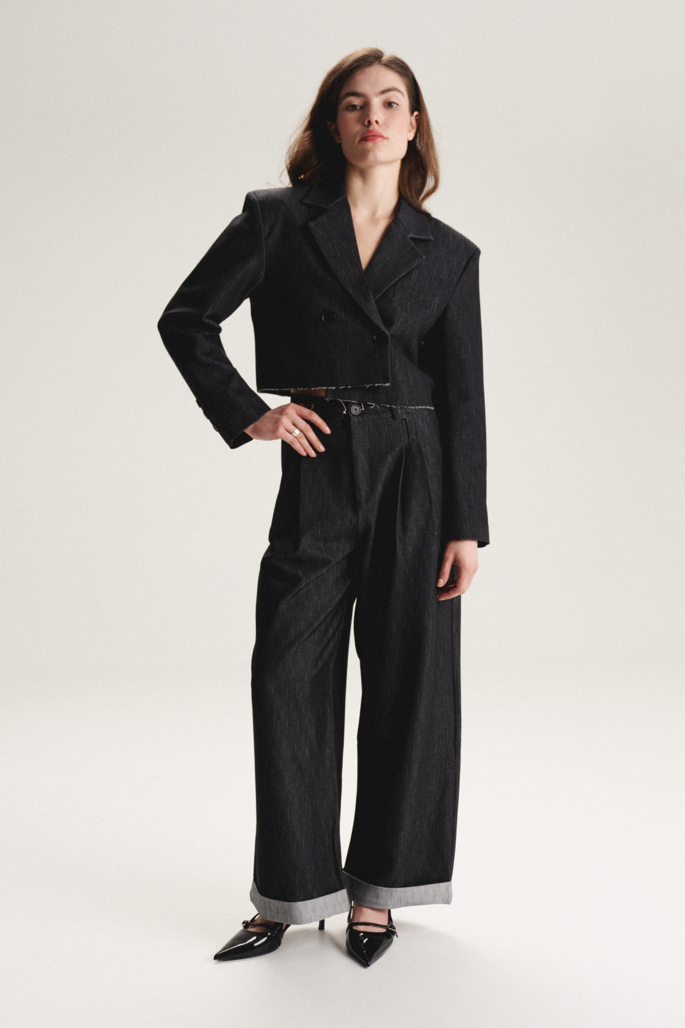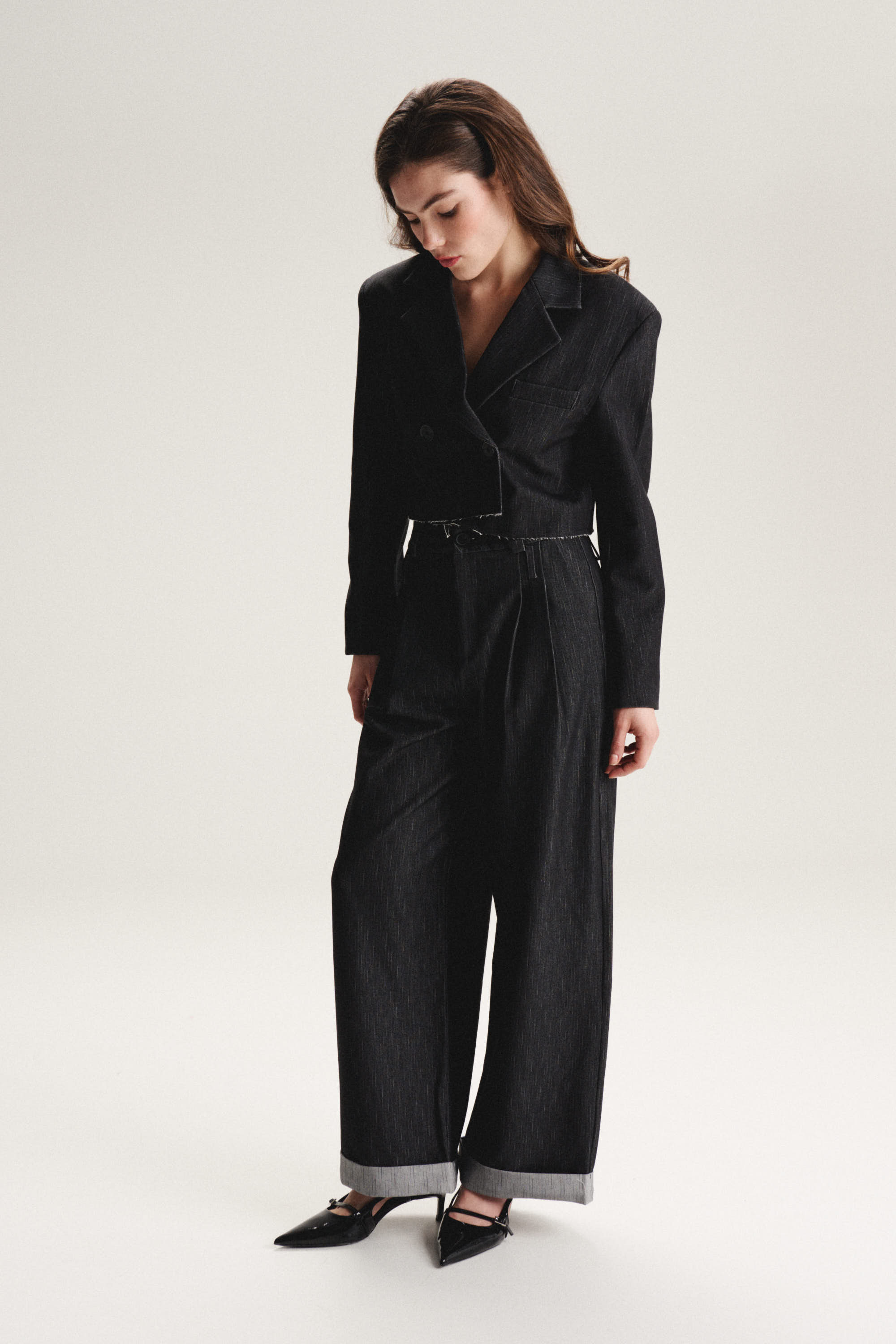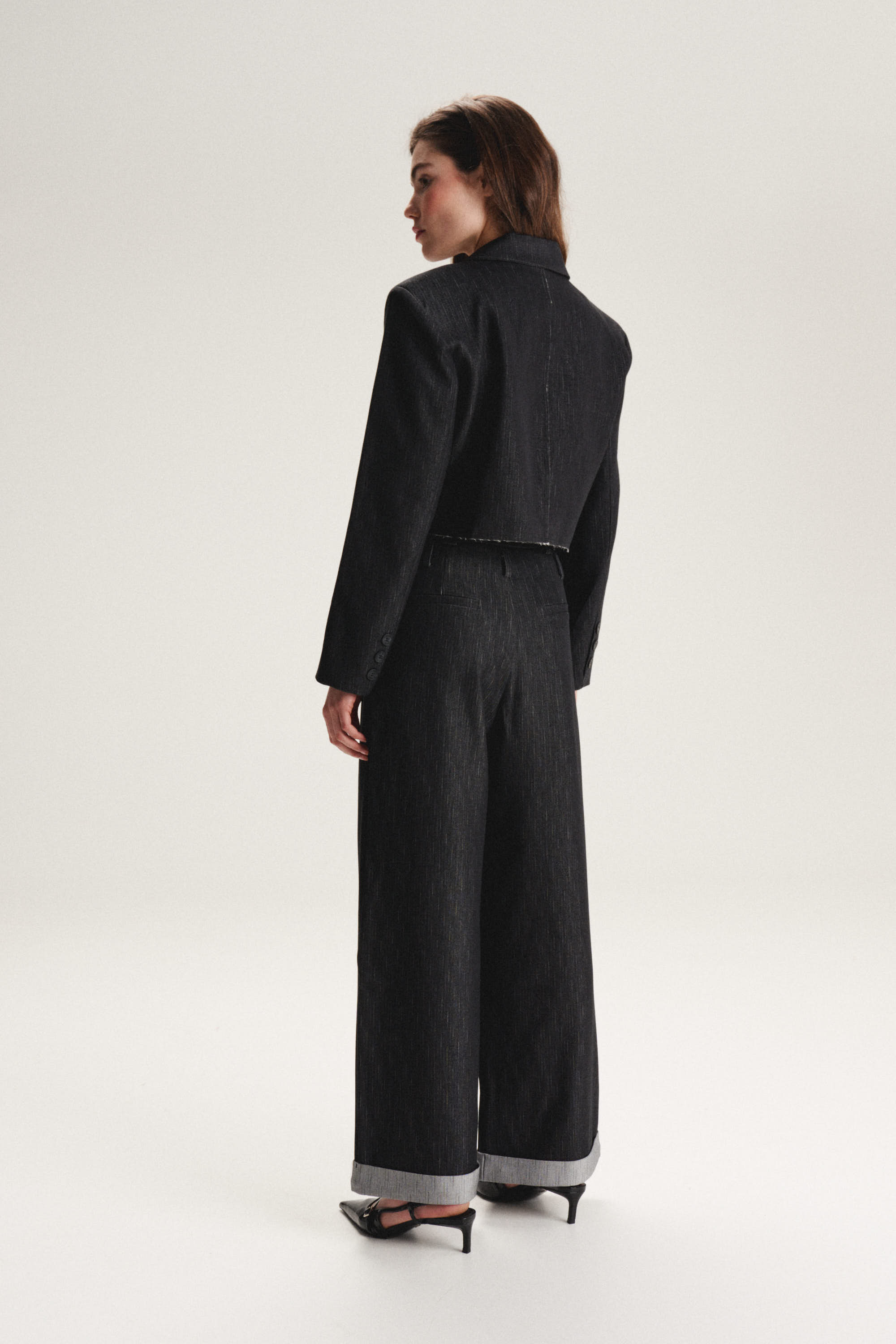 Укороченный жакет. В комплекте с брюками из аналогичной ткани создает оригинальный костюмный ансамбль.