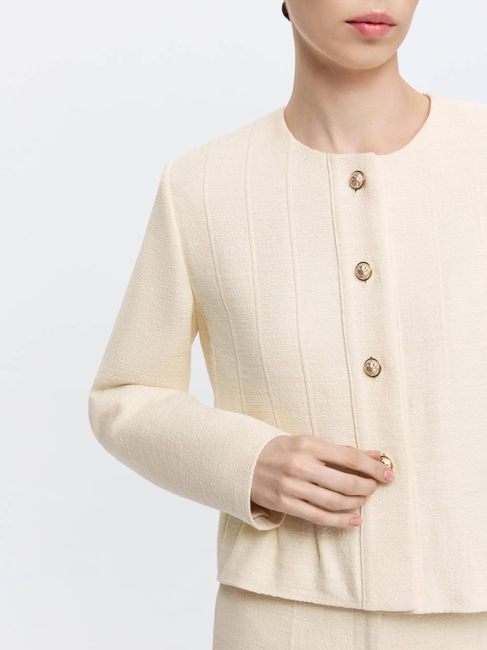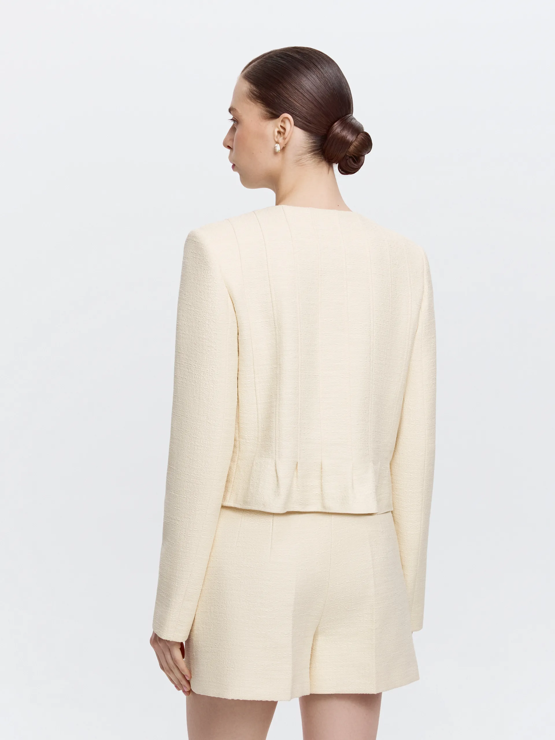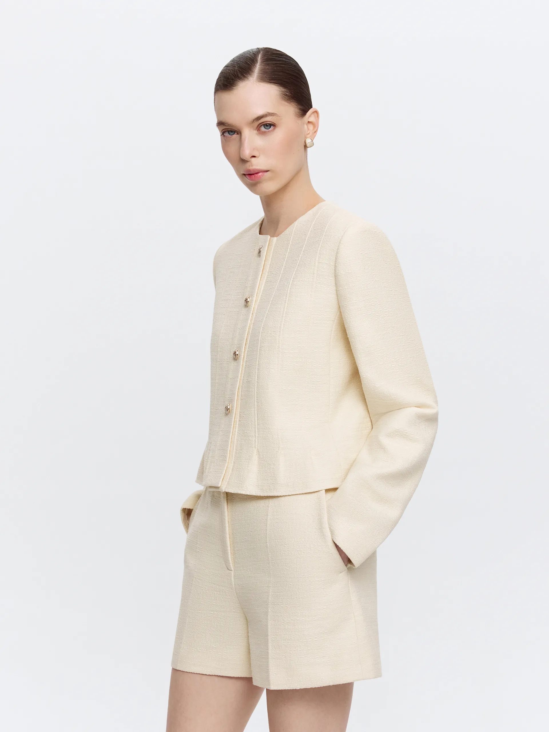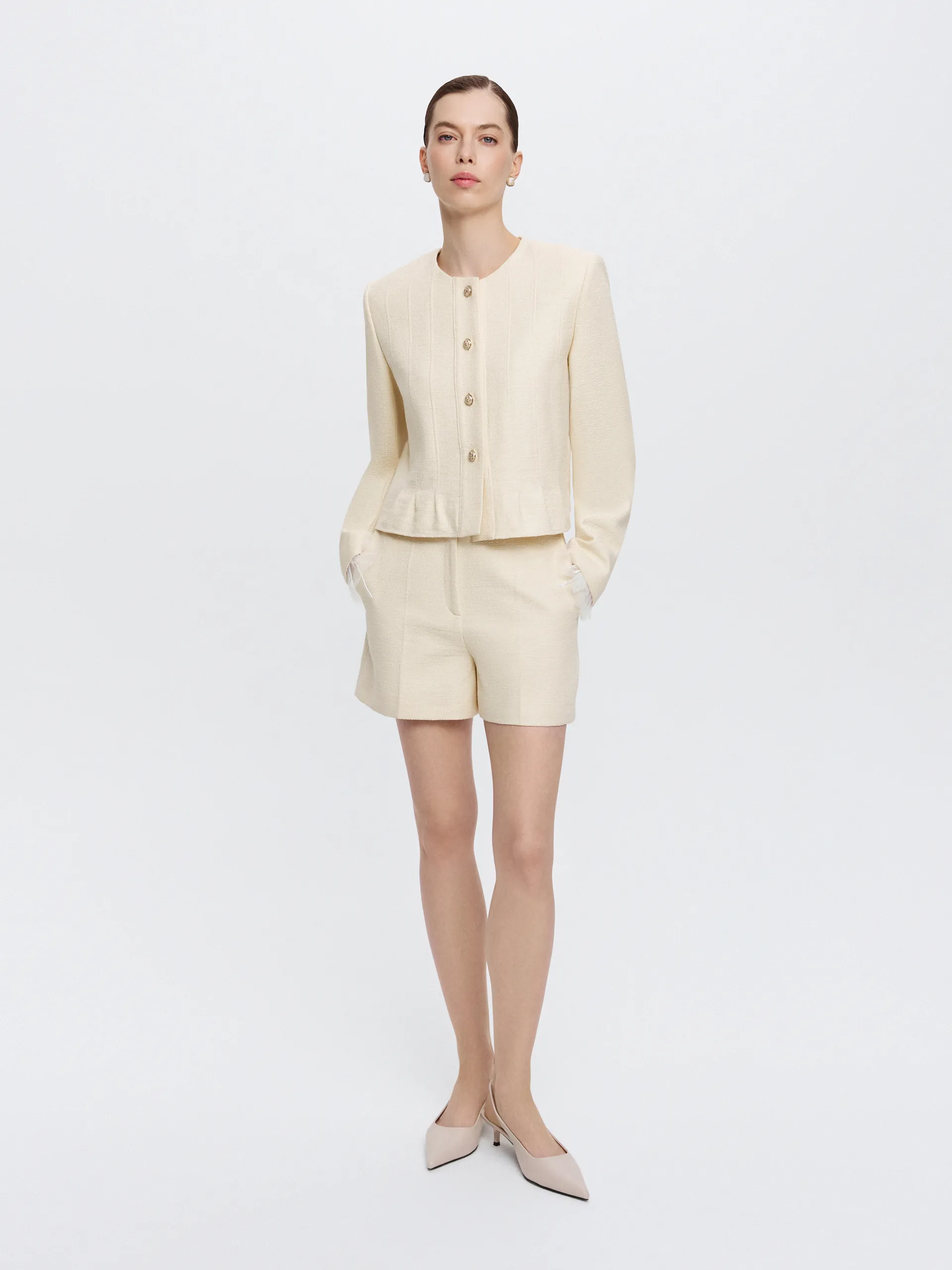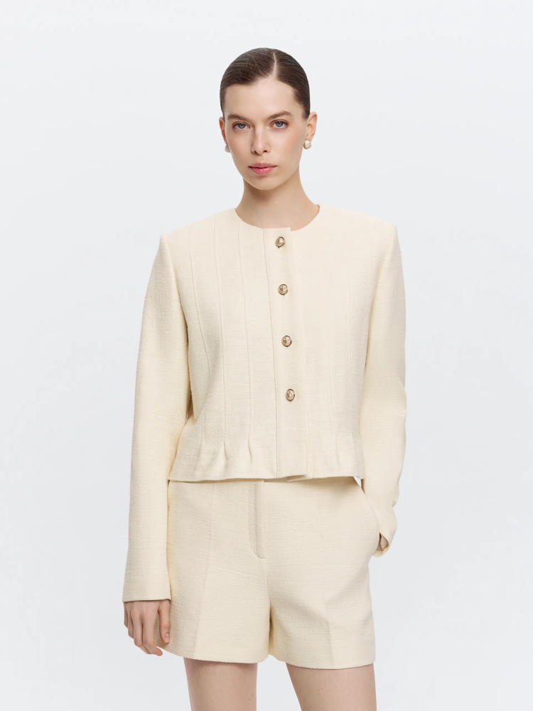 Укороченный жакет из жёлтого твида с круглым вырезом — выразительная модель с аккуратной архитектурой силуэта. Фактурная ткань держит форму и сохраняет чистоту линий, а небольшая баска по низу мягко подчёркивает талию и формирует собранный силуэт. Выверенный крой обеспечивает аккуратную посадку без излишнего прилегания. Жакет гармонично сочетается с шортами из той же ткани, создавая цельный комплект, и легко интегрируется в городской гардероб.