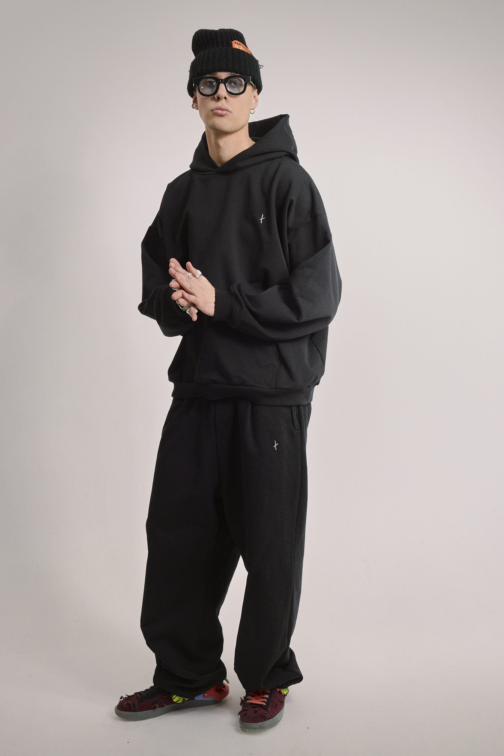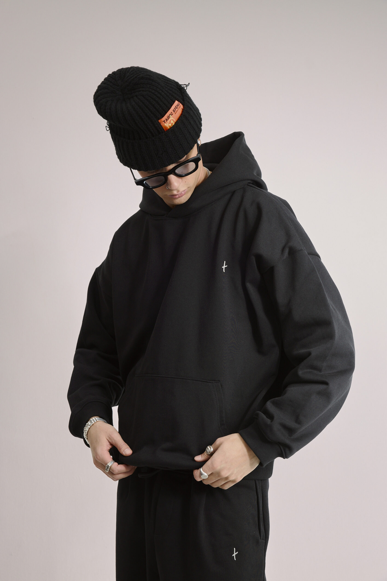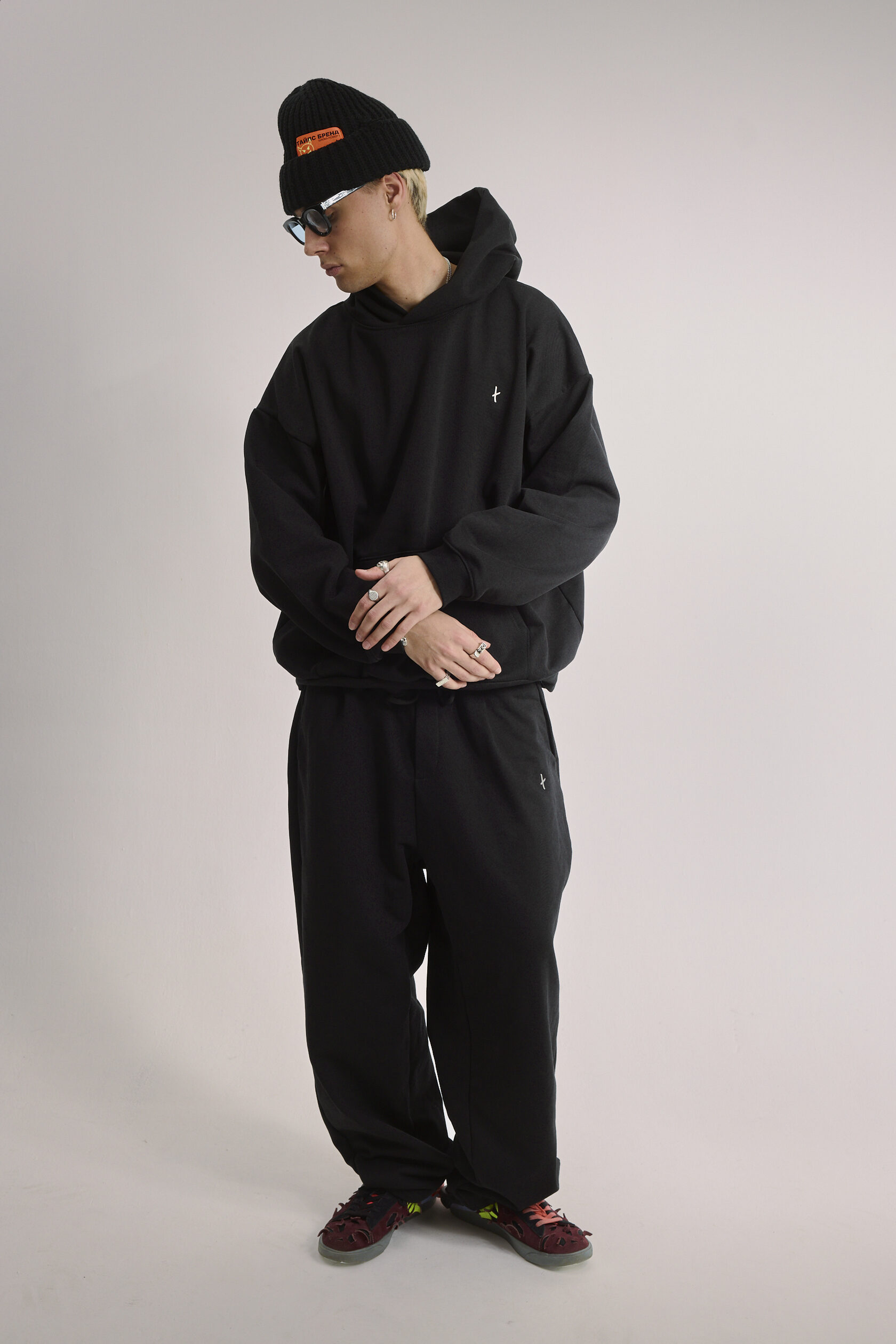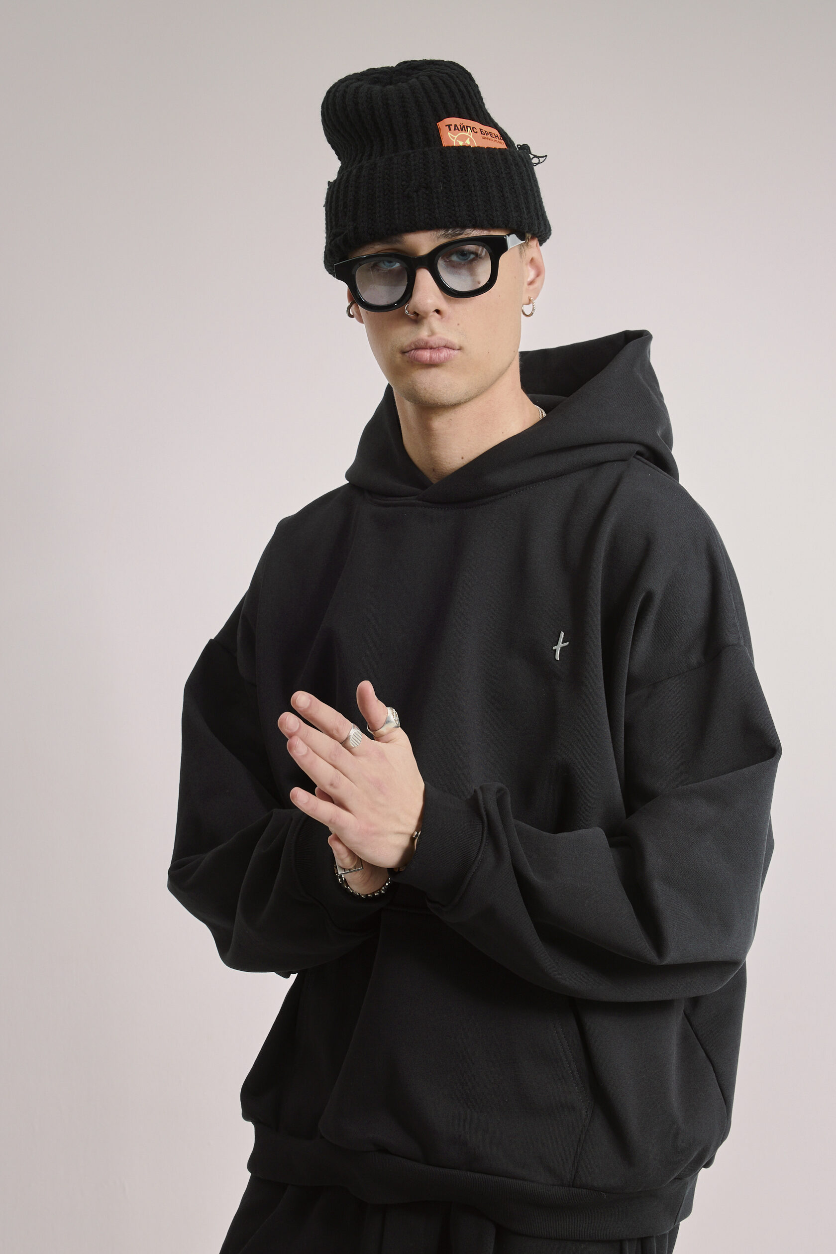 Худи чёрное оверсайз, дополнено металлическим логотипом-крестом на груди.
