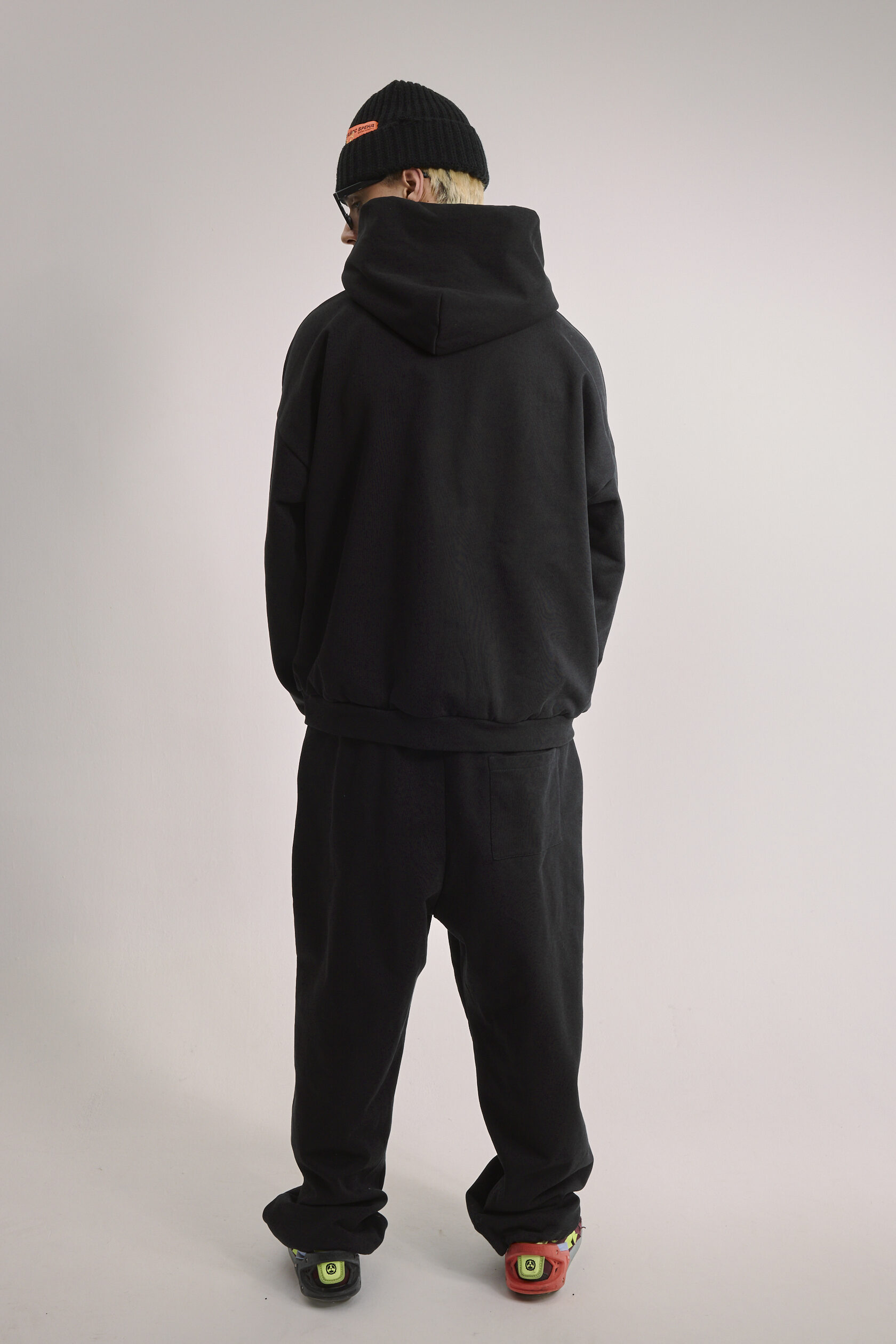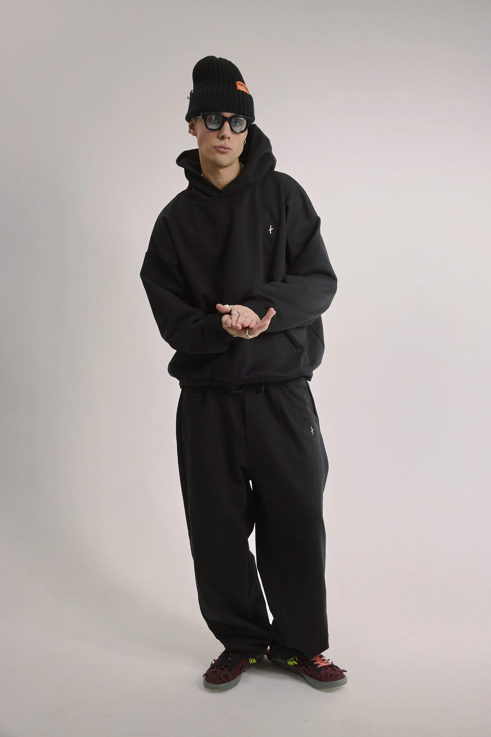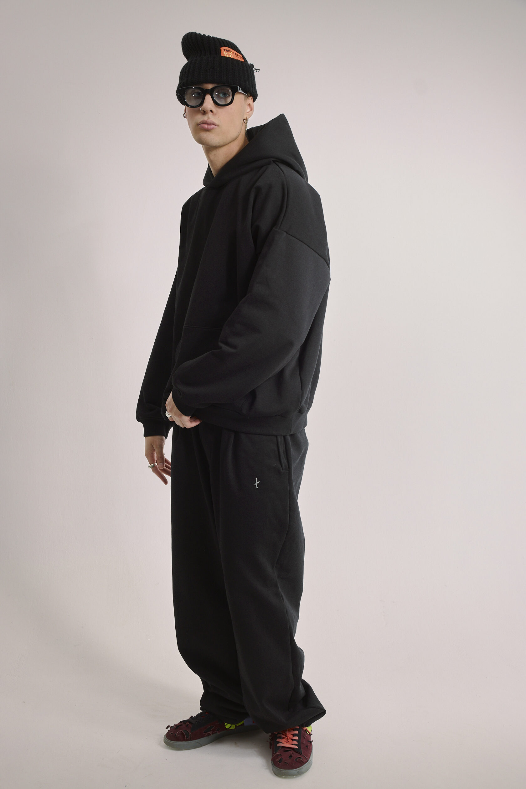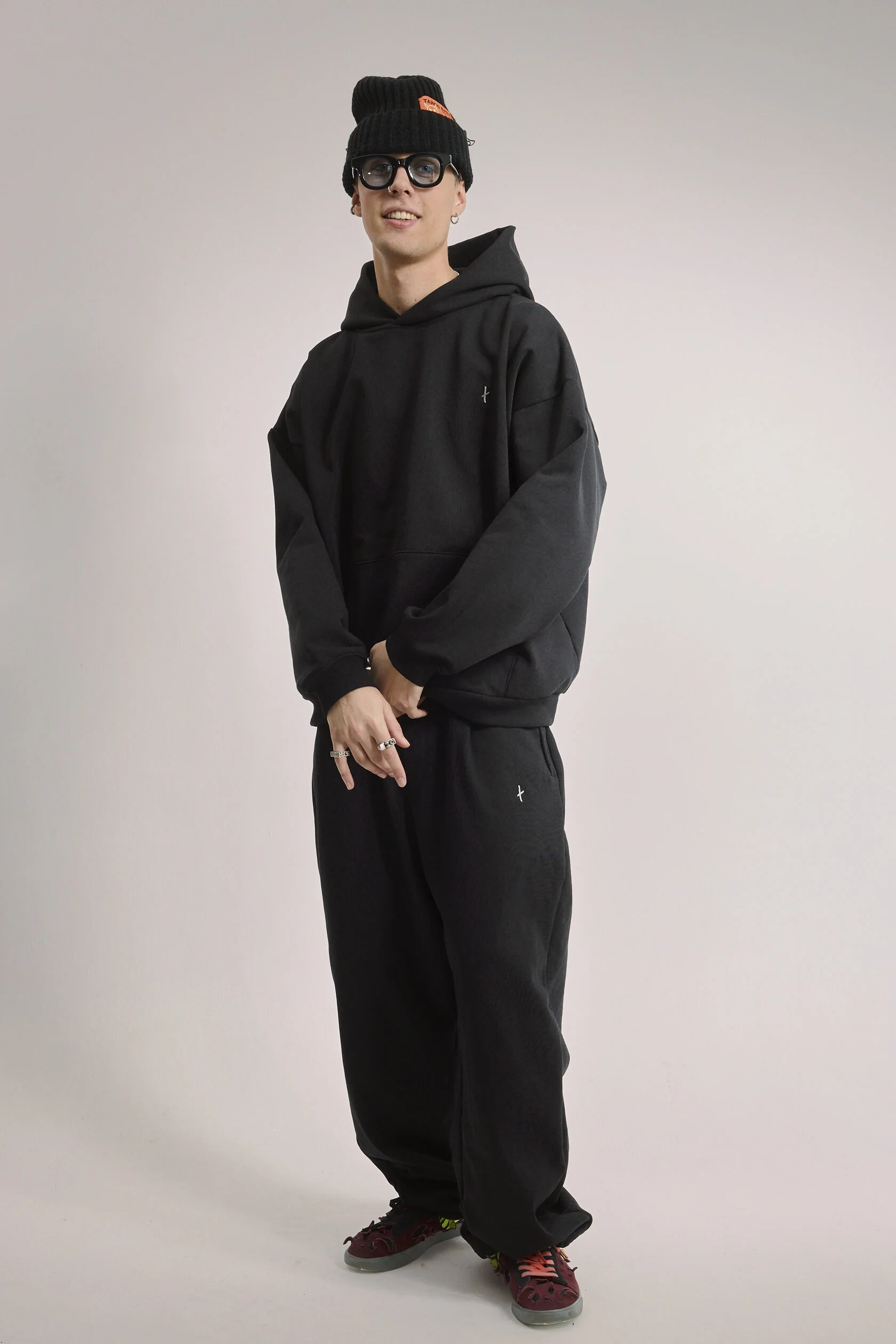 Худи чёрное оверсайз, дополнено металлическим логотипом-крестом на груди.