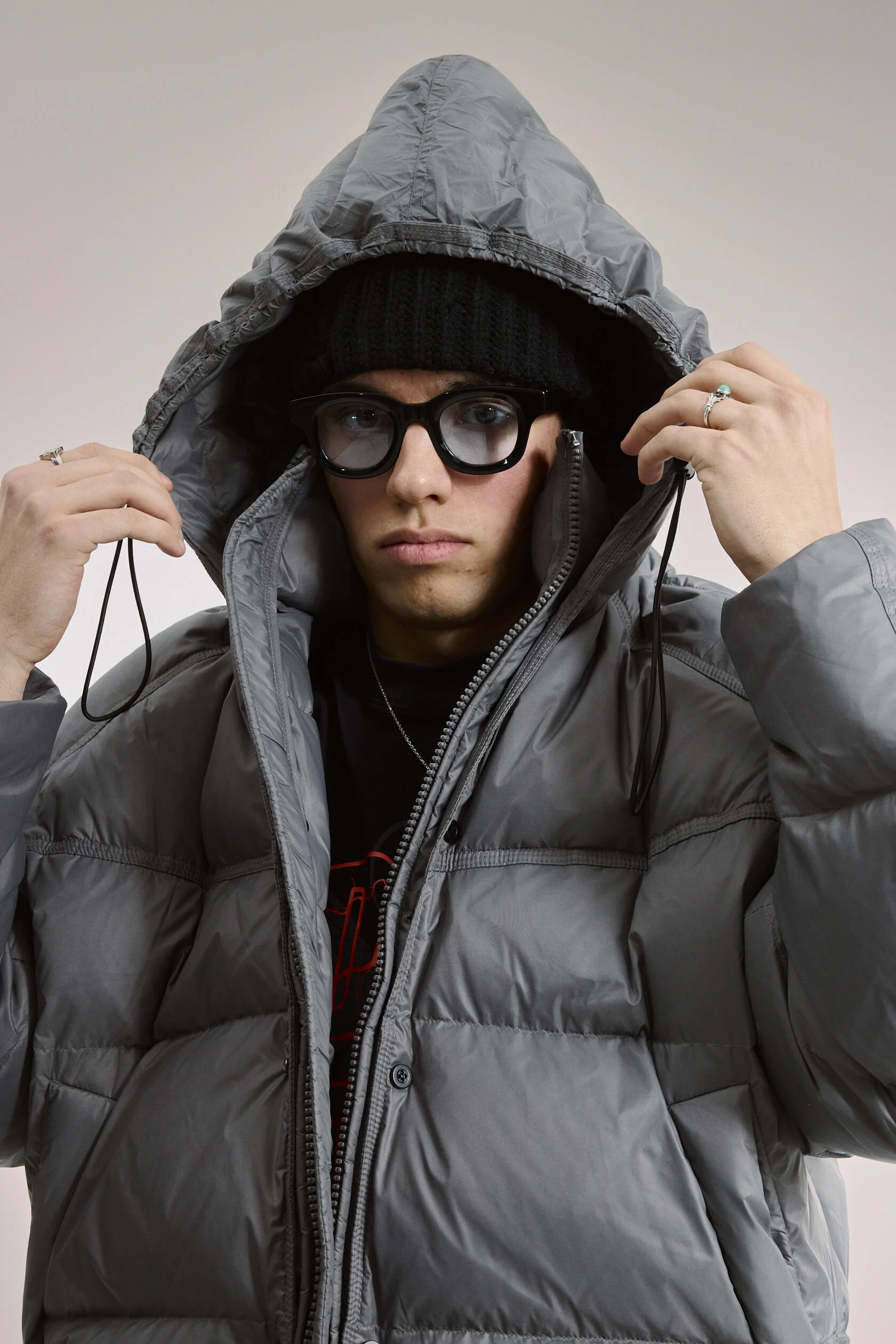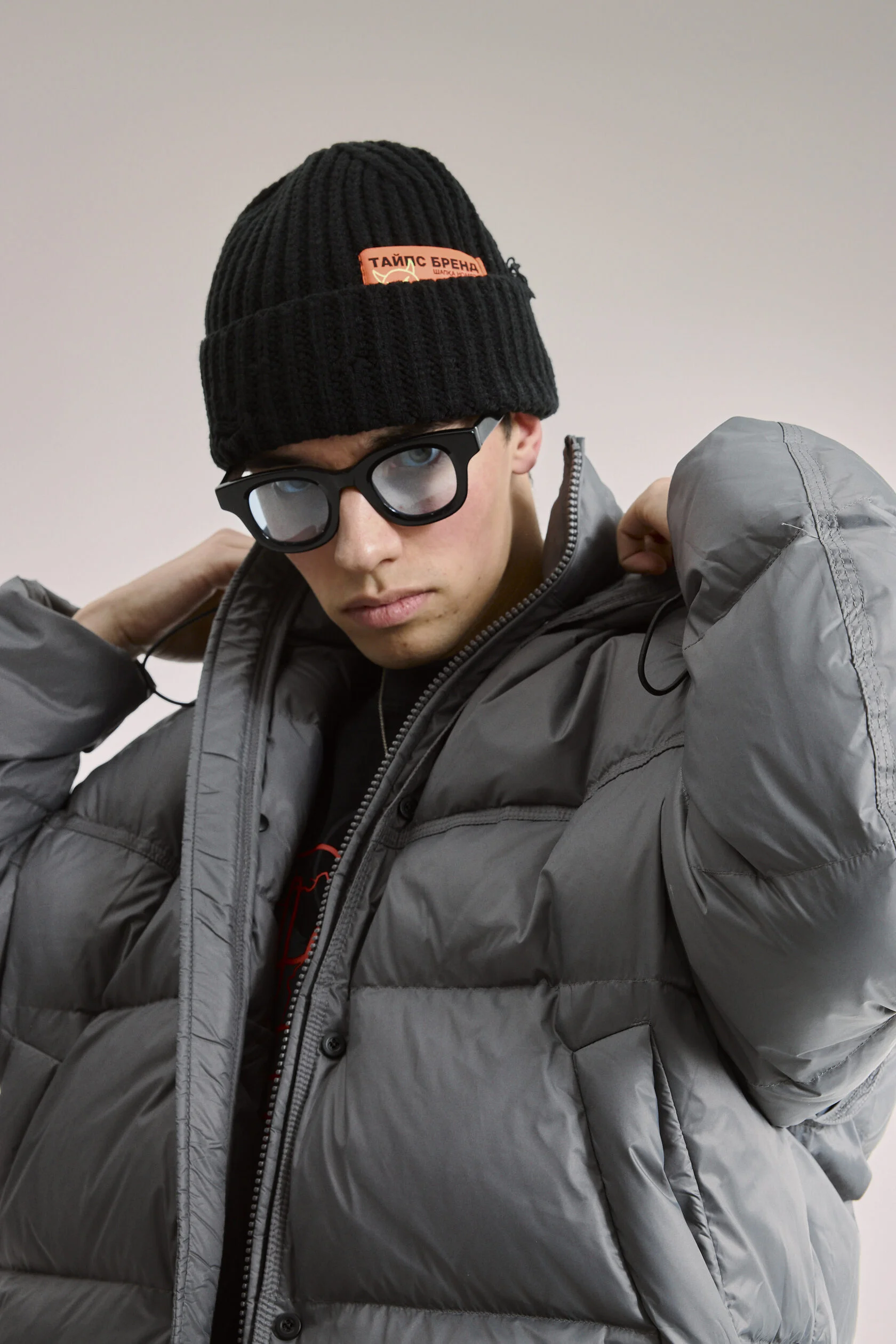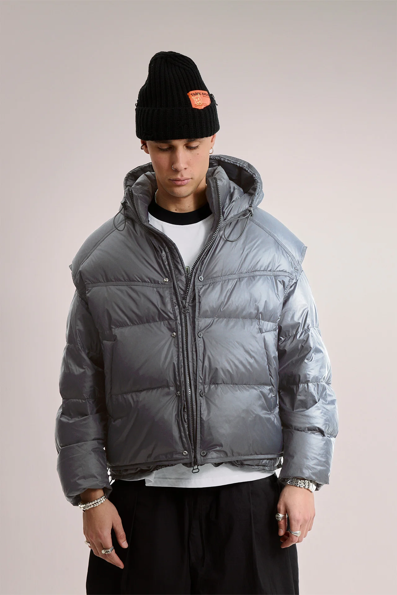 Куртка-пуховик серая, двухсоставная, с отделяющимся жилетом. Изделие состоит из куртки-основы, и съёмного жилета с капюшоном.