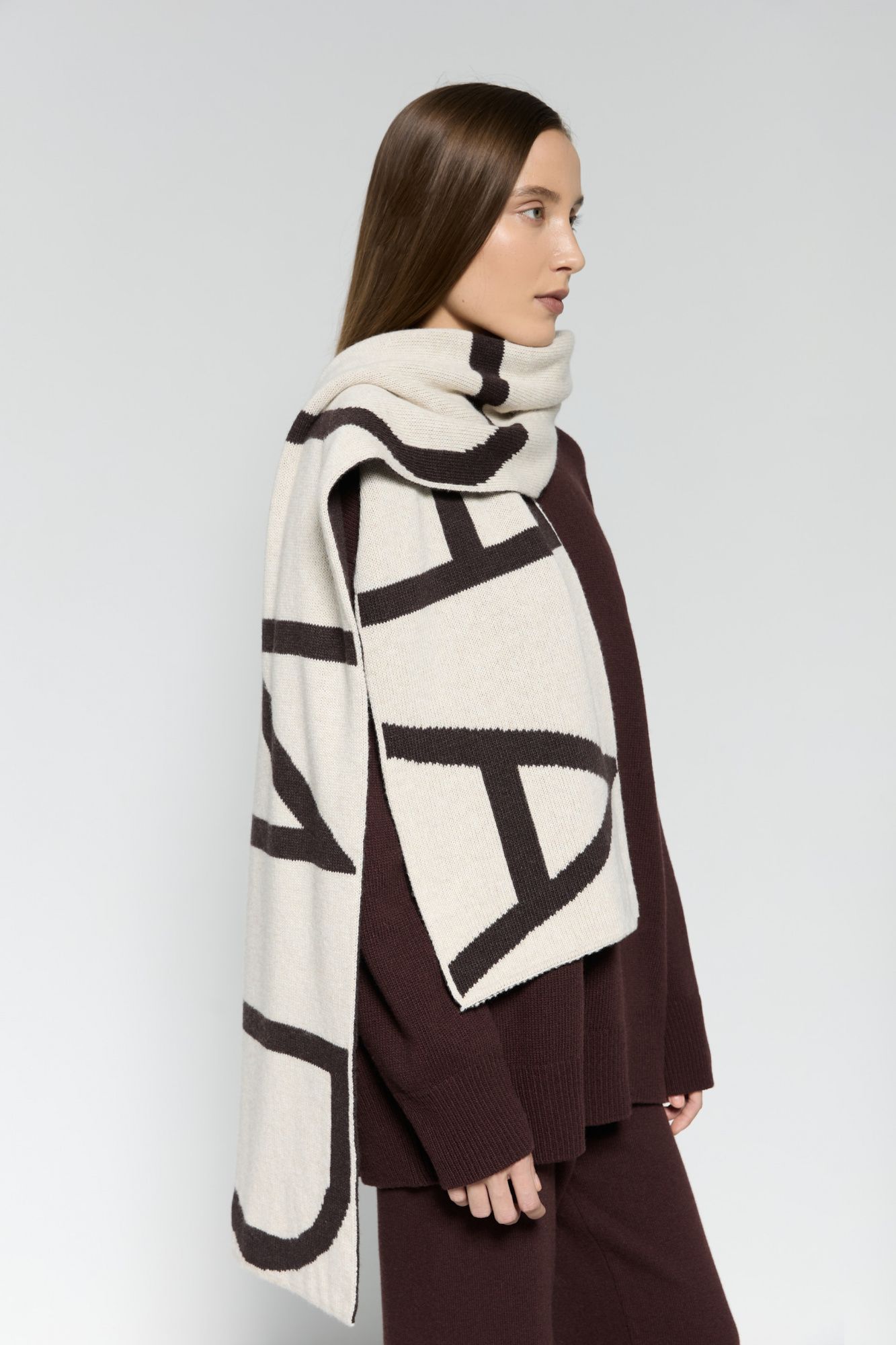 Двухслойный и двухцветный шарф с вывязанной с обеих сторон надписью AROUND во всю длину. Шарф связан из микса кашемира, шерсти мериноса и вискозы; нежной и комфортной к коже пряжи, сделанной в Италии.