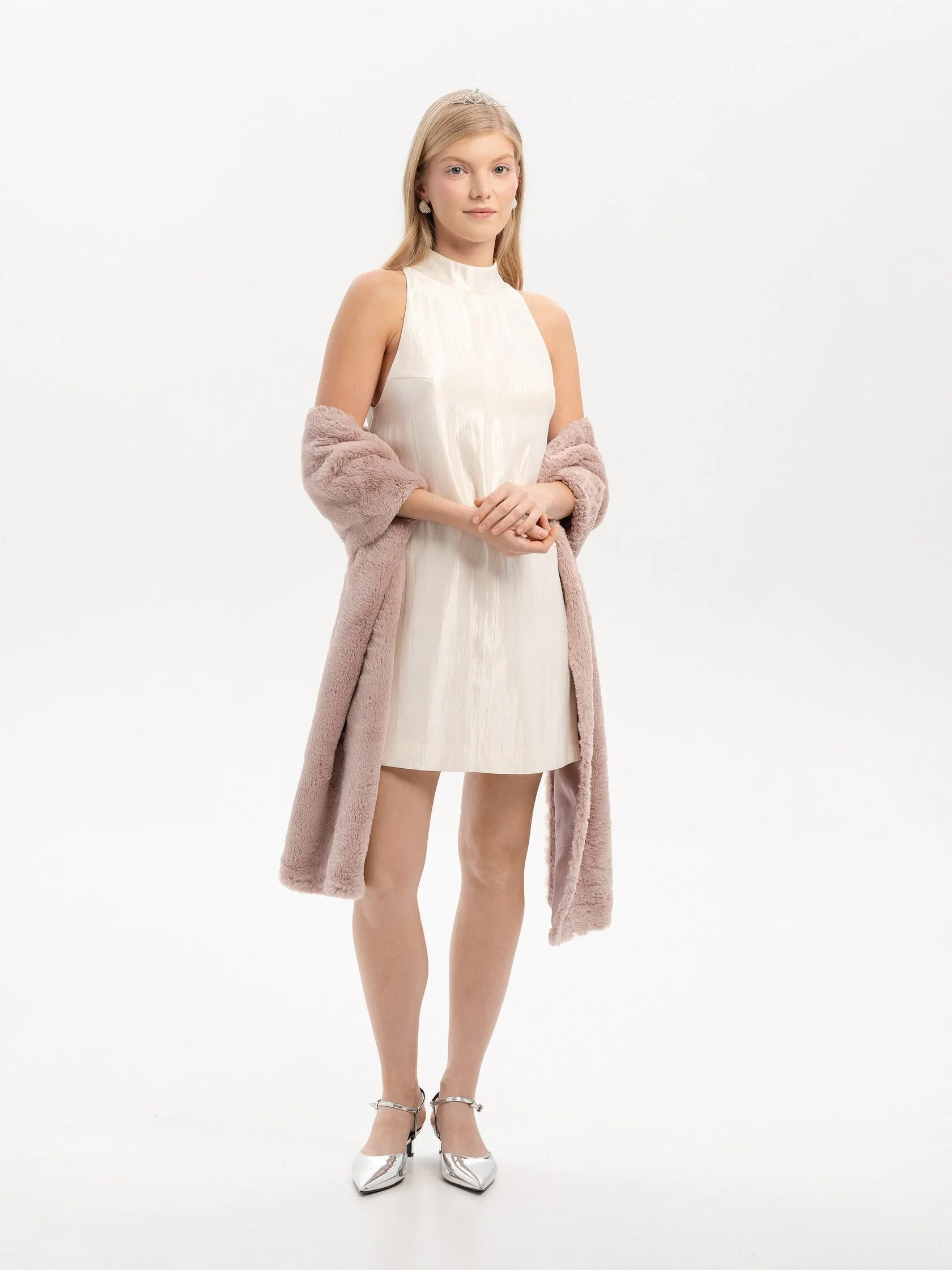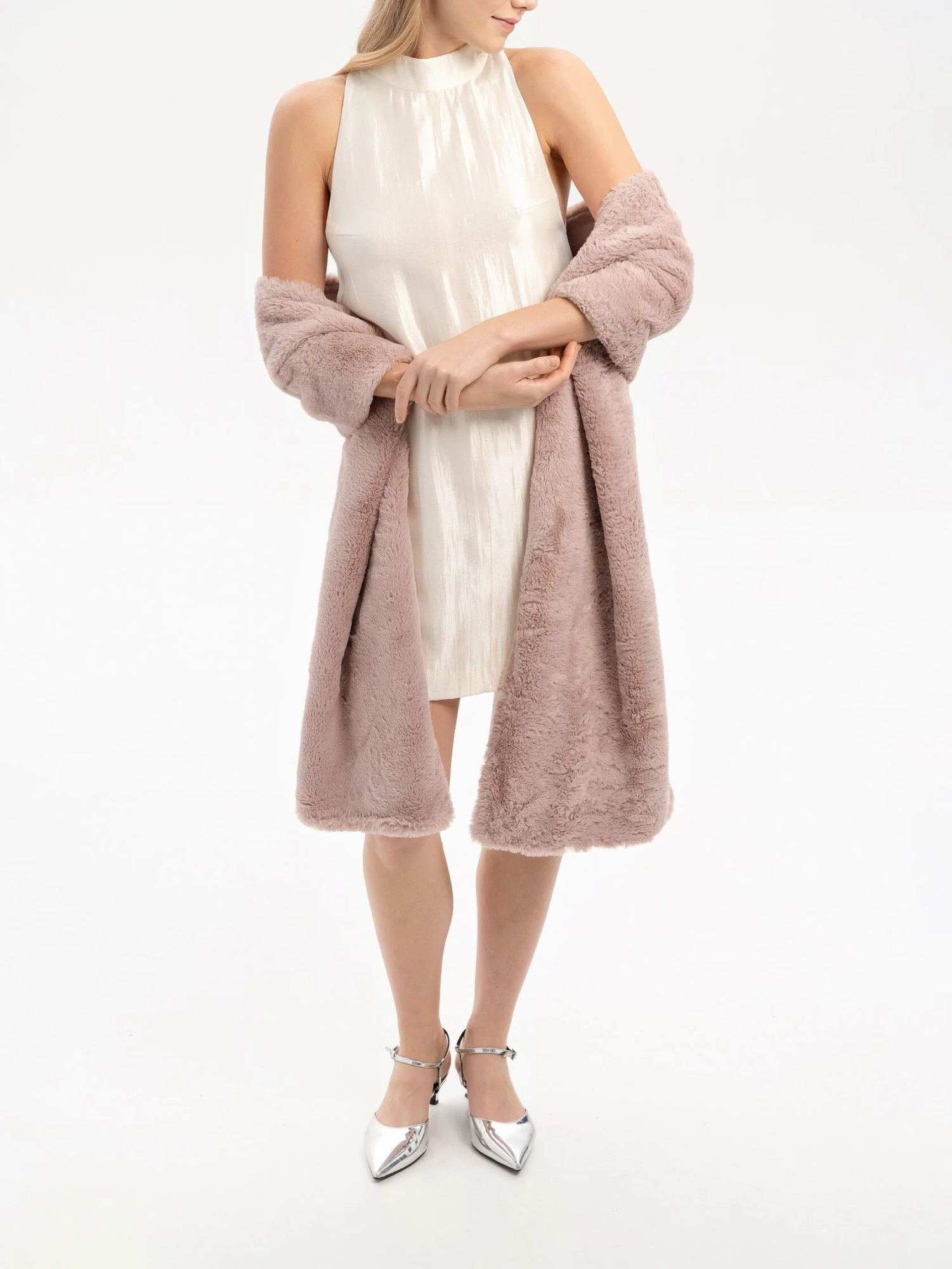 Пудровое манто из мягкого искусственного меха станет нежным акцентом в праздничном образе. Добавляет уют и балансирует наряд с открытыми плечами. Идеальный способ создать сложный многослойный комплект.