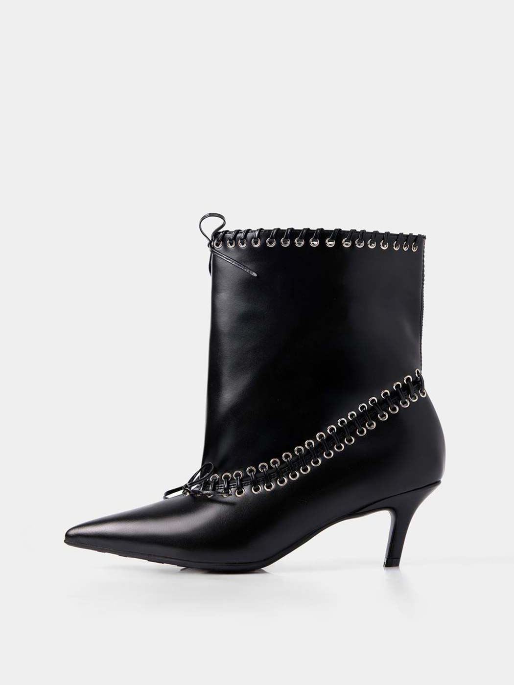 Черные ботильоны со свободным голенищем выполнены из микрофибры – высокопрочного заменителя натуральной кожи на основе микроволокон. Ботильоны декорированы люверсами и шнуровкой.