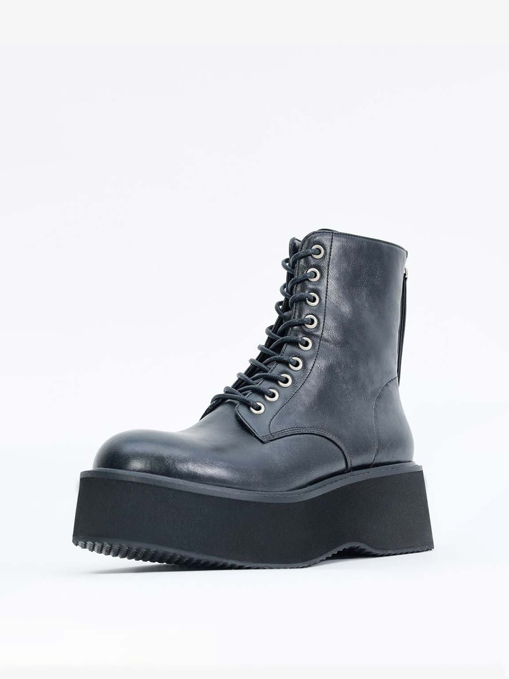 Высокие ботинки из экокожи – модель черного цвета. Ботинки дополнены массивной платформой, шнуровкой и застежкой-молнией.