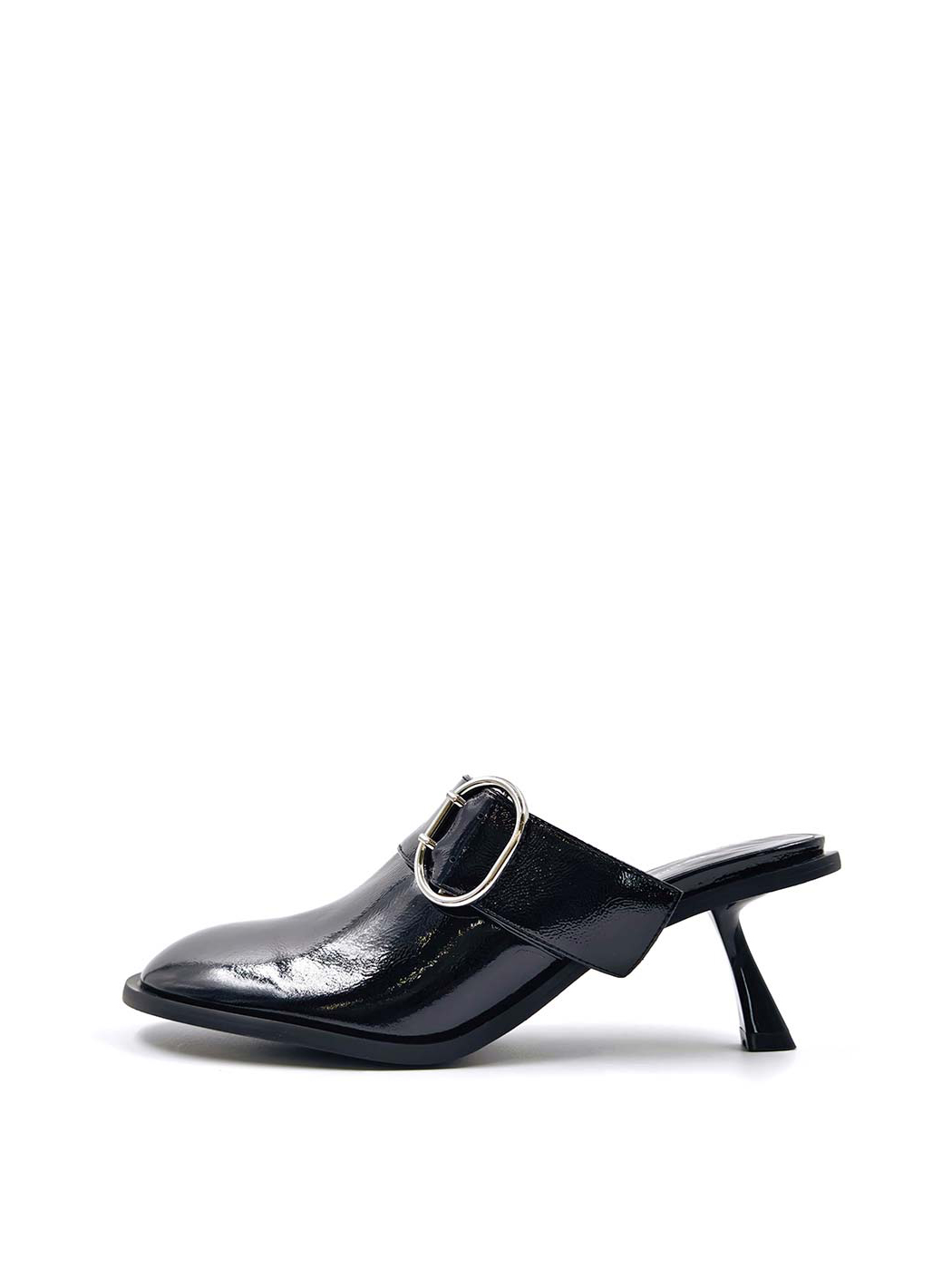 Мюли из лакированной натуральной кожи с каблуком-рюмочкой и закругленным носком.