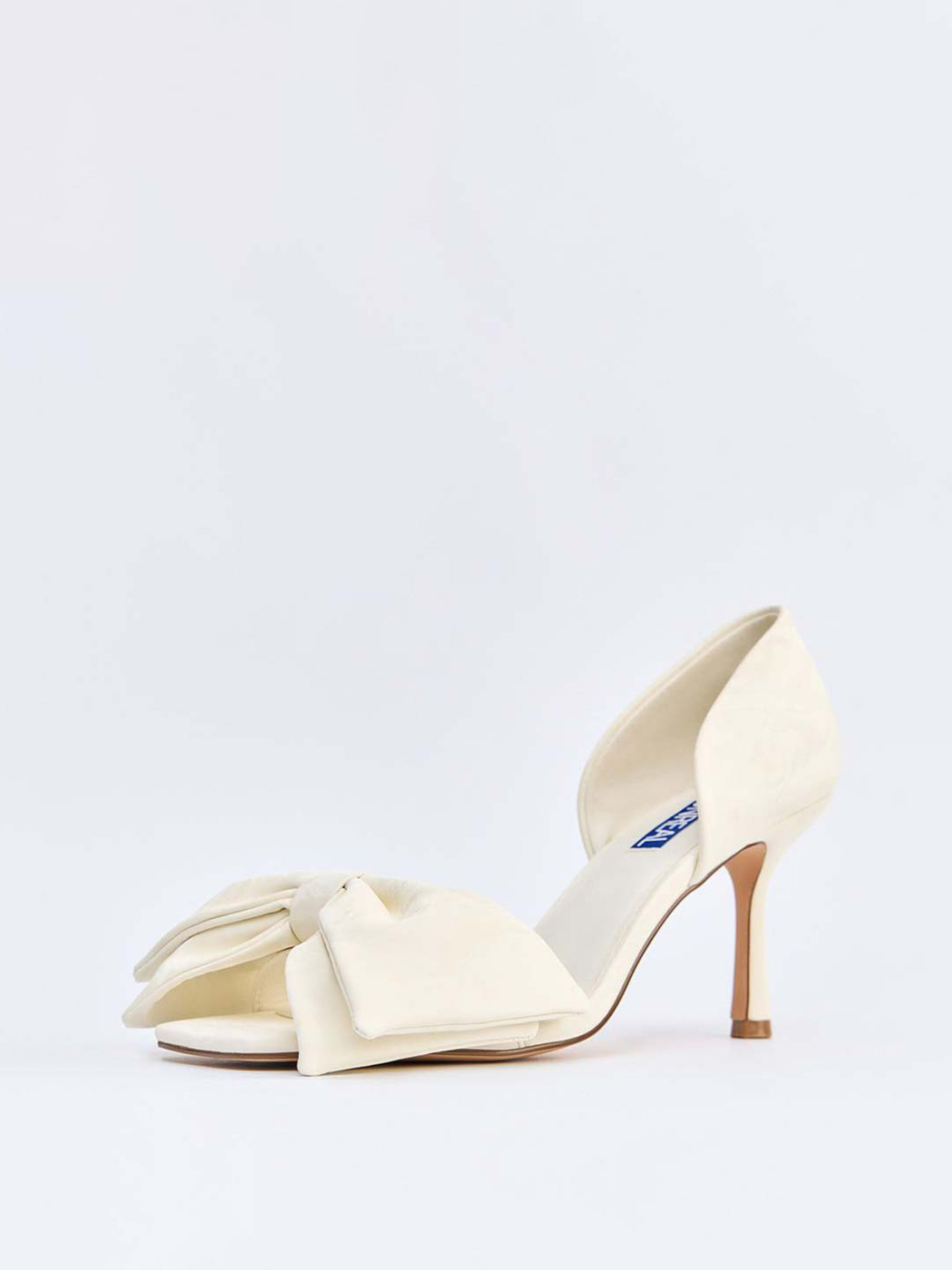 Молочные туфли из экокожи – модель с открытым мысом на высоком каблуке. Туфли декорированы абстрактным принтом и бантом.