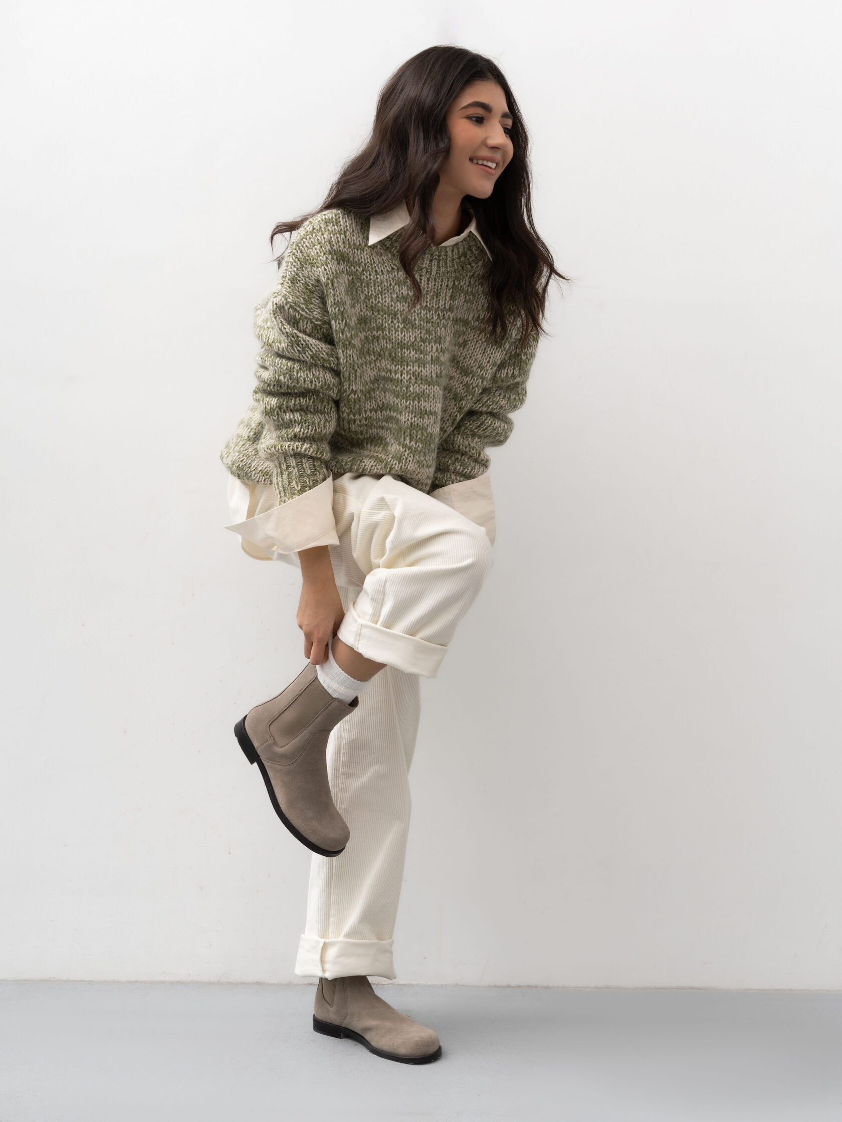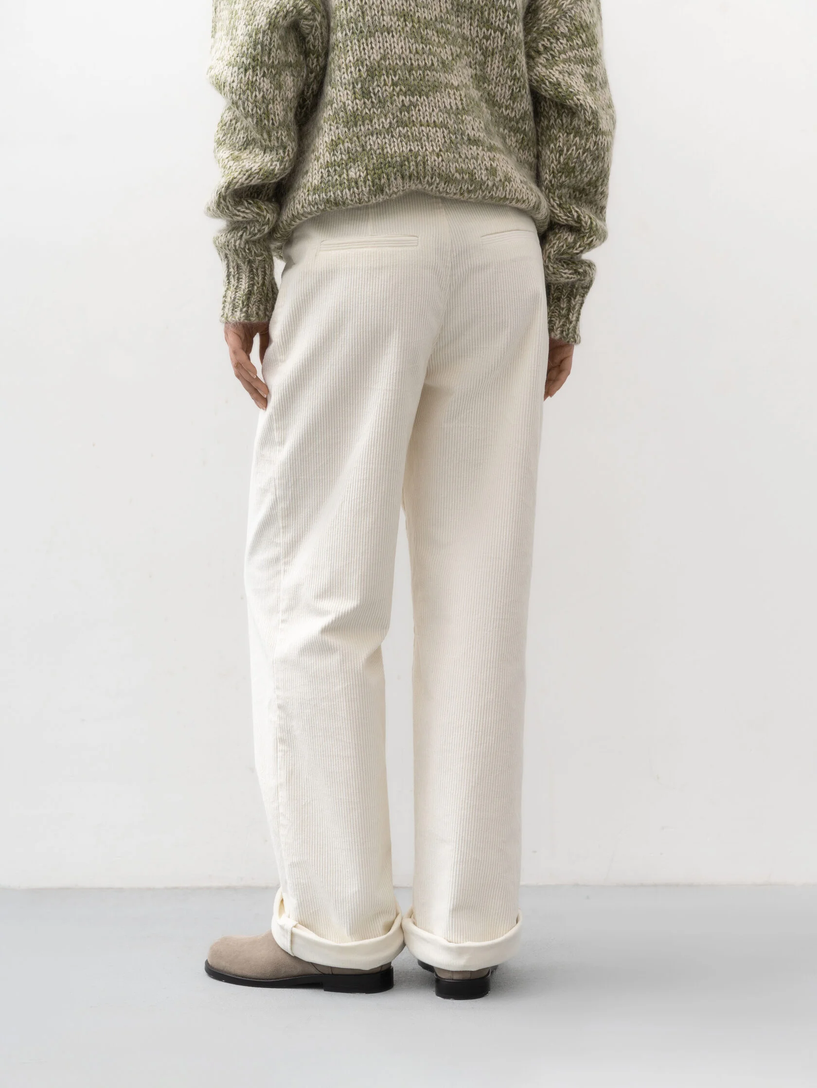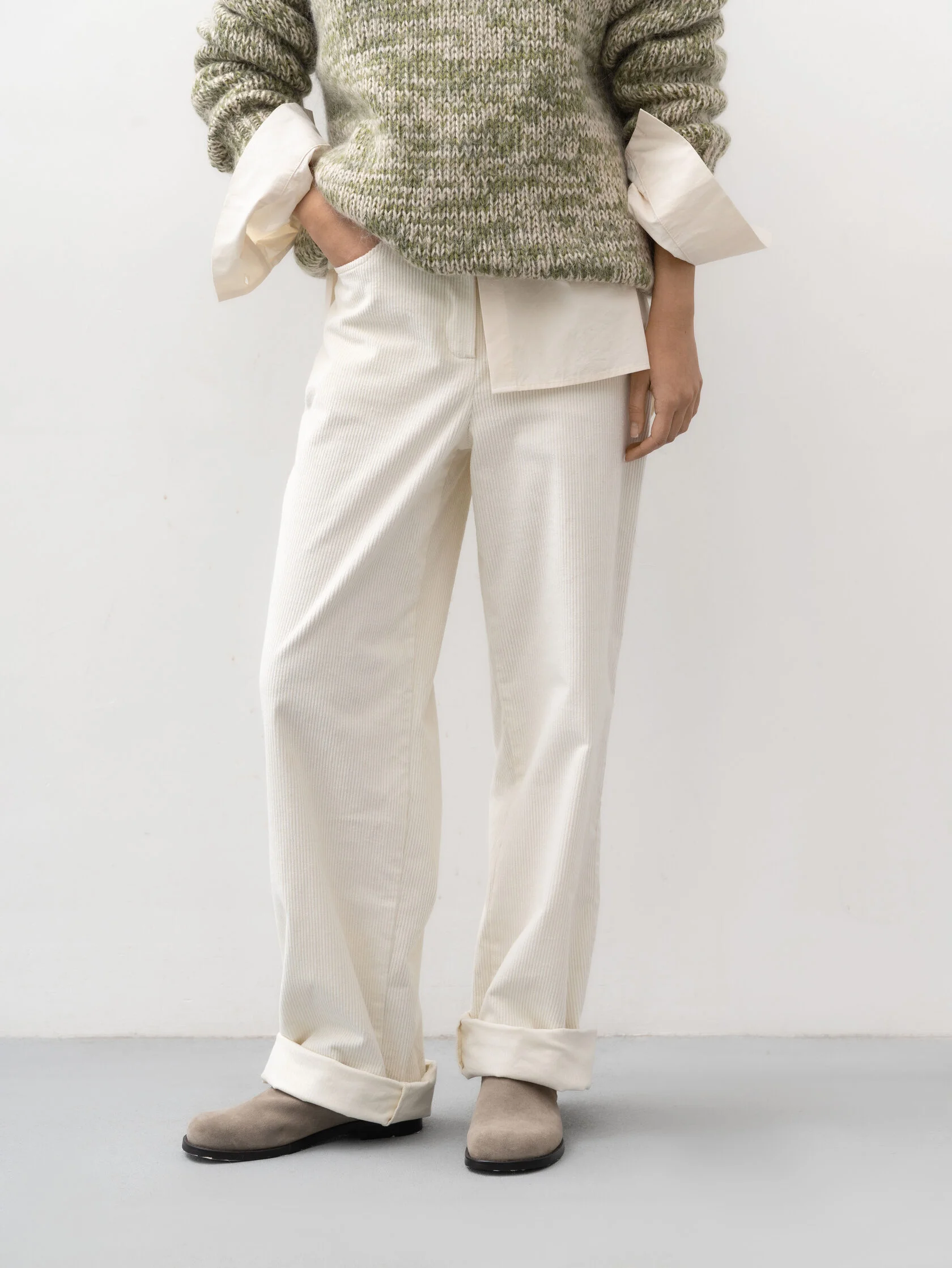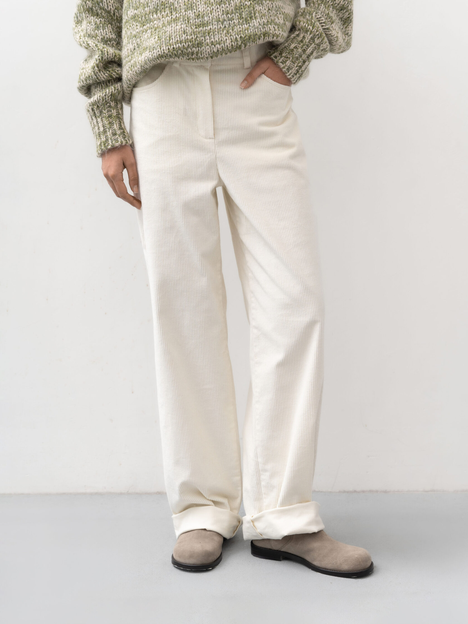 Молочные вельветовые брюки — элегантная основа для светлых и утончённых зимних образов. Плотный хлопковый вельвет с добавлением лайкры мягко садится по фигуре, обеспечивая комфорт и свободу движений. Сочетайте их с пастельными свитерами, трикотажем или пальто в тёплых тонах, чтобы создать спокойный и гармоничный сезонный образ.