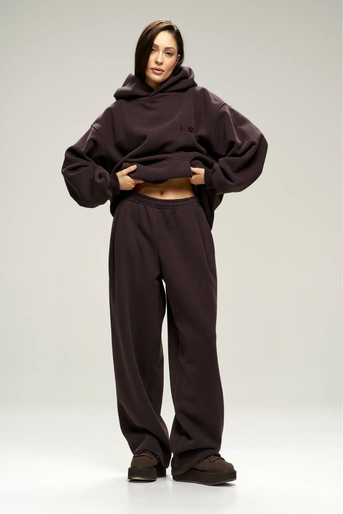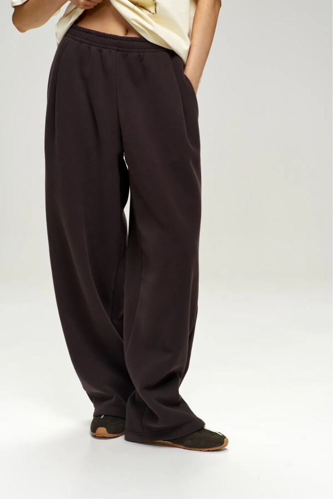 Брюки с начесом в стиле "гипер оверсайз". Широкие снизу штанины и защипы спереди создают дополнительный объём и широкую форму, а начёс внутри сохраняет тепло. Карманы добавляют удобства, сохраняя стиль. Носите в комплекте с худи из новой коллекции ERIST